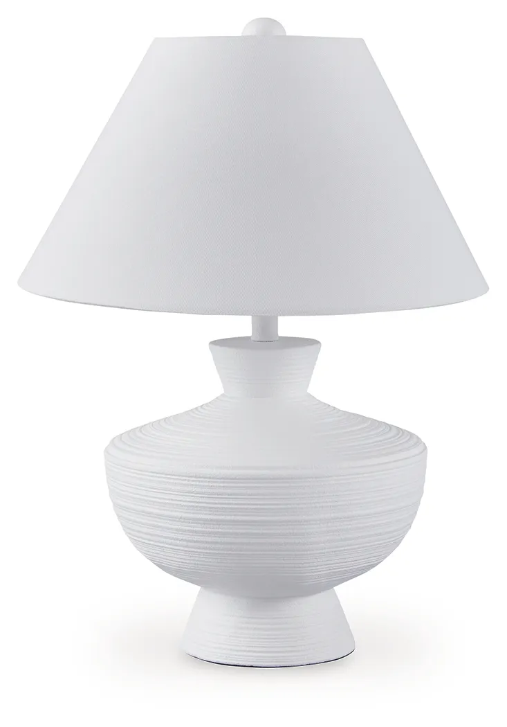 Cool, clean and contemporary. This table lamp's sculptural base is a forward-thinking approach to fashionable function. Complete with a crisp white finish and horizontal stripe details, the piece is a striking addition to a sofa-side or entryway table.