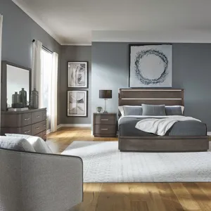 Elevate your bedroom decor to new heights of sophistication and comfort with the Cascade Falls king panel bed, dresser, mirror, and chest. Crafted with excellence using Rubberwood solids and Split Heart White Oak veneers, this set features a Satin Espresso finish. One of the standout features of this set is the touch LED lighting system in the headboard, which creates a captivating ambiance with soft, gentle illumination. Light strips embedded within the reveal sections of the headboard cast a beautiful glow, adding depth and dimension to your bedroom space. Whether you're winding down with a book or simply relaxing, the subtle lighting creates a serene atmosphere for you to unwind in style. The pilasters of this set, elegantly rounded for a soft appeal, enhance the aesthetic appeal and contribute to its overall sense of refinement. These thoughtful details add a touch of sophistication to your bedroom decor, elevating the space with their understated elegance. The bow shaping of the dresser and chest adds a touch of soft contemporary flair, infusing these pieces with graceful curves and understated charm. Atop the dresser and chest, a stunning starburst veneer pattern steals the spotlight, adding visual interest and sophistication. This intricate detail showcases impeccable craftsmanship and attention to detail, making it a focal point of any room. Adding to its architectural appeal, reveal sections on the front and sides offer glimpses of the finished frame, creating dimension and interest. Designed for both style and functionality, the dresser and chest features soft-closing drawer guides for a gentle touch, ensuring smooth and quiet operation. The top drawers are lined with premium felt to protect delicate items, while the bottom drawers feature a cedar panel to keep your clothes fresh and fragrant. The drawers are accented with a custom Satin Nickel bar pull hardware. The over-scaled design of the mirror commands attention, instantly drawing the eye and adding drama to your decor. Rounded pilasters adorn the sides of the mirror, adding a soft touch and creating visual interest. These pilasters tie in seamlessly with the bow shaping of Cascade Falls, ensuring a cohesive and harmonious look throughout your space. A one-inch beveled edge surrounds the mirror, adding a touch of sparkle and refinement. This beveled edge catches the light beautifully, enhancing the mirror's reflective qualities and adding depth to your room. Attach the mirror to the Cascade Falls 9 drawer dresser with the included bolt on supports. With its combination of innovative features and timeless design elements, the Cascade Falls king panel bed, dresser, mirror, and chest is the perfect centerpiece for your bedroom sanctuary. Transform your sleeping space into a haven of comfort and style with the exquisite Cascade Falls king panel bed, dresser, mirror, and chest.