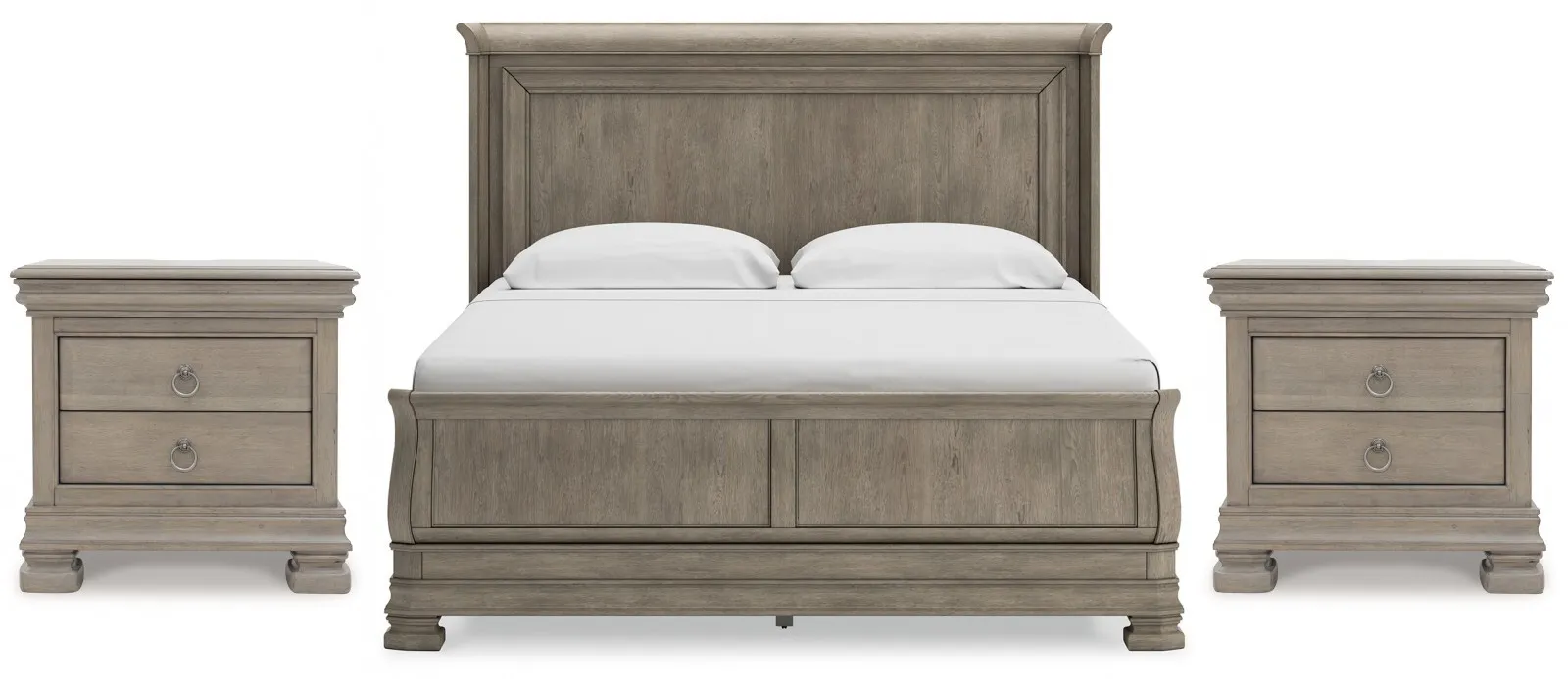 Lexorne Sleigh Bed (B924B4): 85.5 x86.5 x62 - Traditional design motifs, redefined for today’s trends. Inspired by timeless Louis Philippe styling, this king sleigh bed is distinguished by its stunning attention to detail. You’ll find the light gray finish encourages an attitude of laid-back luxury. Complete with a shelter wing headboard design and a thick profiled base, it reigns over your bedroom with an air of casual elegance. Includes panel headboard and sleigh footboard with rails, Made with hardwood solids, birch veneer and MDF substrate, Light gray finish enhances the natural wood grain, Foundation/box spring required, sold separately, Mattress available, sold separately
