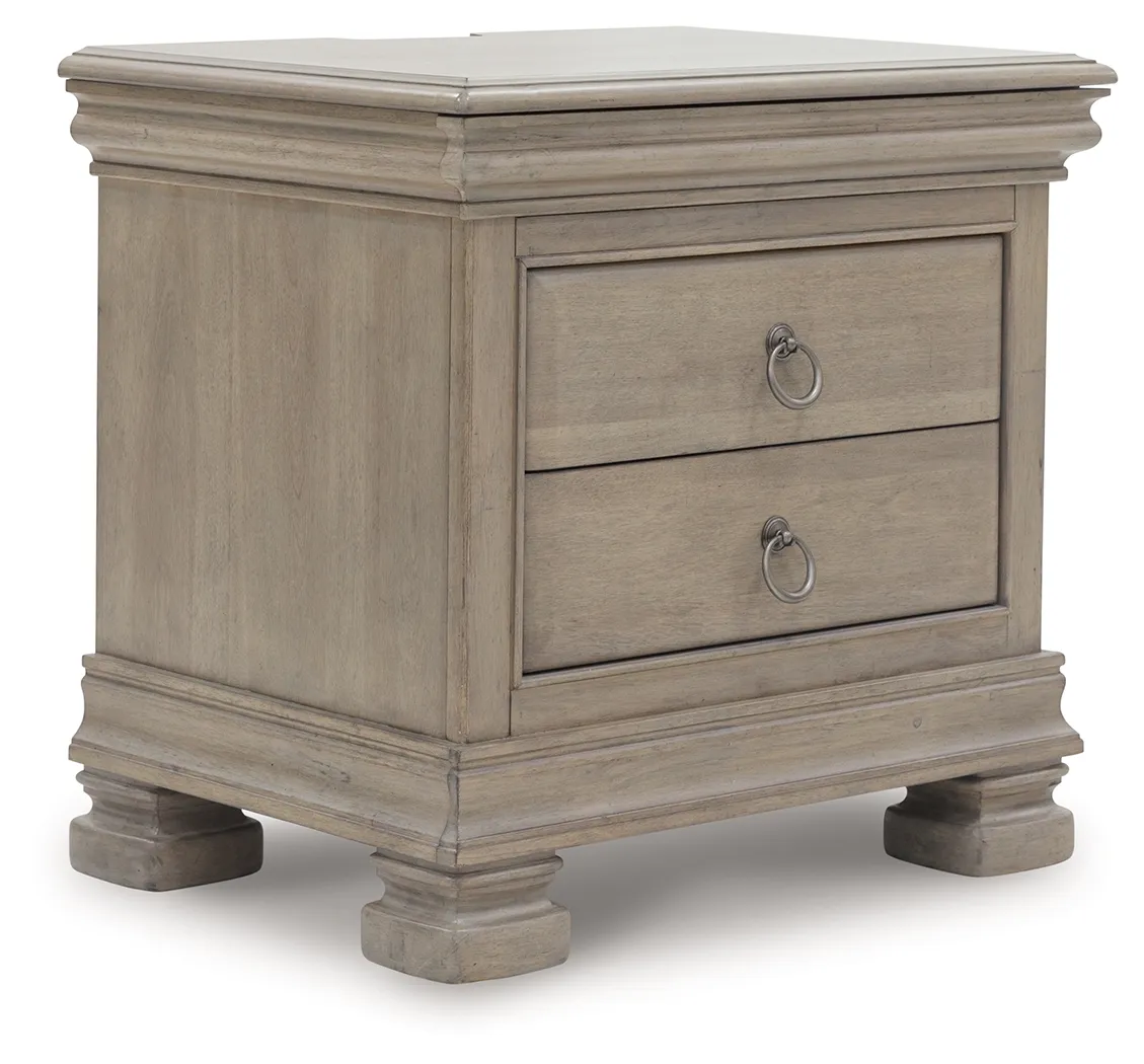 Lexorne Nightstand x2 (B924-93): 28 x 20.63 x 26 - Traditional design motifs, redefined for today’s trends. Inspired by timeless Louis Philippe styling, this nightstand is distinguished by its stunning attention to detail. You’ll find the light gray finish encourages an attitude of laid-back luxury. Complete with a power outlet and USB charging, it reigns over your bedroom with an air of casual elegance. Made with hardwood solids, birch veneer and MDF substrate, Light gray finish enhances the natural wood grain, Ring pull hardware, 3 drawers with fully finished interiors, dovetail construction and ball-bearing side glides, Small accessory drawer conveniently located in the upper valance, 110V power supply with dual USB charging ports,Power cord included; UL Listed