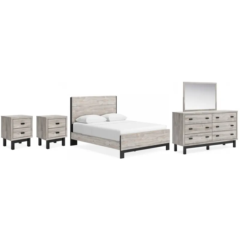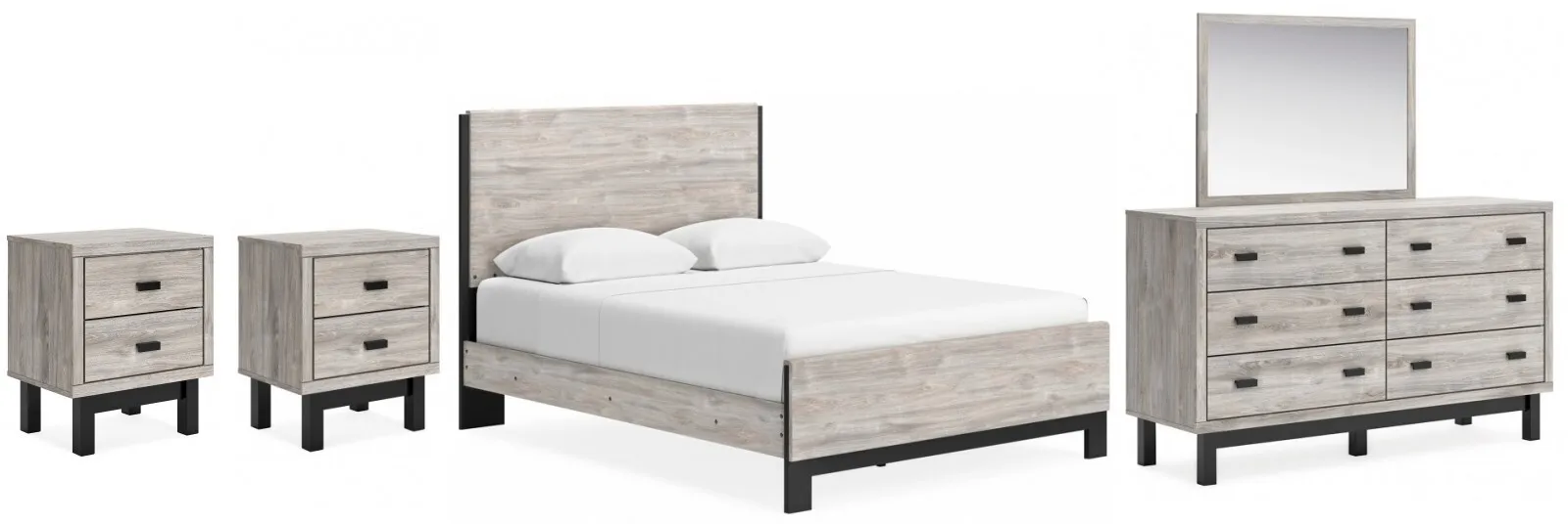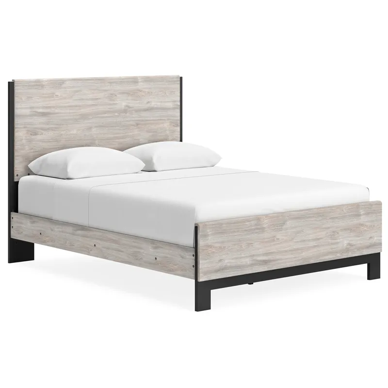 Vessalli Queen Panel Bed (B1036B2): 62.75 x 83 x 51.5 - Craft a contemporary hideaway without breaking the bank. An elegant juxtaposition of refined neutral hues, this two-toned queen panel bed brings sleek style to your space. The sheer simplicity of its profile frames your mattress stunningly. With this chic piece, a bedroom brimming with luxury has never been more attainable. Includes queen panel headboard, footboard and rails, Made with engineered wood (MDF/particleboard/plywood) and decorative laminate for the right balance of affordability and durability, Light gray finish over a replicated oak grain with authentic touch; footboard base has matte black finish with subtle replicated wood grain, Decorative laminate replicates natural or man-made material surfaces with consistent color, pattern and texture, Foundation/box spring required, sold separately, Mattress available, sold separately