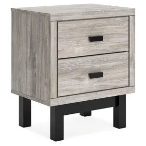Vessalli Nightstand x2 (B1036-92): 21.3 x 15.43 x 25 - Craft a contemporary hideaway without breaking the bank. An elegant juxtaposition of refined neutral hues, this two-toned nightstand brings sleek style to your space. Matte black drawer handles enhance the sheer simplicity of its profile. With this bedside piece, a room brimming with luxury has never been more attainable. Made with engineered wood (MDF/particleboard/plywood) and decorative laminate for the right balance of affordability and durability, Light gray finish over a replicated oak grain with authentic touch; base has matte black finish with subtle replicated wood grain, Decorative laminate veneer replicates natural or man-made material surfaces with consistent color, pattern and texture, Handles with matte black finish, 2 smooth-gliding drawers, Drawer interiors are lined with a faux linen laminate for a clean, finished look, Qi wireless charging and 1 USB charging port, Power cord included; UL Listed
