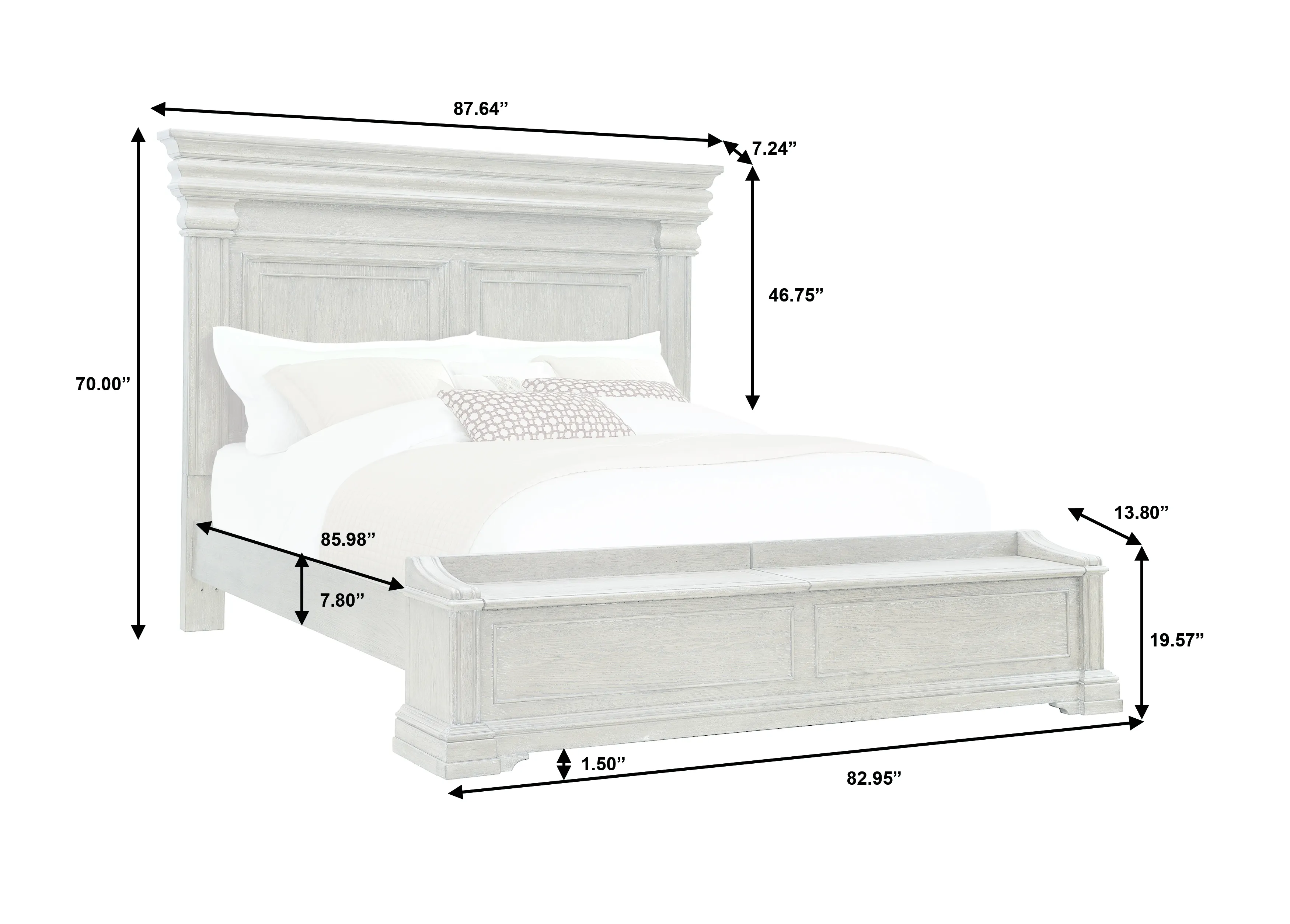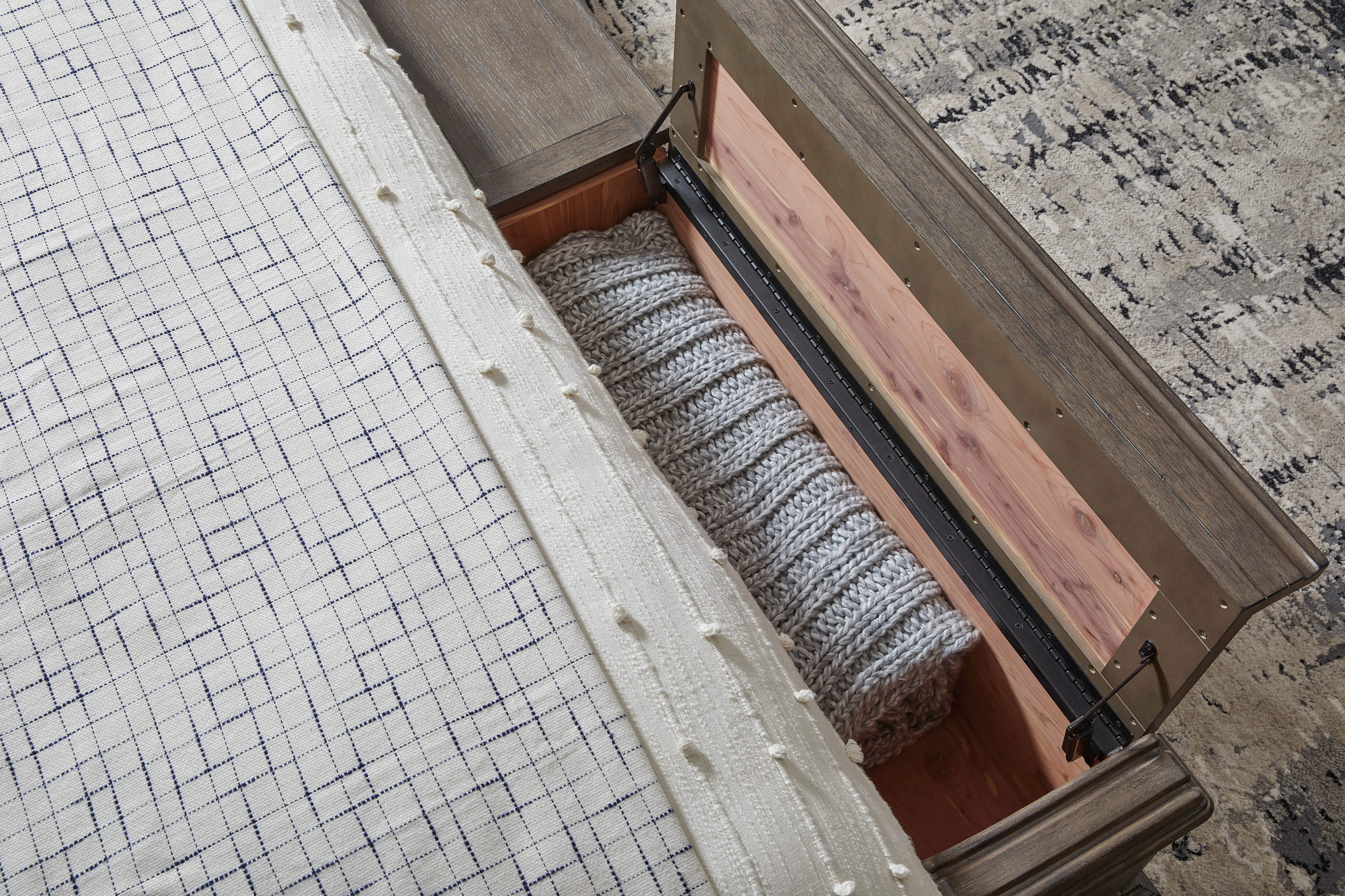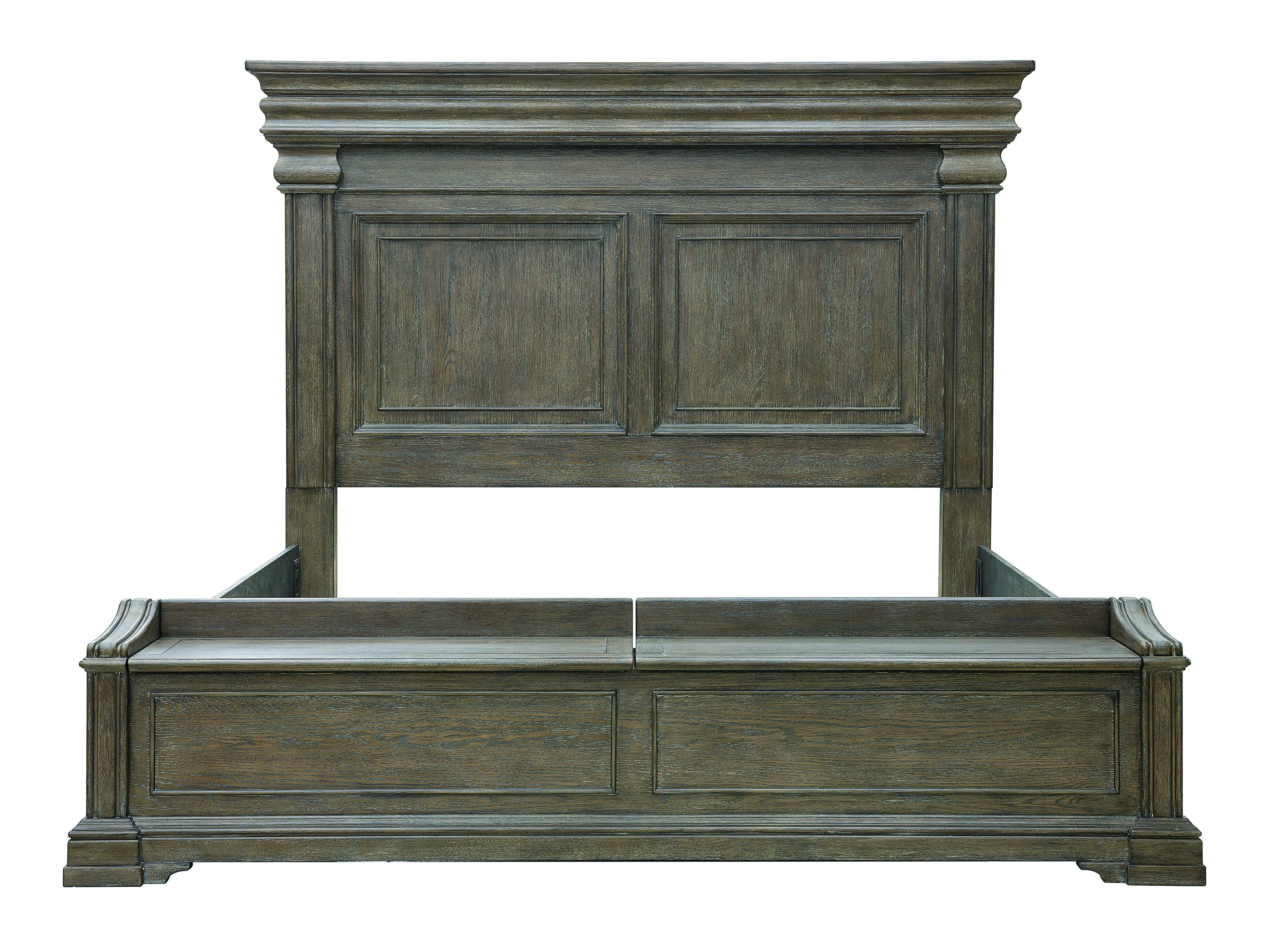With a design drawn from an antique hearth and a cleverly-designed blanket chest footboard, this lovely bed will fill your bedroom with elegant warmth. The warm brown finish with grey undertones highlight subtle raised details in the flat cut oak veneers, culminating in the mantle-like top edge of both the headboard and footboard. At each corner, pillar designs contribute a grand impression to the finished bed, elevating the look of your favorite linens. The footboard features a dual-sided hinged top that opens away from the foot of the bed, revealing ample storage space for extra blankets, shoes, and any other personal belongings. Add a mattress and box spring - both required and sold separately - to complete the look of this bed and enjoy its antique spin on traditional style in your bedroom.
