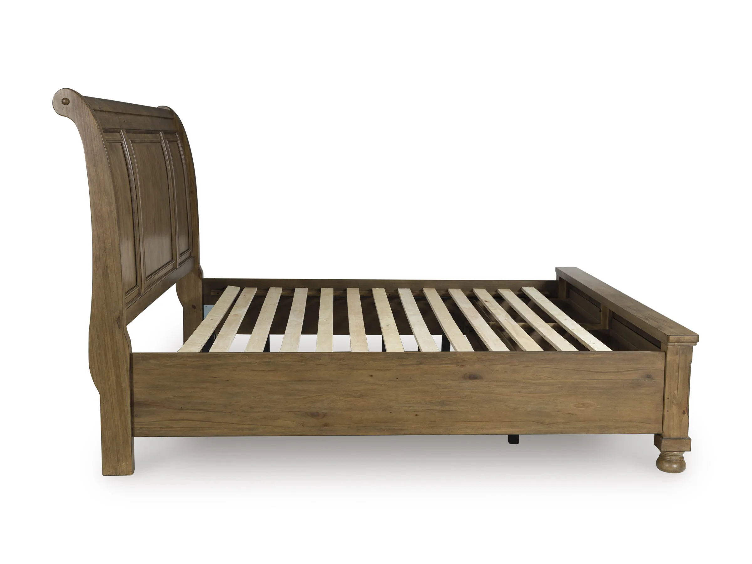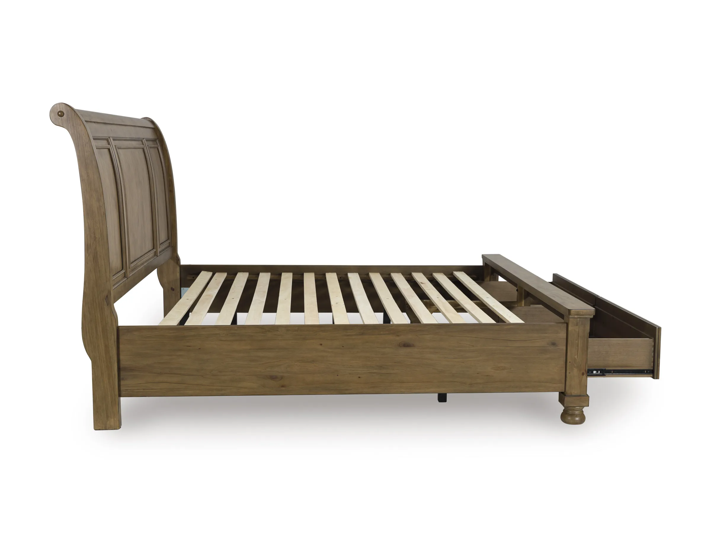 - Includes sleigh headboard, storage footboard and rails with roll slats