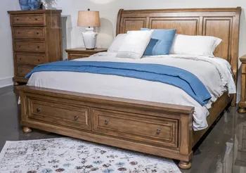 A relaxed take on casual traditional design, this king storage sleigh bed strikes a comfy pose with a classic sensibility. Its timeless design and chestnut brown wood-tone create a welcoming retreat tailored to your laid-back lifestyle. Metal knobs in an aged pewter color subtly dress up footboard drawers packed with storage possibilities. Now there’s a bed with staying power.