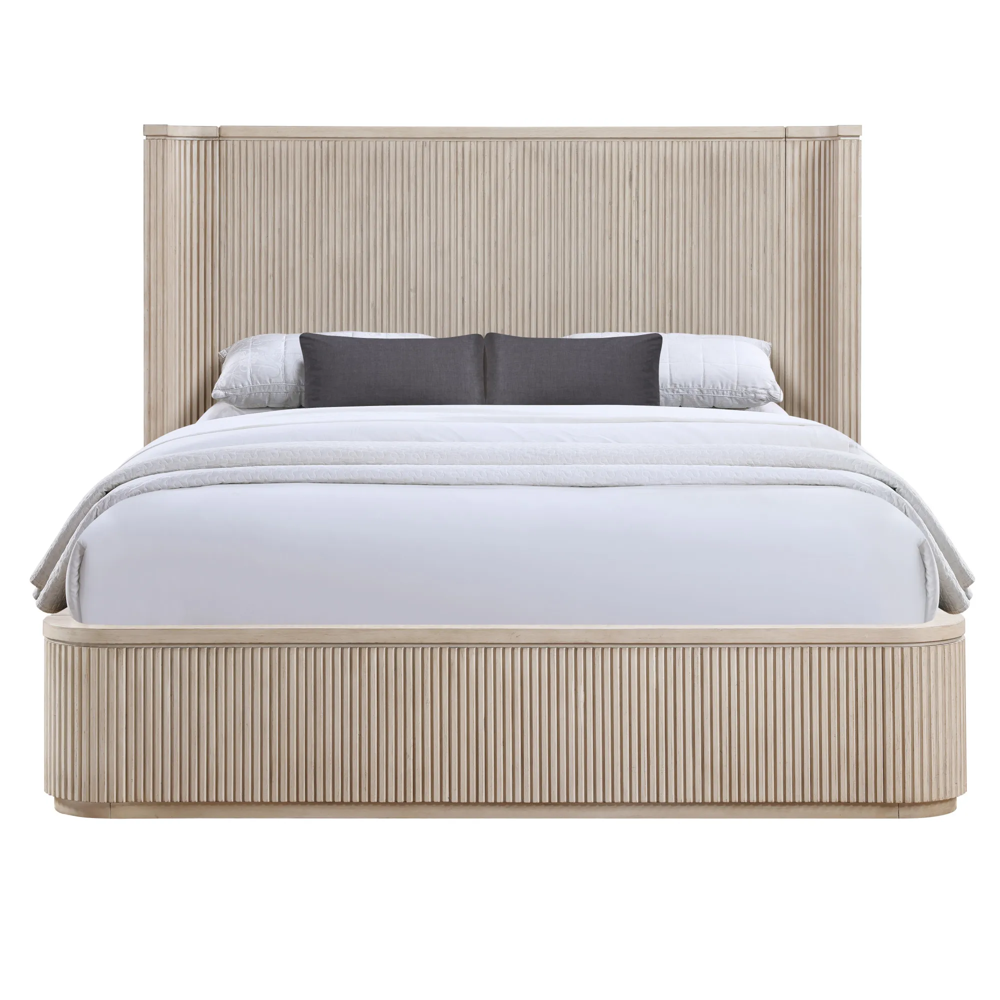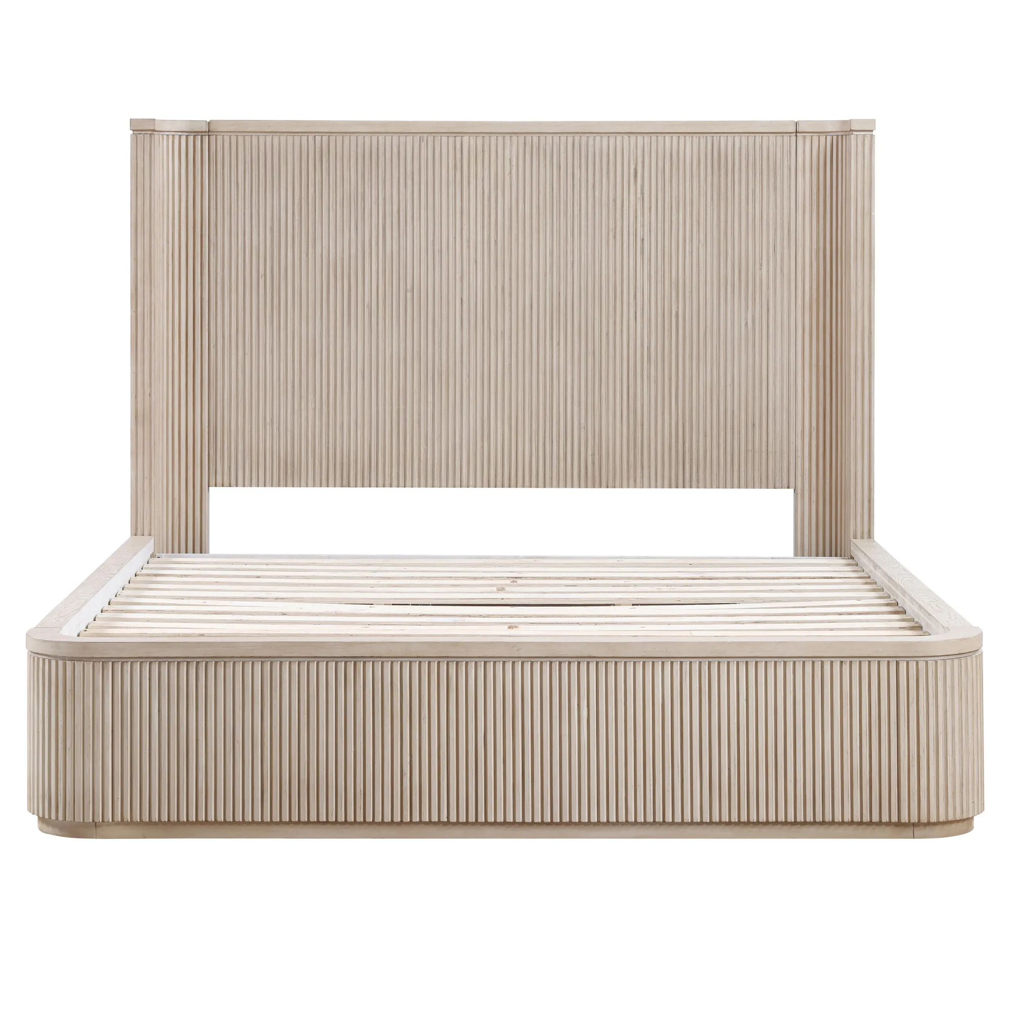 - The King Bed boasts elegant styling with reeded detailing, gently shaped corners, and a sturdy plinth base for added stability.