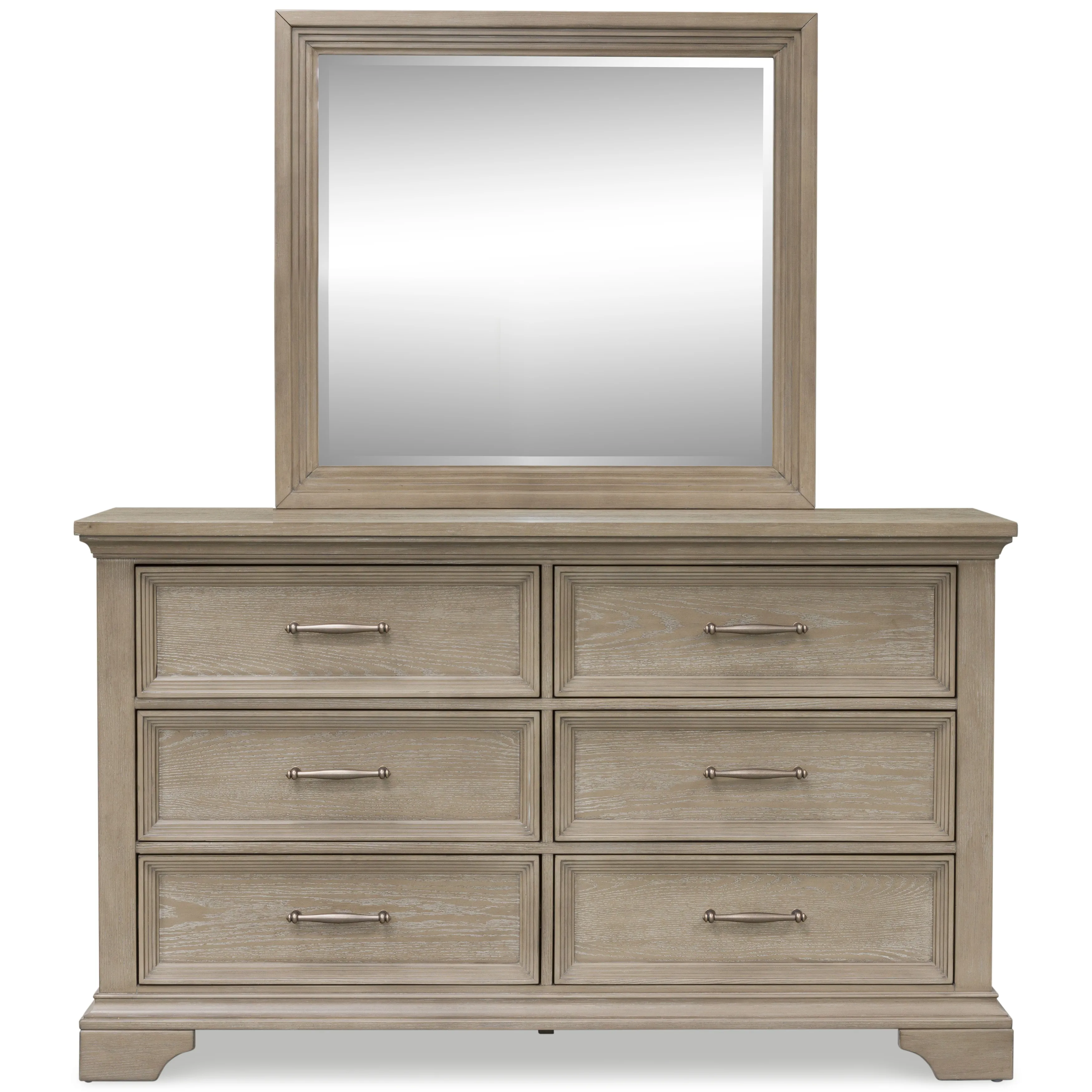 Indulge in relaxed refinement with the Vallardia dresser and mirror set. Its art deco-inspired moulding and casual grayish brown finish exemplify an updated take on traditional styling. Spacious drawers with bronze-tone pulls offer plenty of storage for jeans, sweaters, socks—your call. Inspired by the past and reimagined for the present, this set is ready to embrace the demands of everyday life.