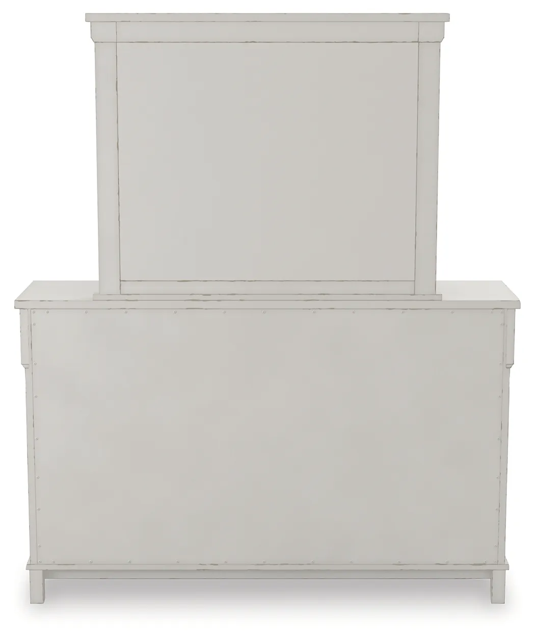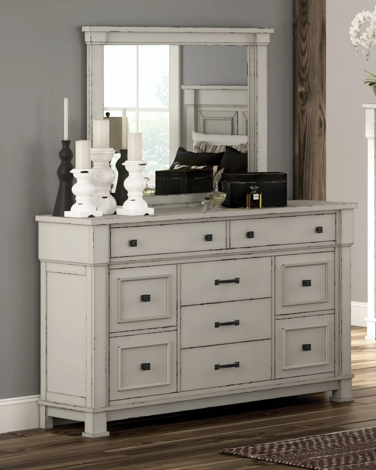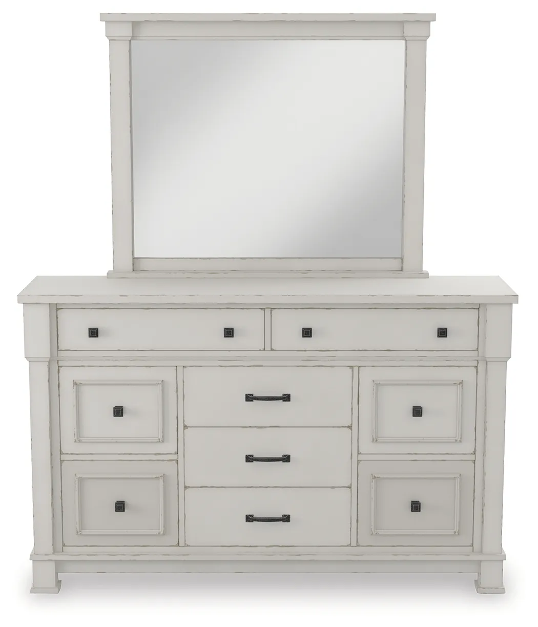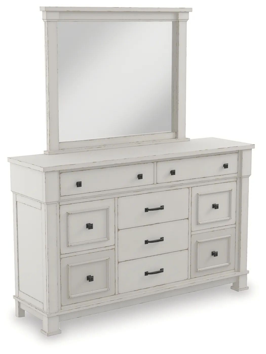 Given just enough distressing for family heirloom charm, this dresser and mirror set is a mastery in modern farmhouse style. The ultimate choice for a dreamy bedroom retreat, its antiqued white finish is wonderfully easy on the eyes. Sturdy silhouette with bold pilasters gives this 9-drawer dresser such a rich, substantial presence. Various drawer sizes nicely accommodate, while combination of flush mount and framed drawer fronts is an inspired touch.