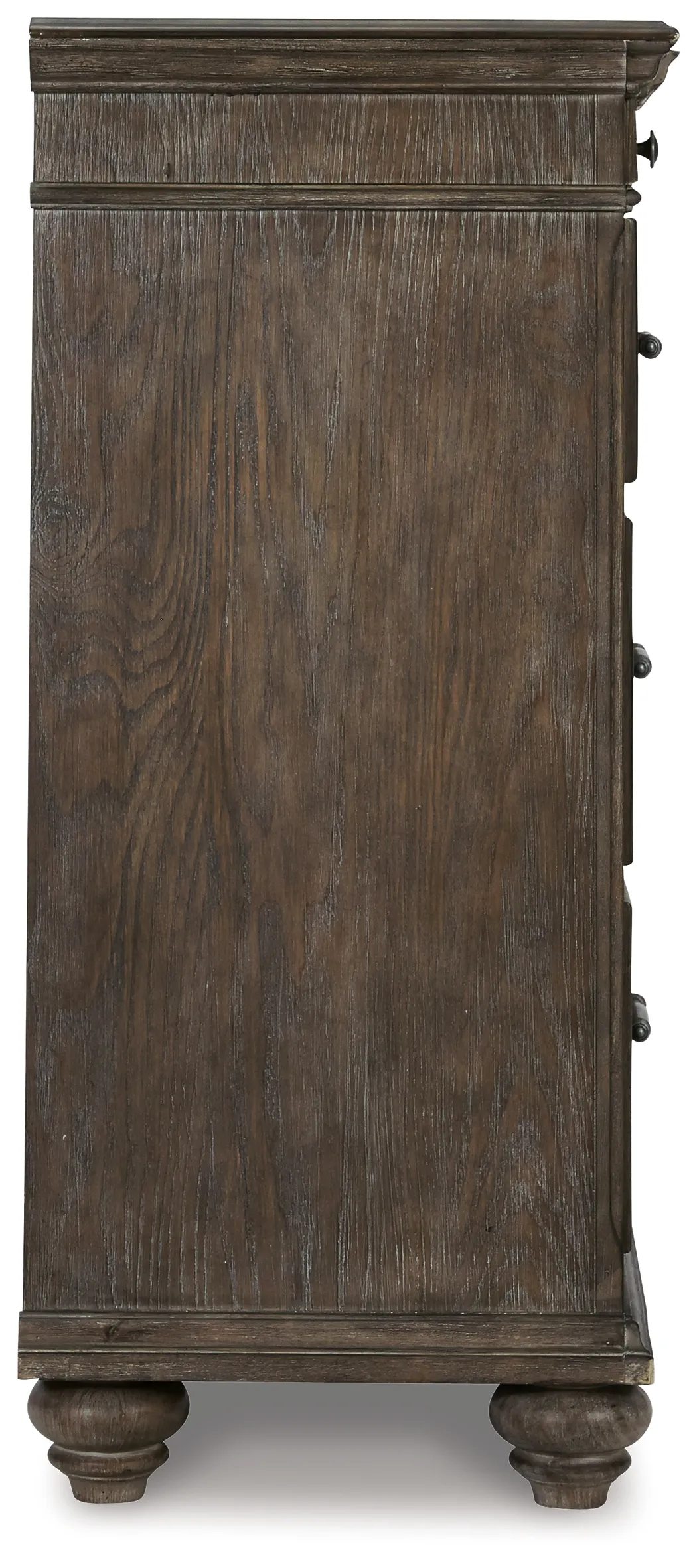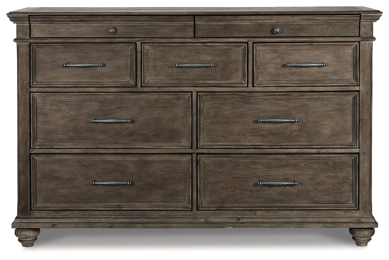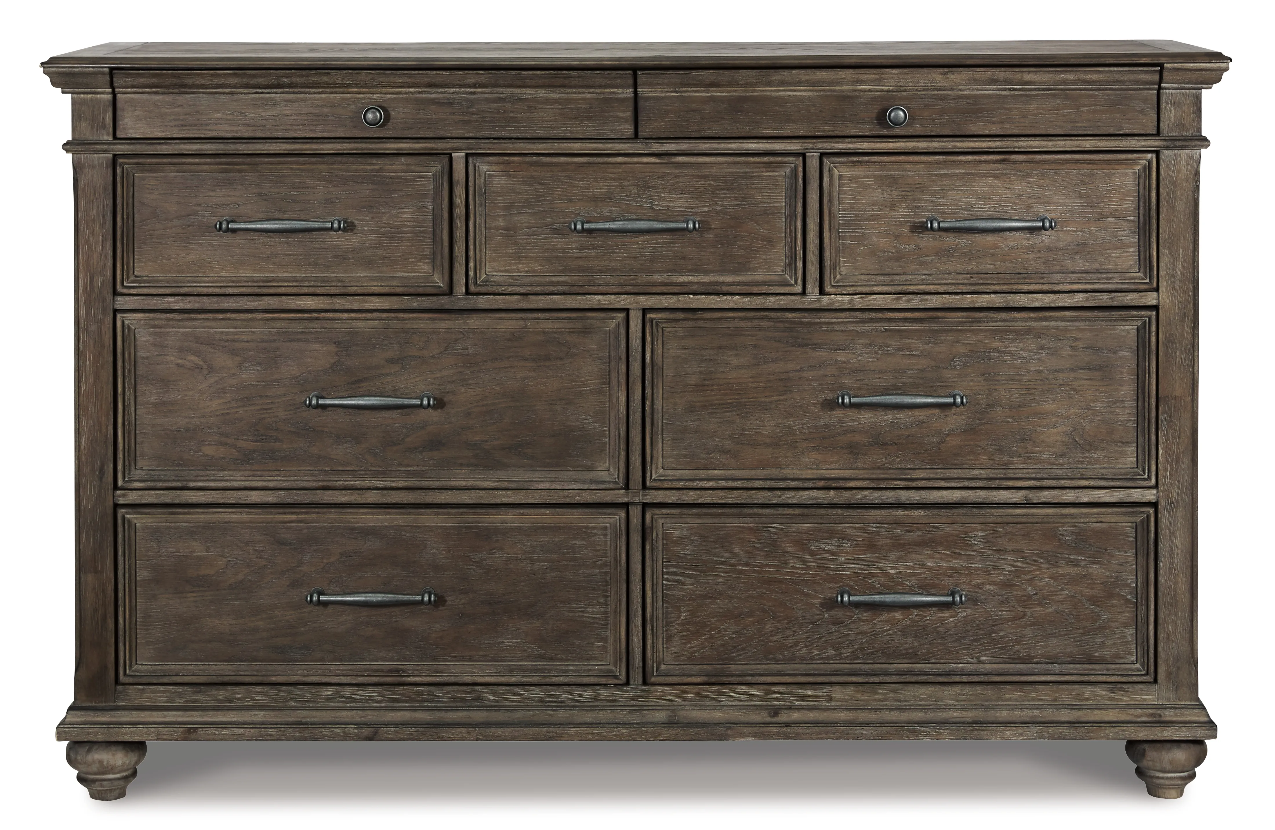Homey. Hearty. Heavenly hued. Luring with a distressed weathered gray finish and substantial mouldings for great presence, this dresser is sure to make your homestead feel that much more like home. Solid wood is beautified with elm veneers for a master suite masterpiece made for years of satisfaction. Dark pewter-tone nailhead trim adds to the richly rustic aesthetic.