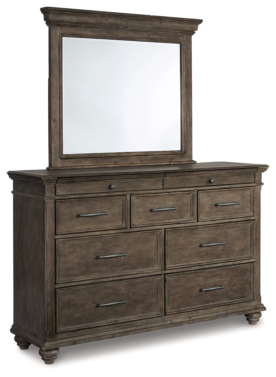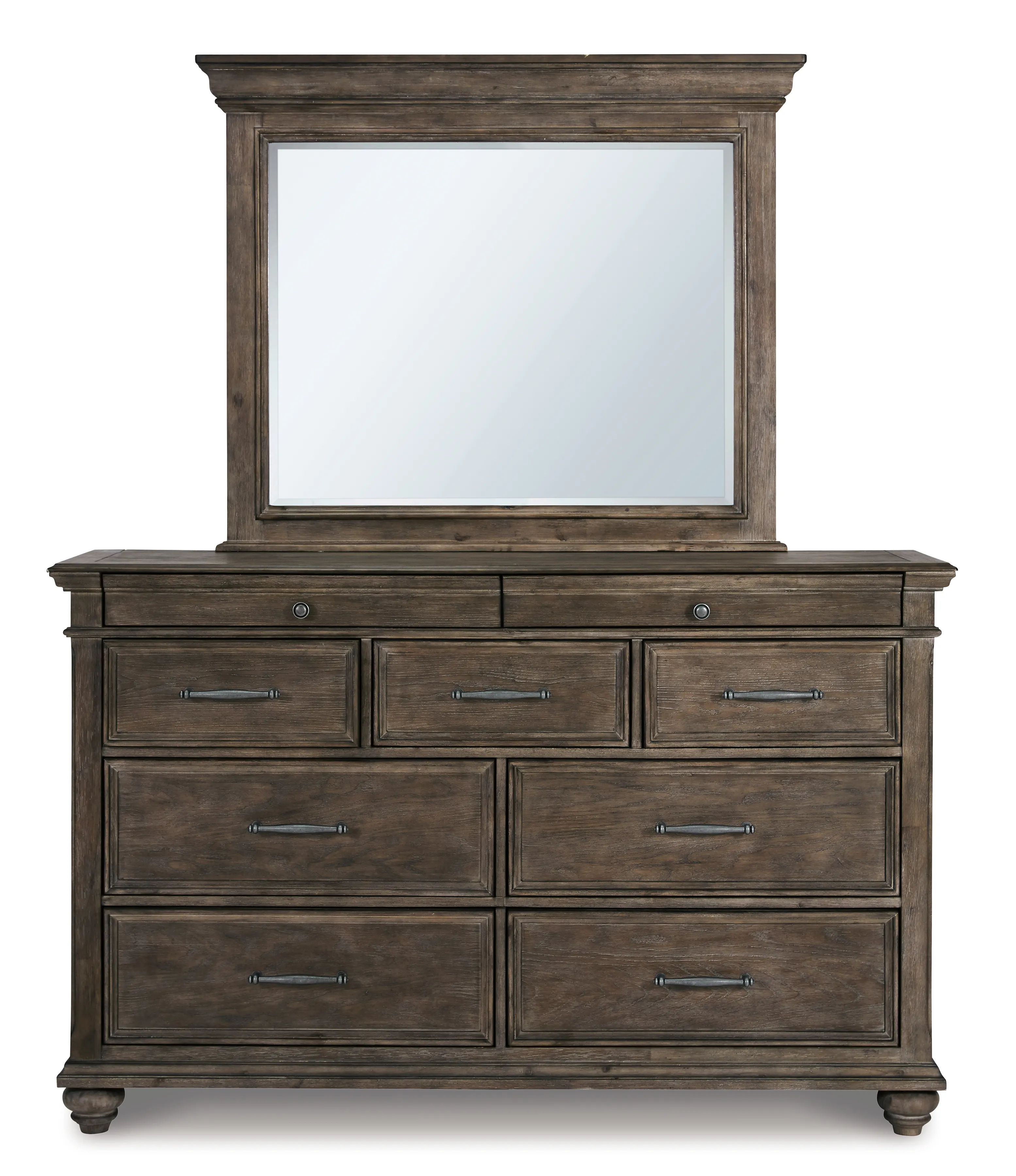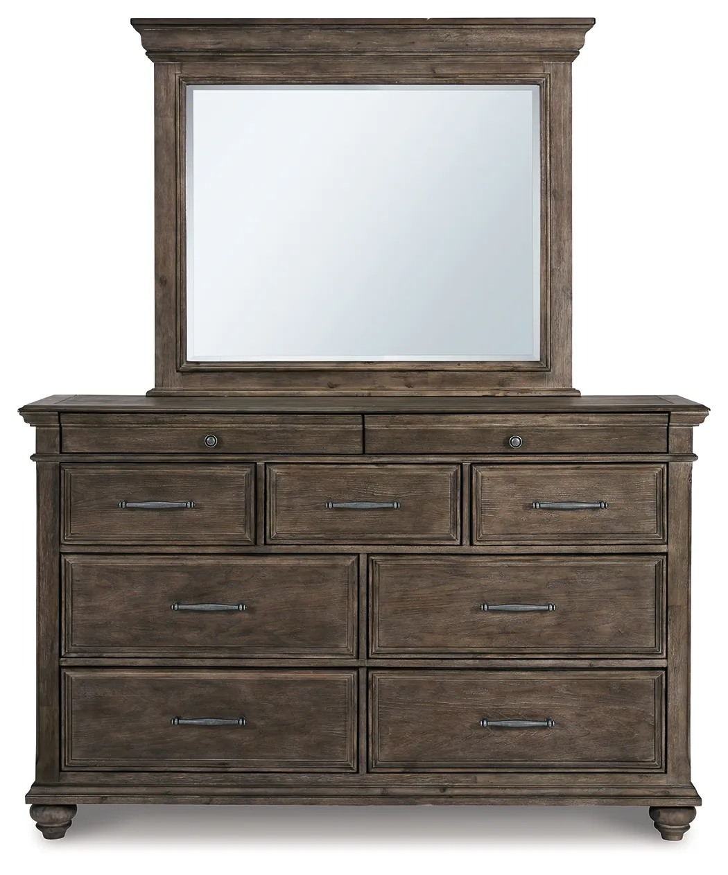Homey. Hearty. Heavenly hued. Luring with a distressed weathered gray finish and substantial mouldings for great presence, this dresser is sure to make your homestead feel that much more like home. Solid wood is beautified with elm veneers for a master suite masterpiece made for years of satisfaction. Dark pewter-tone nailhead trim adds to the richly rustic aesthetic.