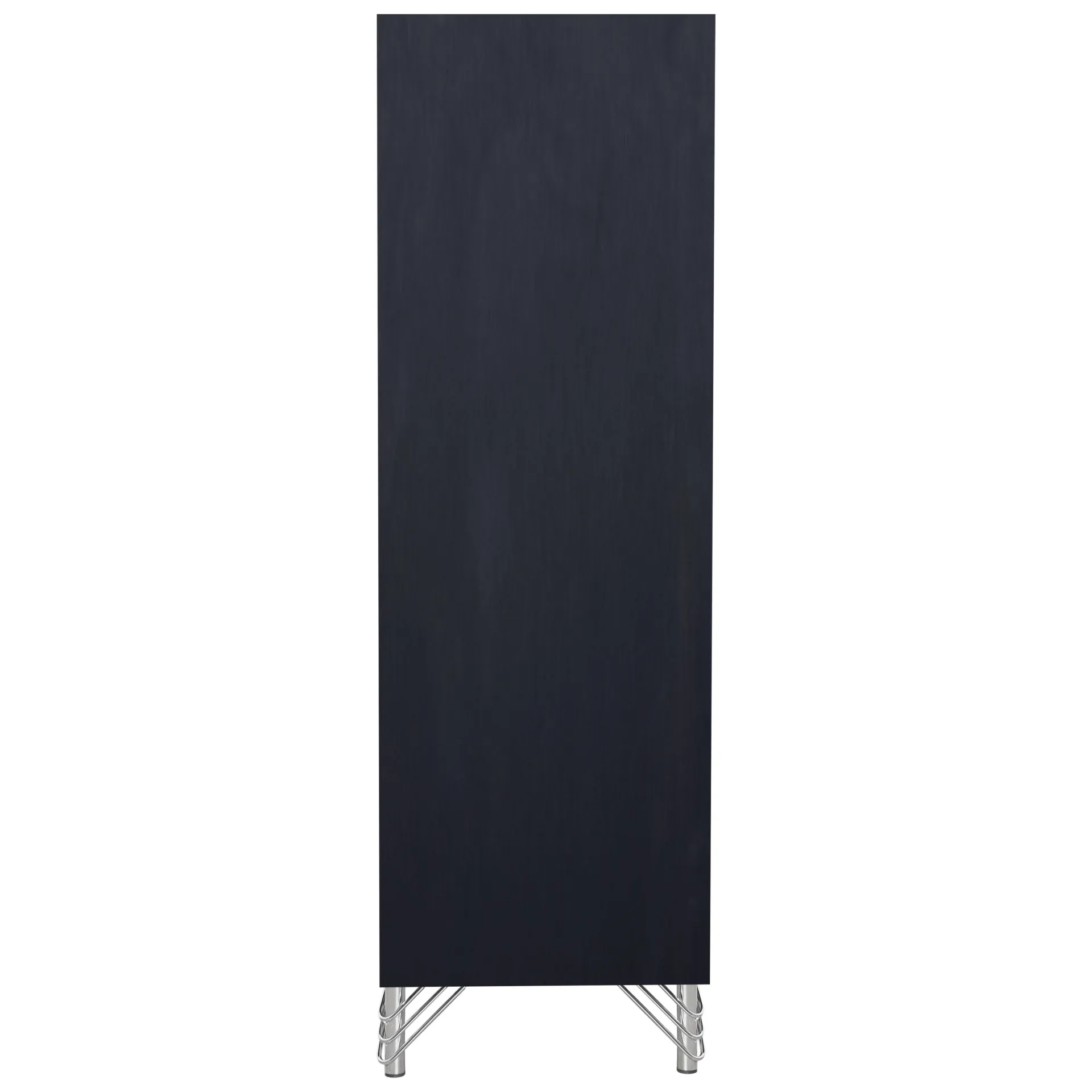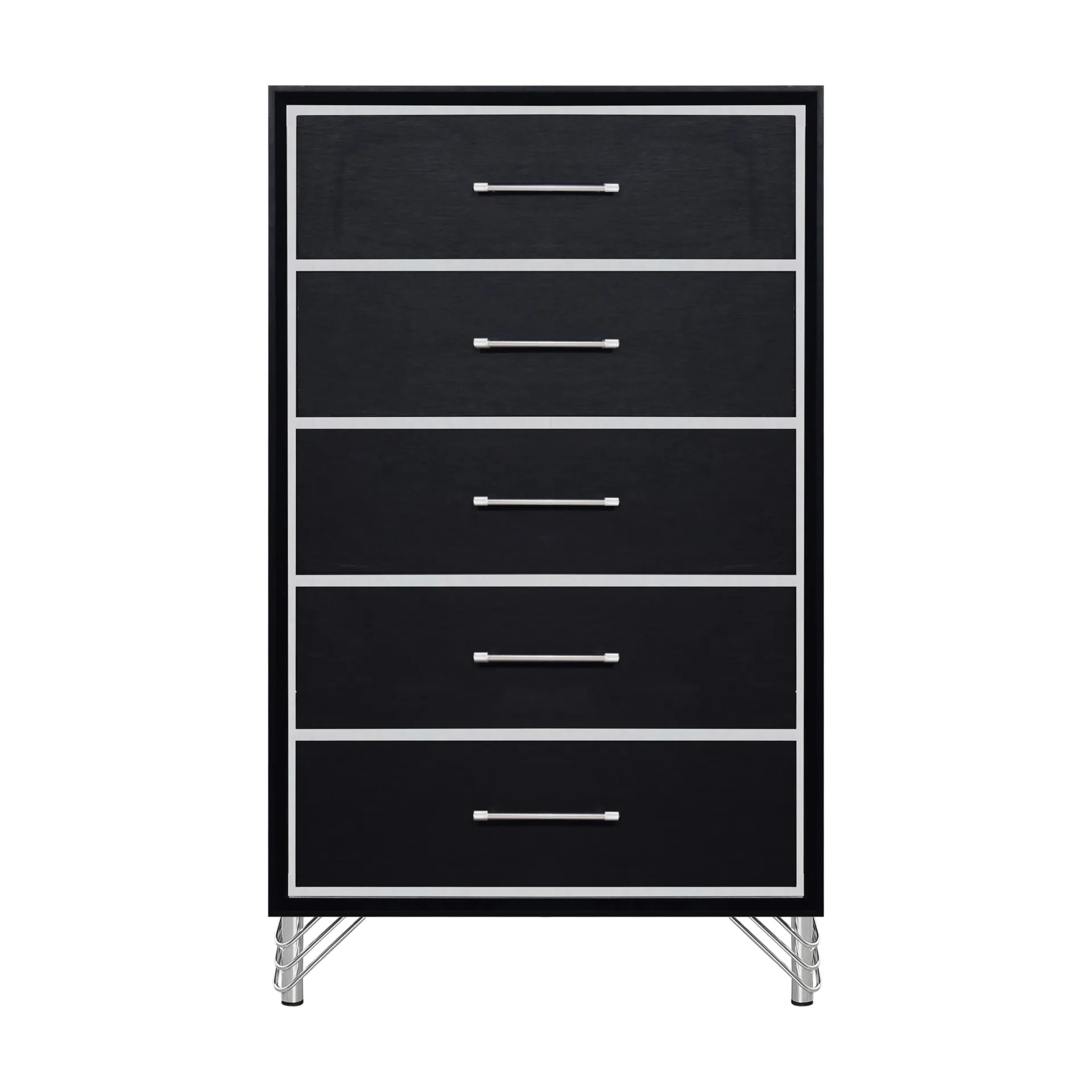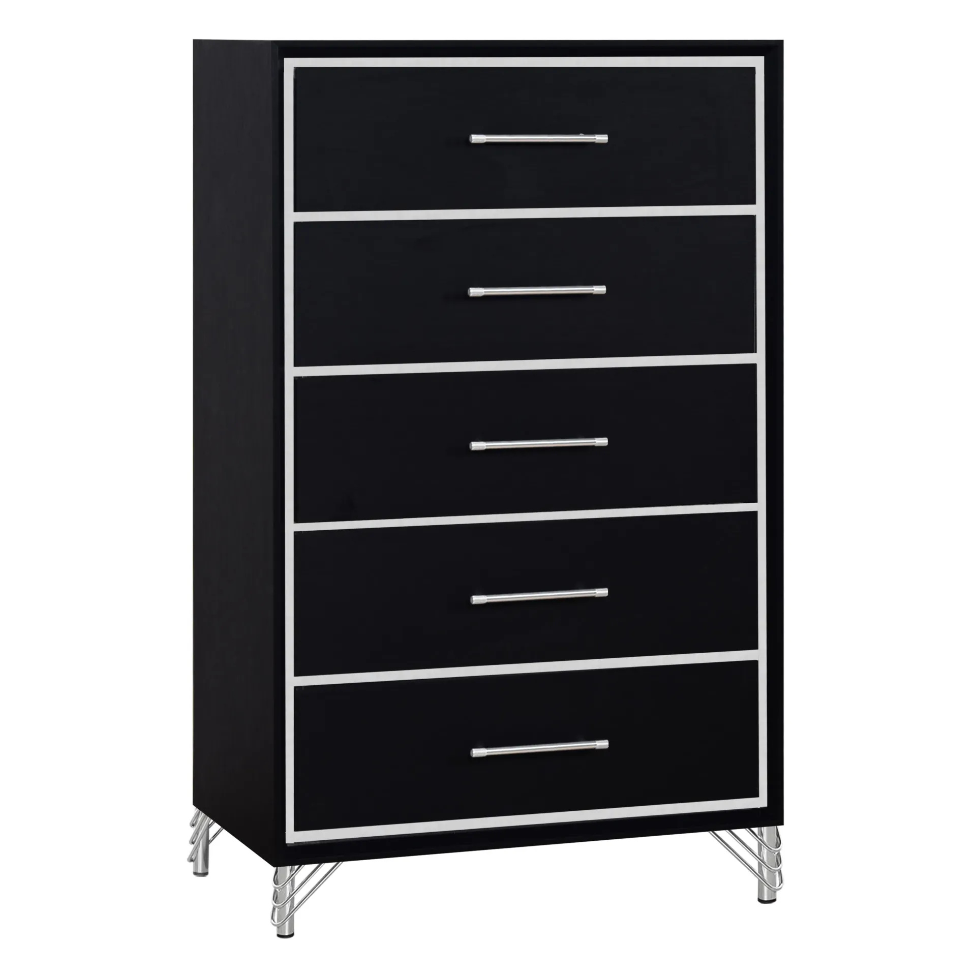 The Ava 5 Drawer Chest in Ebony blends modern sophistication with everyday functionality. Made from engineered wood with eco-friendly black laminate, it features silver mylar accents and sculpted legs for a glamorous finish. Five spacious drawers with English dovetail joinery and Kenlin glides offer smooth, durable storage. A perfect combination of luxury and practicality, this chest adds stylish charm to any bedroom.