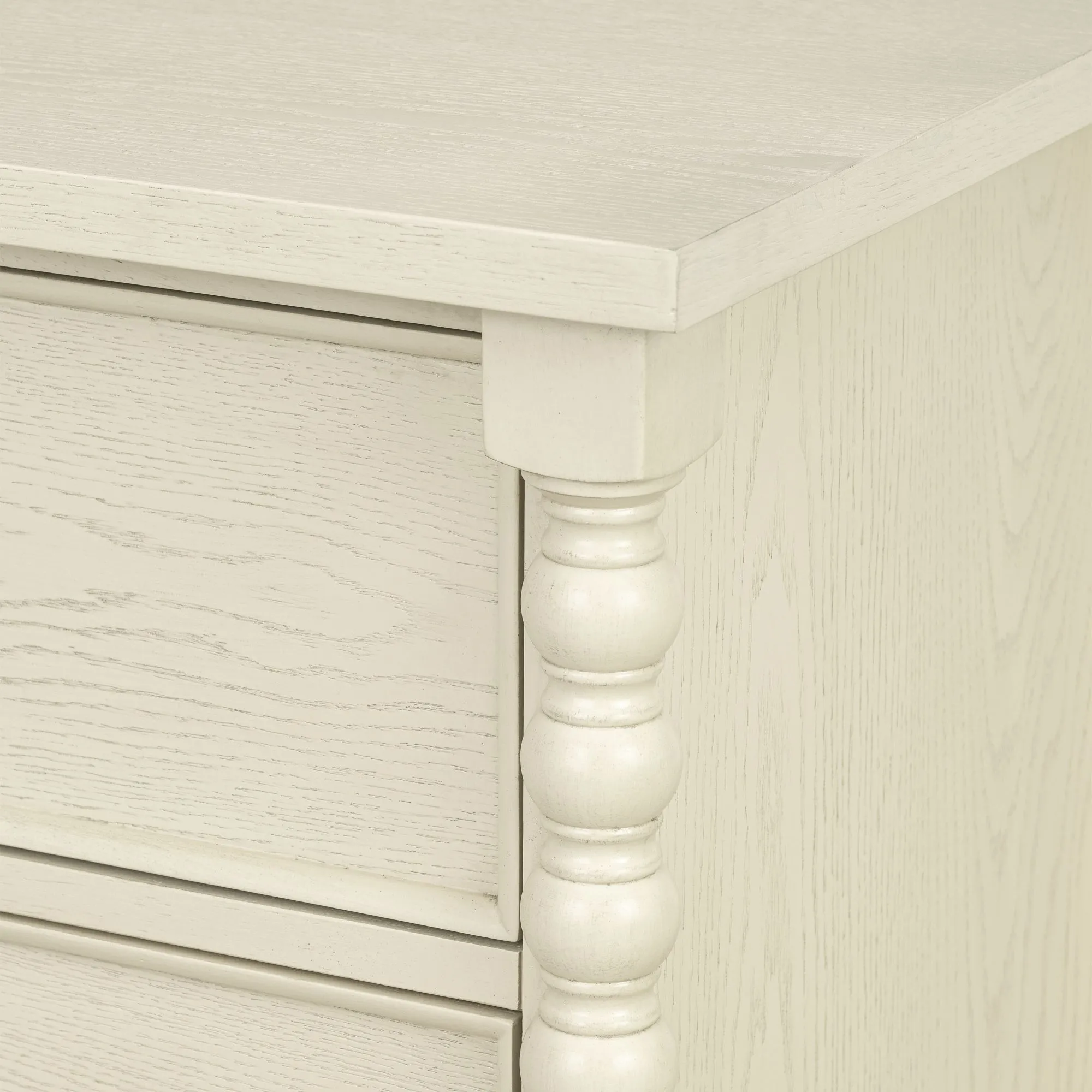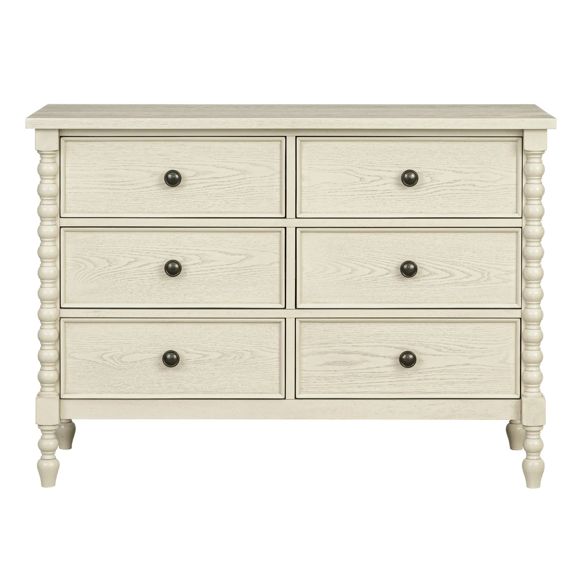 The Beckett Dresser from Madison Park Signature brings timeless design to smaller spaces. At 46" wide, it's the perfect solution for compact bedrooms, entryways, or dining areas. Six drawers with metal knobs and Velcro-lined boxes offer organized storage, while classic spindle legs and a 6" floor clearance add airy elegance. Smooth ball-bearing glides and an anti-tip kit ensure easy use and added safety. Finished in antique cream with floor-protecting leg glides. Add space-smart style to your home with the Beckett Dresser today!