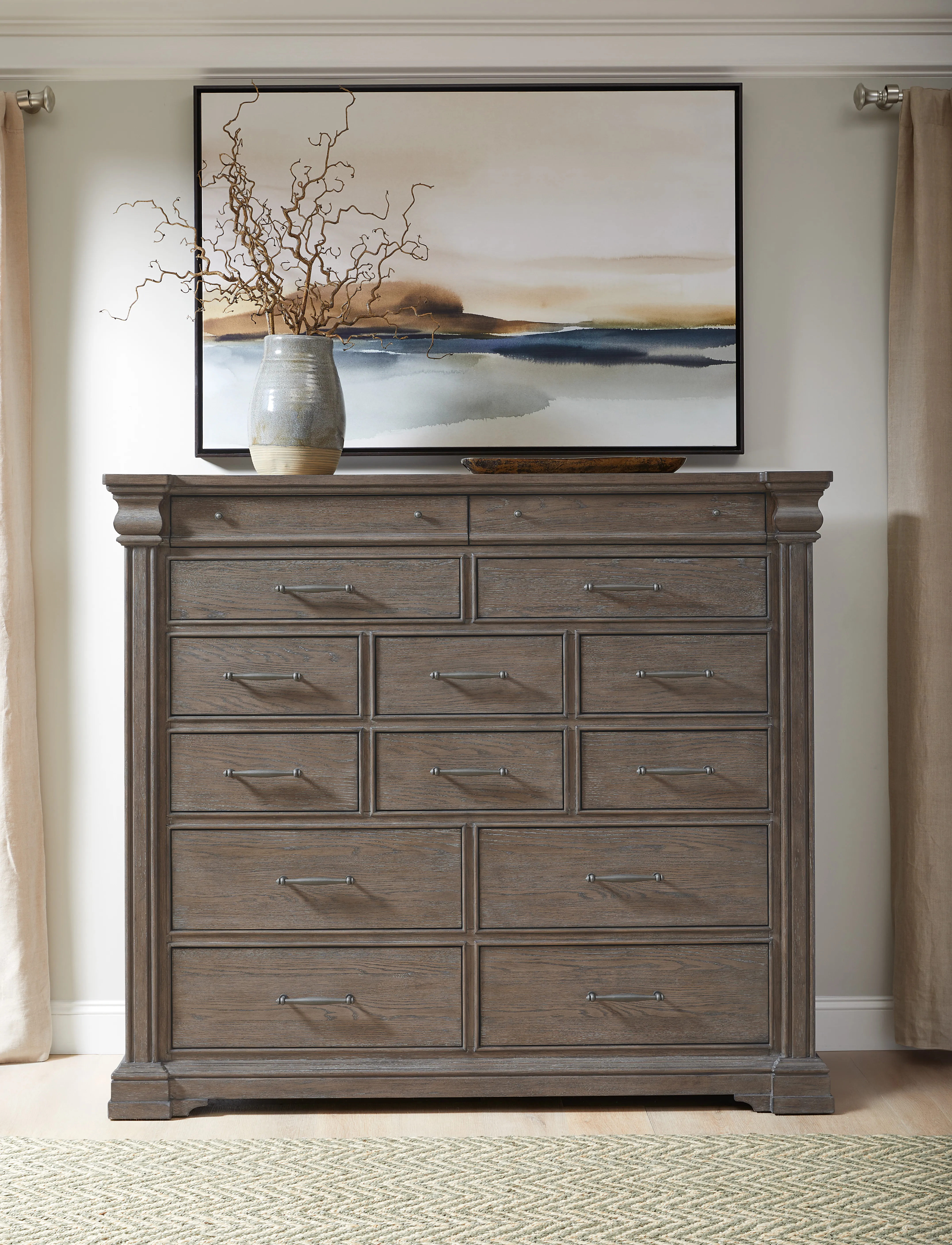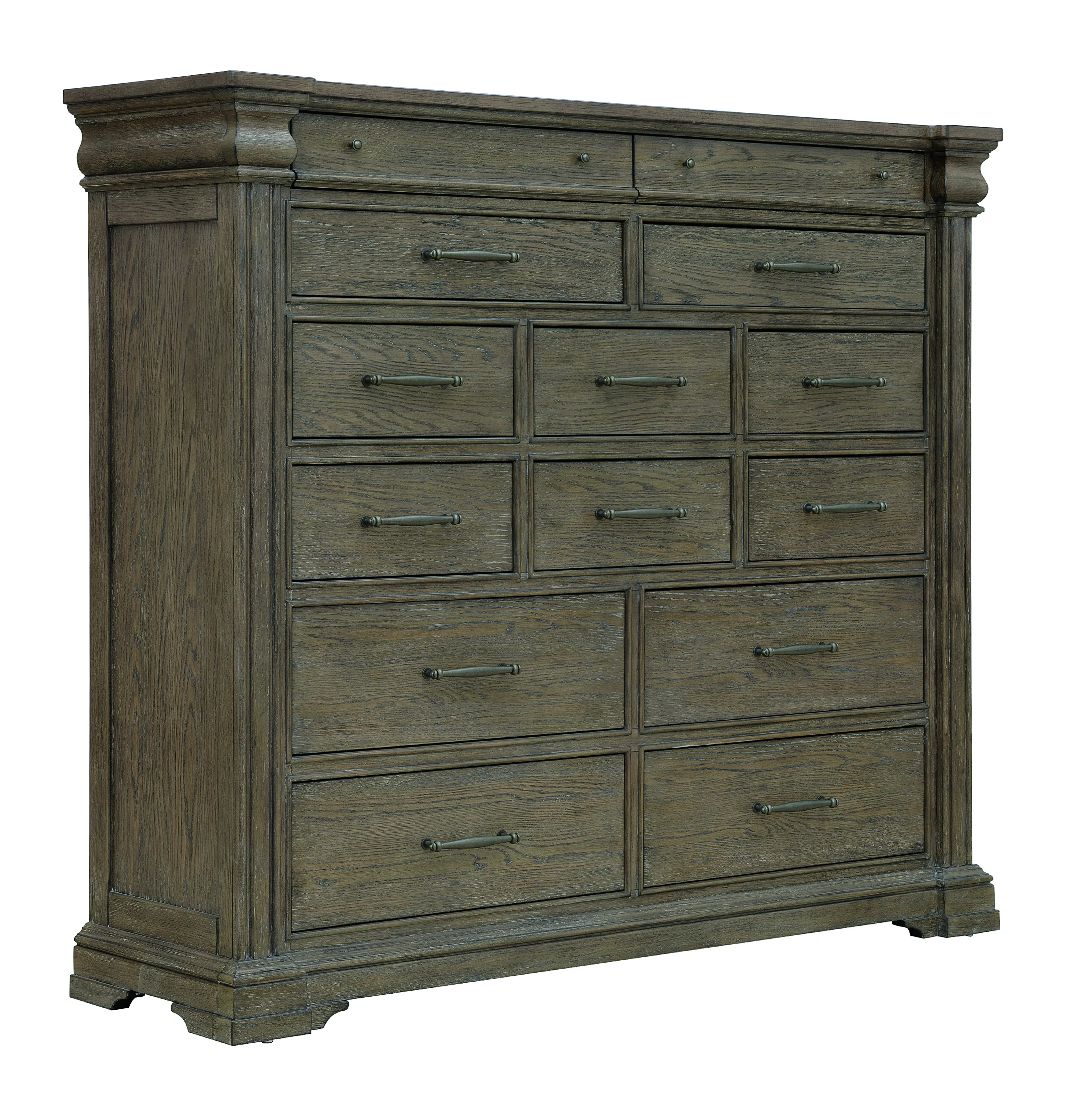 If you need to store more clothing etc. this fourteen drawer master chest is for you. It features a handsome natural bark brown finish on oak veneers and has a stately presence. Side pilasters, bracket feet and a thick top provide architectural elements. Drawers have dovetail construction for durability and glide on metal ball bearing side guides. There are felt bottoms in the top drawers, and cedar in the bottom ones. Antique pewter finished hardware adds the perfect complement.