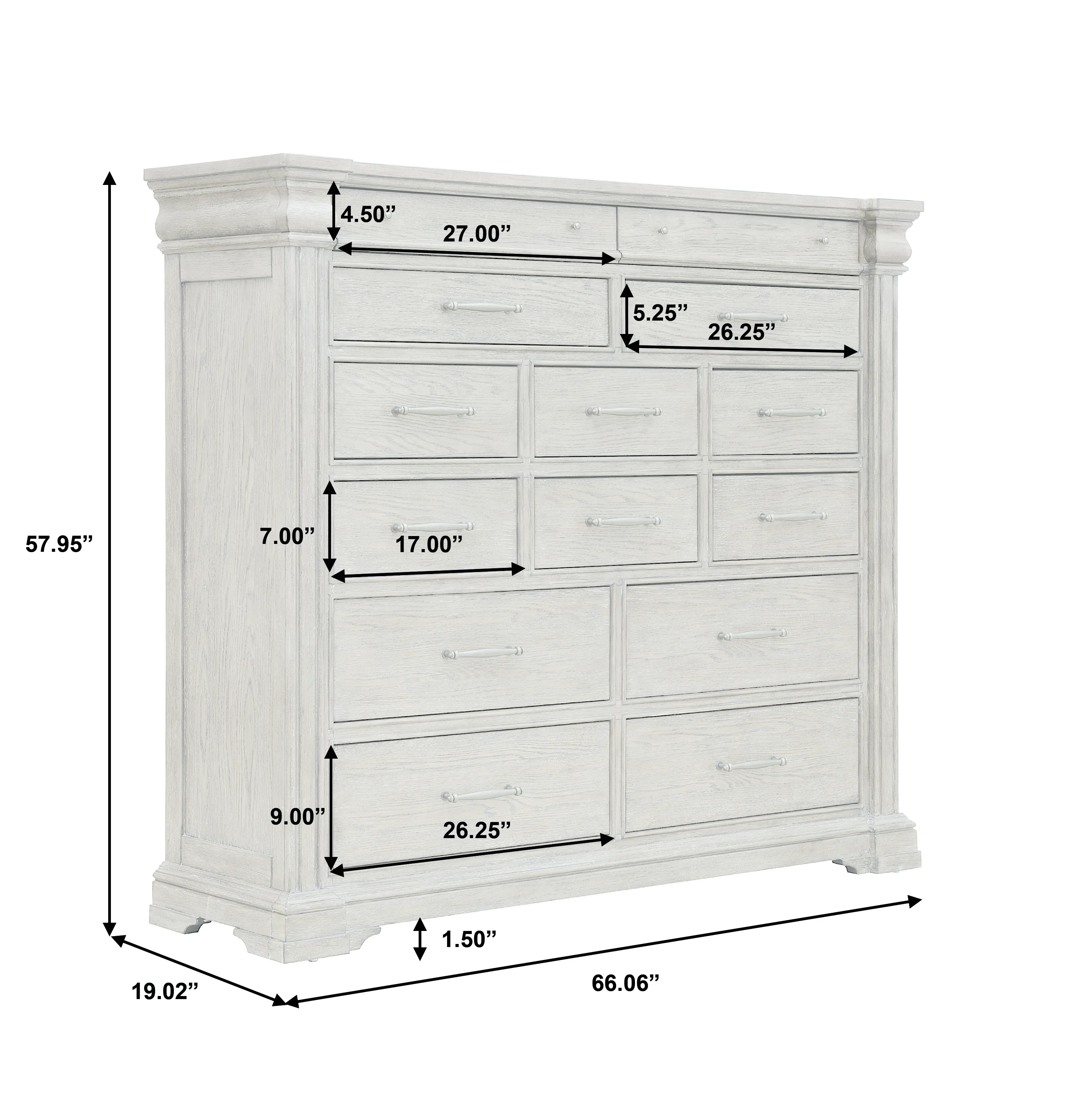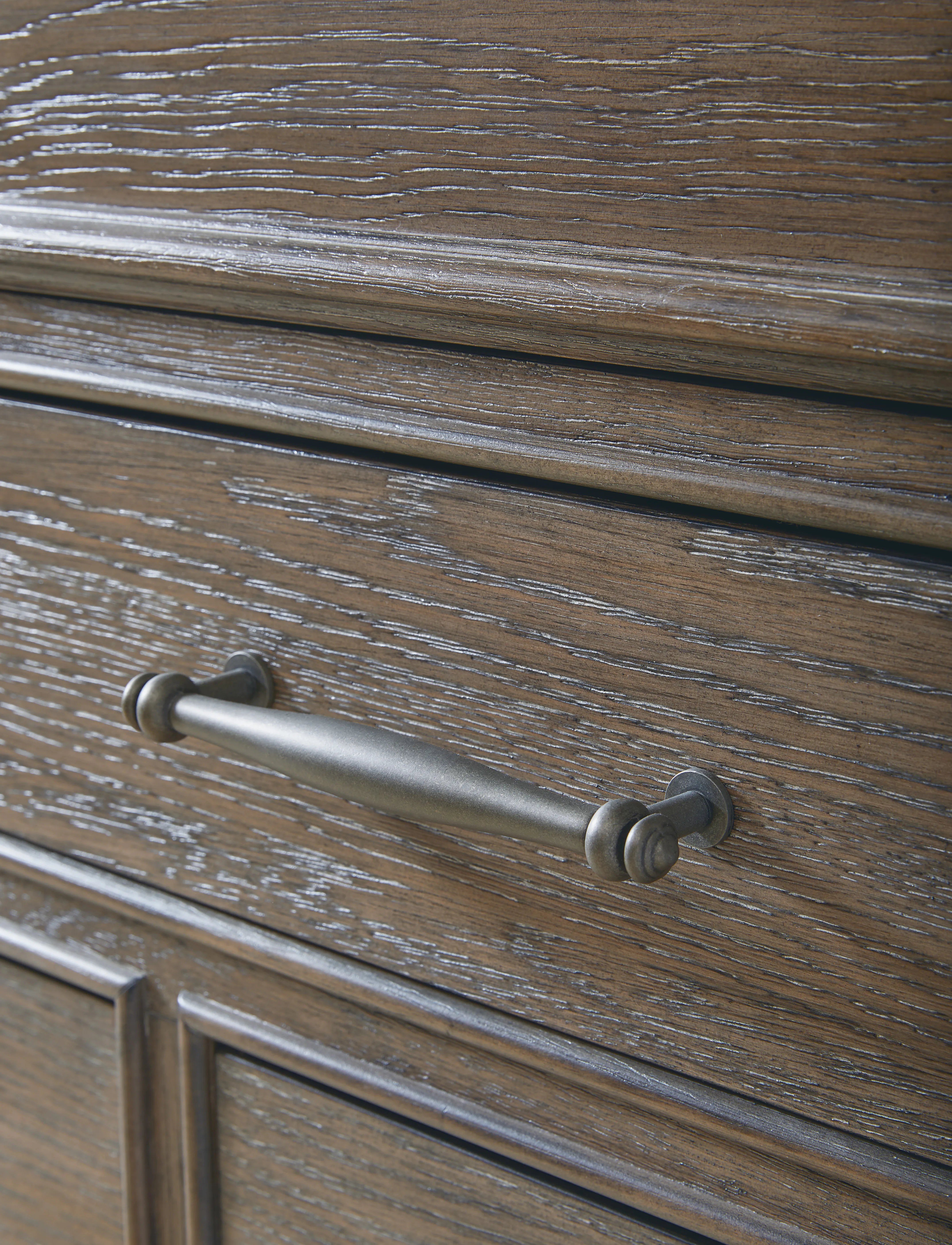- Hardware: Custom-crafted antique silver bar pulls and knobs add elegance to drawer fronts