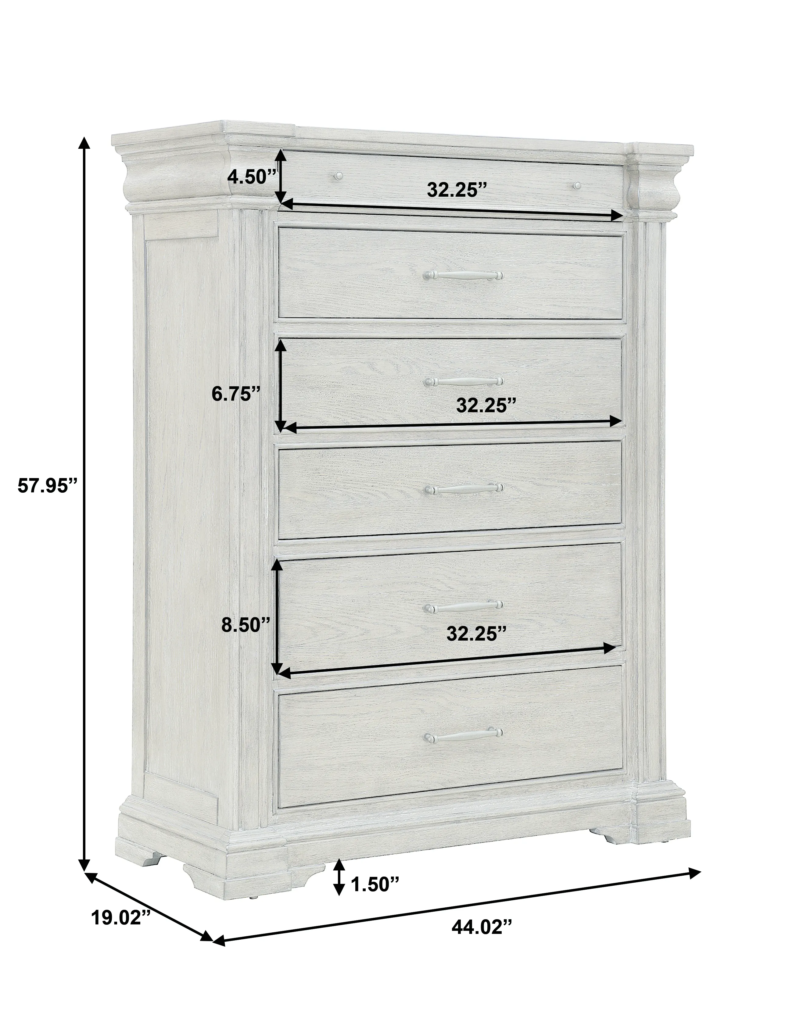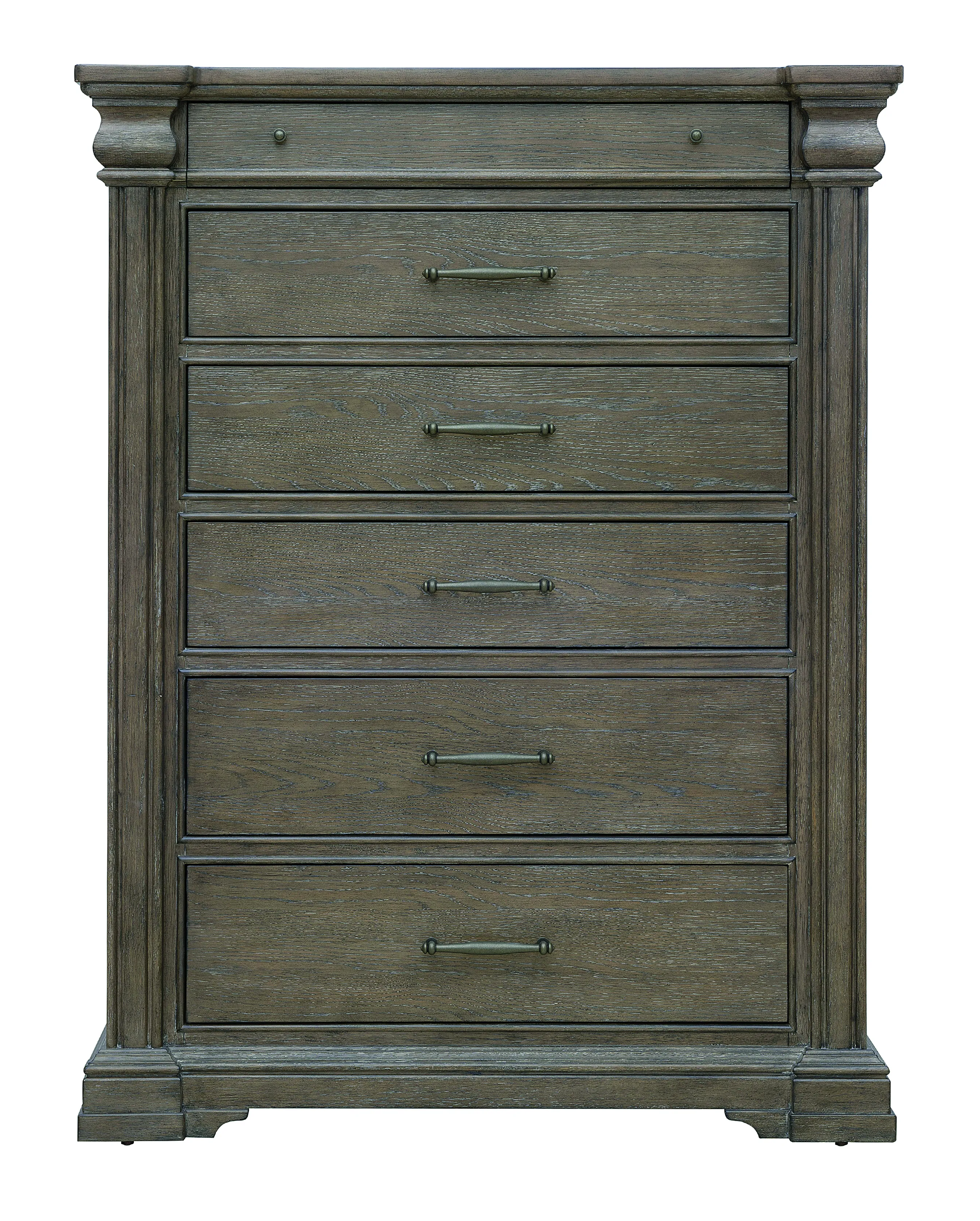 From its bracket feet to the elegant pillars that support its edges, this 6 drawer chest has a unique design inspiration: an elegant antique hearth. A slender top drawer glides out to reveal a felt-bottom interior - perfect for delicate items like mobile devices, jewelry or wristwatches. The drawers below offer three mid-sized drawers and two larger drawers; the bottom drawer features a cedar panel bottom for a high-end feel. Custom drawer pulls and knobs are finished in an antique silver hue that highlights the warm brown finish and grey undertones in the flat-cut oak veneers.