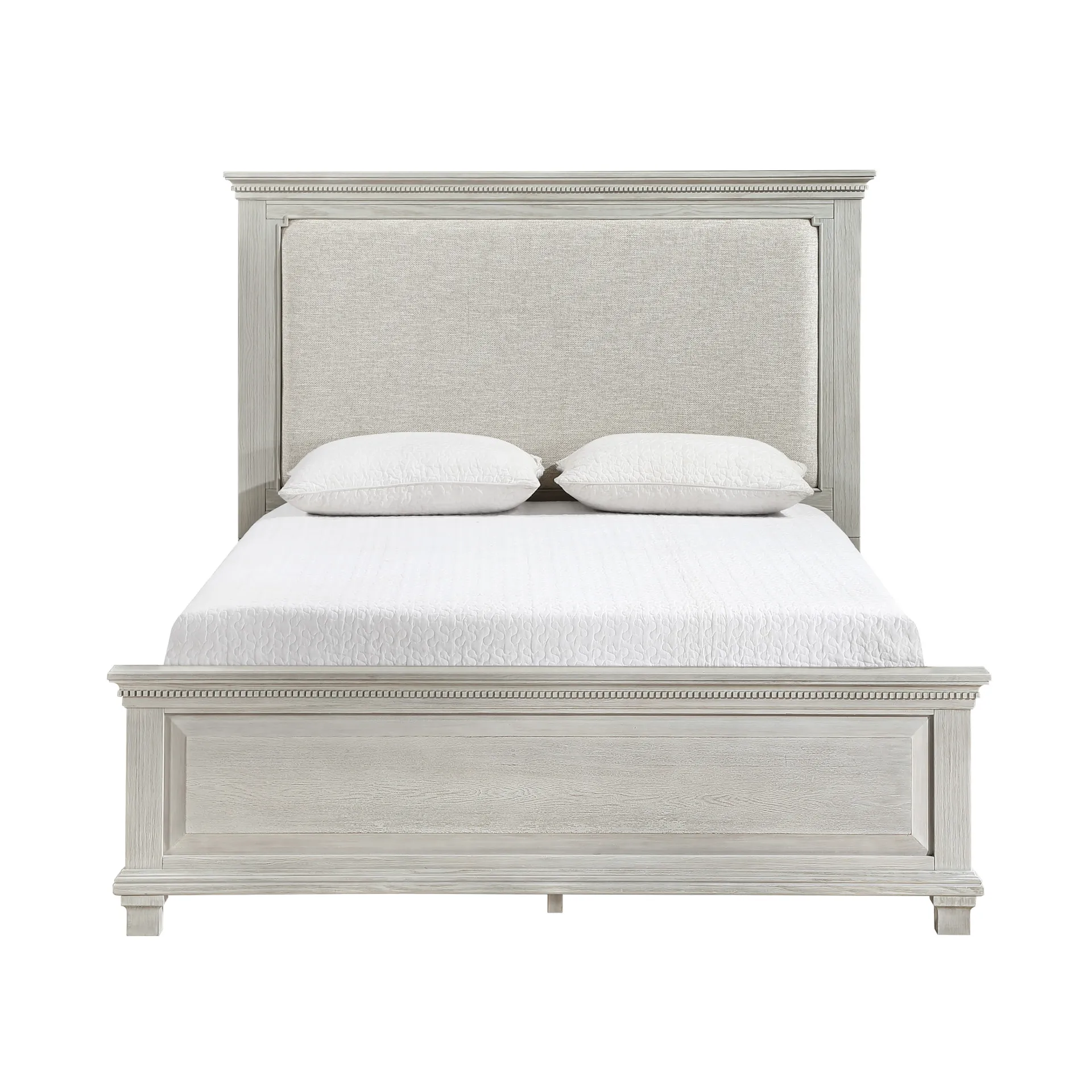 The Silver Sands Bed is crafted with durable, quality construction from solid pine, manufactured woods, and oak wood veneers, ensuring a strong and stable piece. This collection embodies a transitional style, combining clean, simple lines with a rustic wood finish for a calm and inviting atmosphere. The multi-step, hand-applied misty gray finish offers a light, weathered look with a slightly distressed appearance, highlighting the natural grain and mineral patterns of the wood. The bed features a raised panel footboard, a plushly padded headboard, dentil moldings, and nicely shaped crown moldings, lending it a sophisticated appeal. Combining style, durability, and comfort, this bed is an elegant addition to any bedroom.