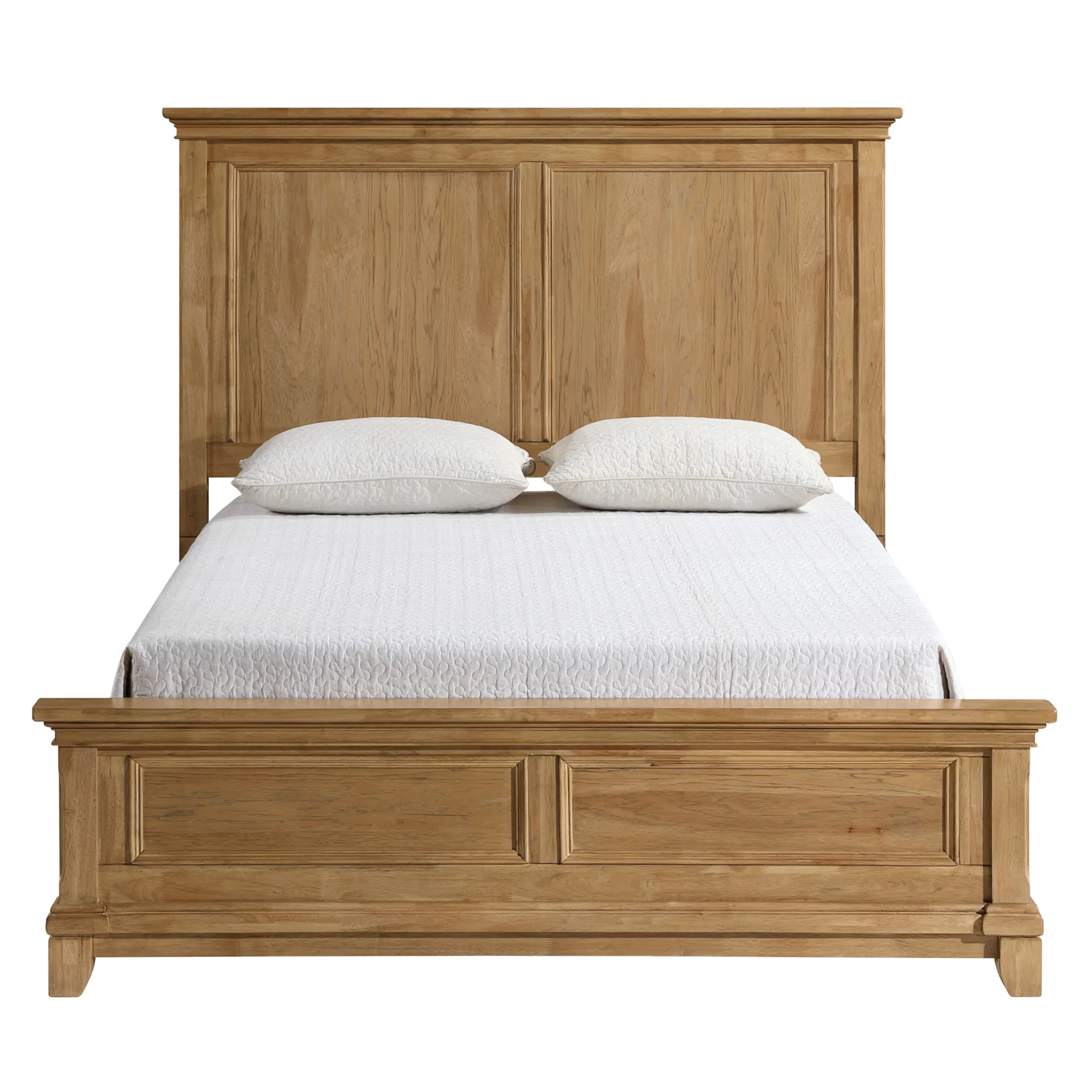 The Sunstone Bed combines durable, quality construction with solid rubberwood, manufactured woods, and hickory wood veneers, creating a strong and stable foundation for restful sleep. This collection features a classic, rustic style with natural wood finishes and clean, simple lines, complemented by neutral tones and a minimalistic design that fosters a serene and inviting atmosphere. The clear, natural finish, achieved through a hand-applied stain, enhances the wood's grain patterns and characteristics. The bed's elegant design includes thick picture frame moldings and nicely shaped crown moldings, adding a sophisticated touch to any bedroom. The Sunstone Bed offers both timeless design and robust construction, making it a perfect addition to enhance the comfort and style of your bedroom.