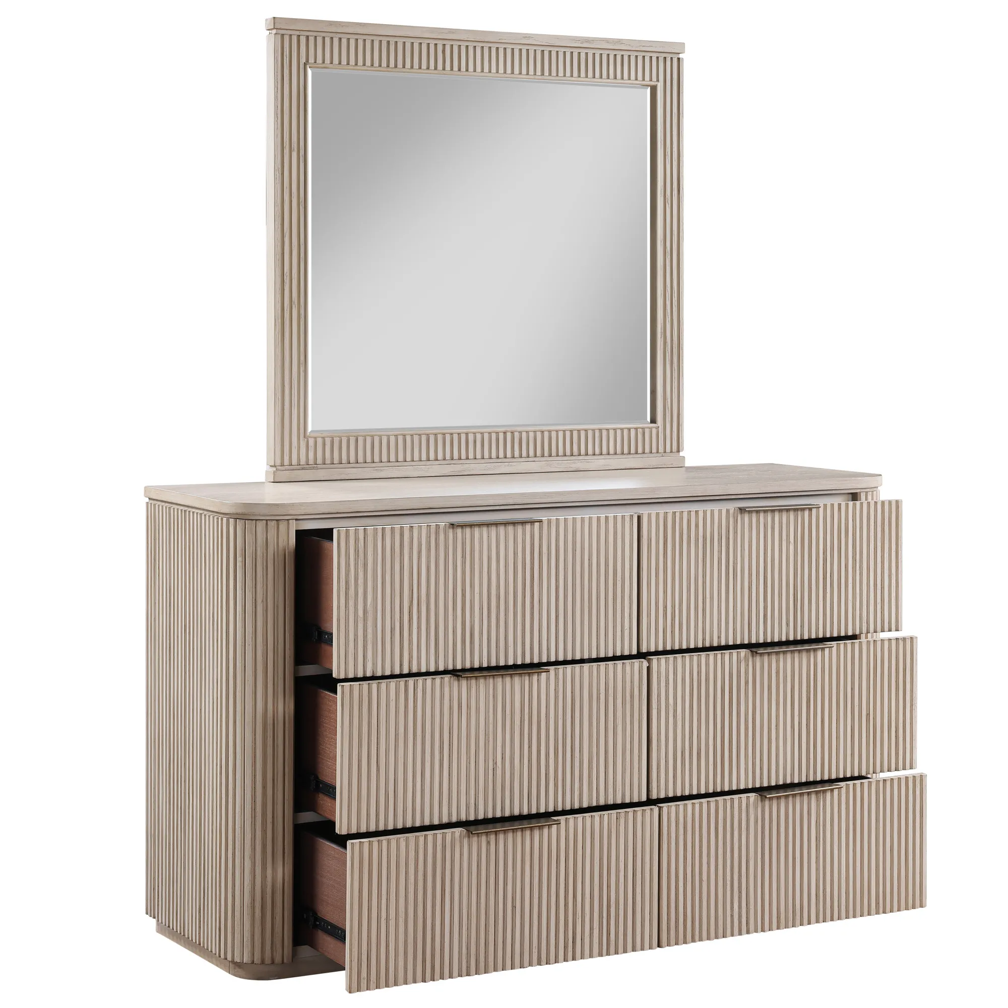 The Henry 65″ 6-Drawer Reeded Dresser and Mirror offers modern elegance and functional storage. Crafted from oak veneers, Asian hardwoods, and engineered woods, it features reeded surfaces, rounded corners, and a sturdy plinth base. Six spacious drawers, including a felt-lined top drawer, provide organized storage for essentials. Side metal glides ensure smooth operation, and safety stops prevent accidental drawer removal. The crystal-clear mirror offers a true reflection, completing a stylish and practical set that enhances any bedroom with sophistication and utility.