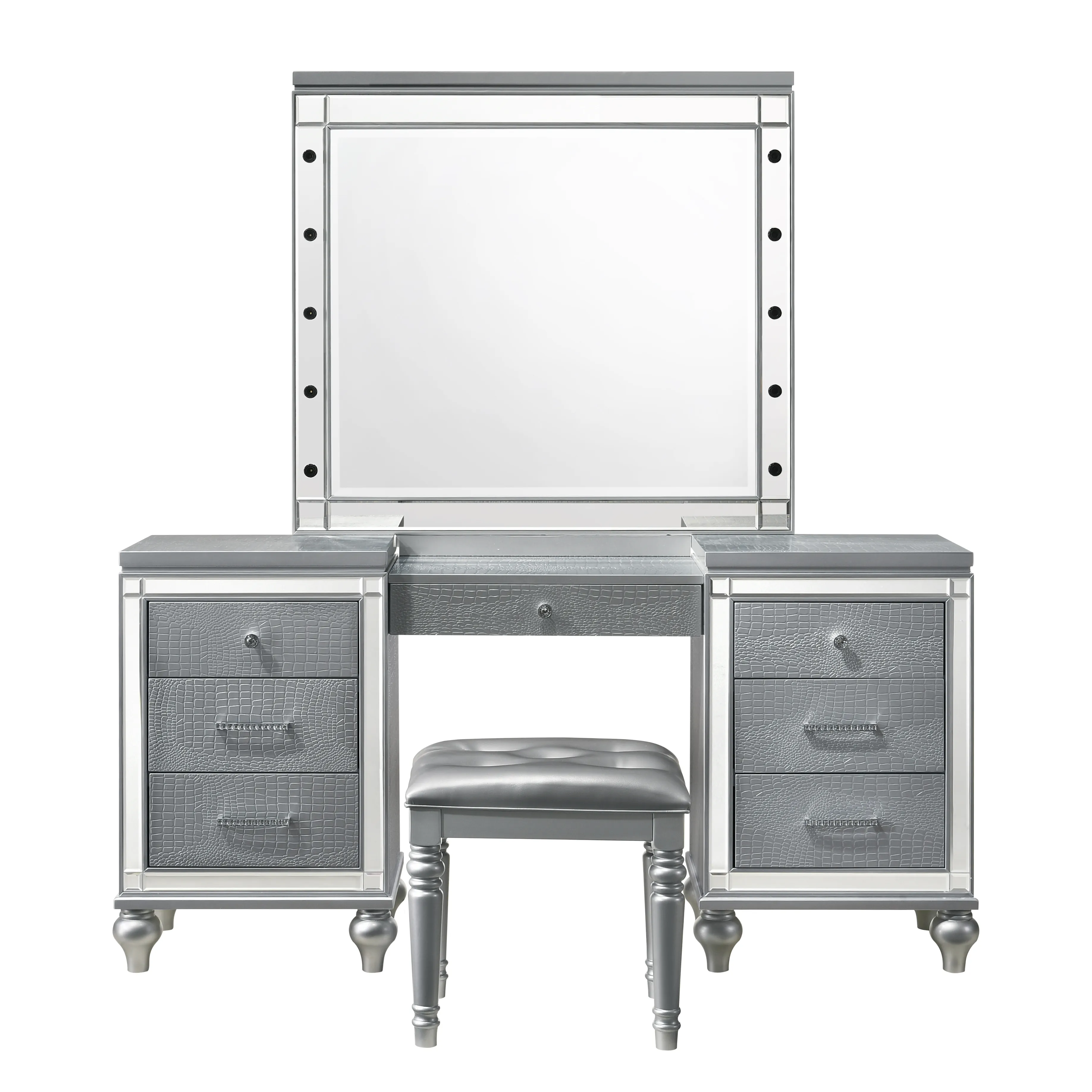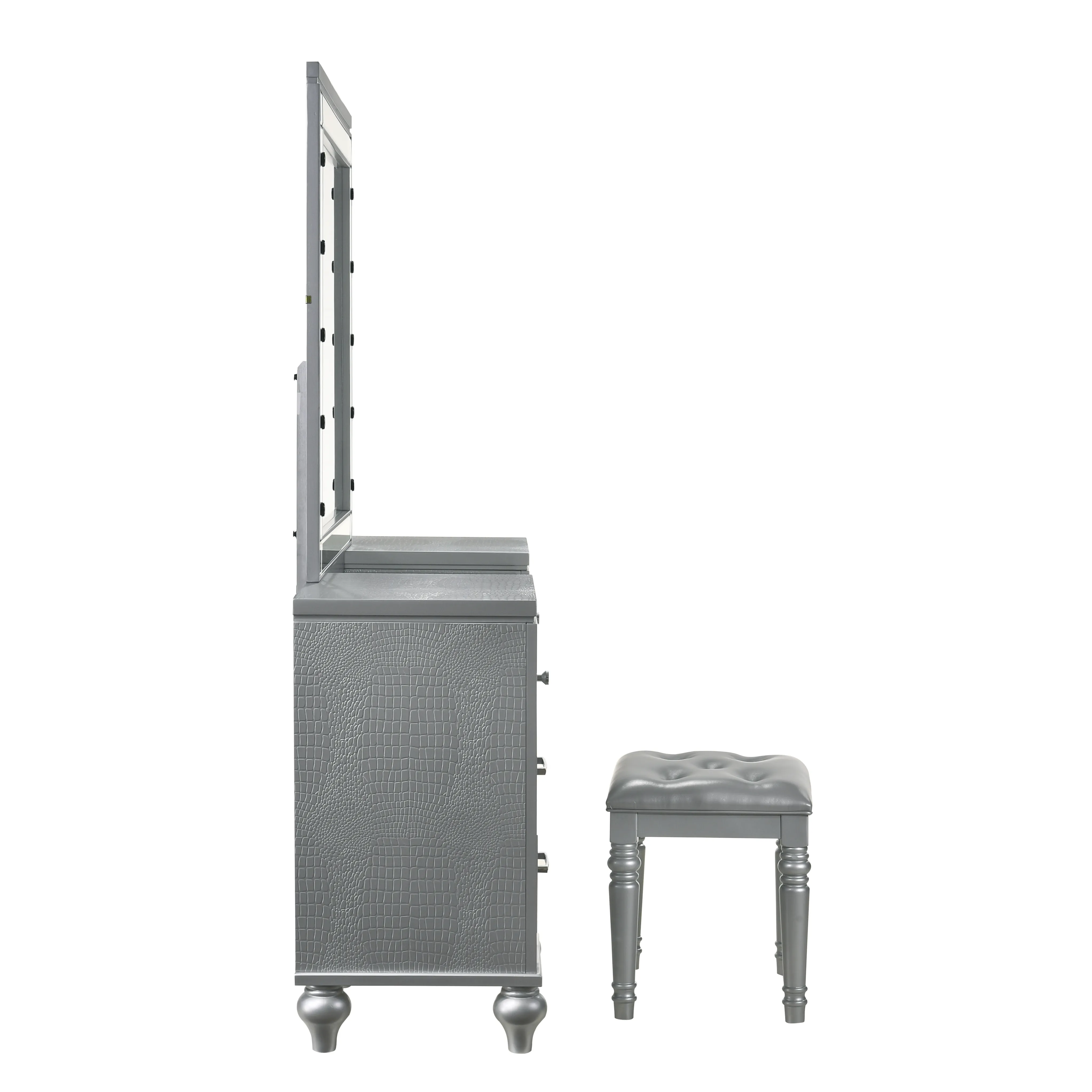 The Valentino 3 Piece Vanity Set in Silver is an elegant and functional addition to any bedroom or dressing area. This set includes a beautifully designed vanity table, a lighted mirror, and a matching stool. Crafted from a combination of manufactured and solid woods with decorative embossed inlays, this set promises durability and distinctive style. The gleaming Silver finish, mirrored trims, crystal-studded drawer pulls, and alligator embossed inlays evoke a Hollywood glam appeal. The mirror is designed to accommodate vanity lightbulbs (not included), adding a star dressing room vibe. The seven-drawer vanity table provides ample storage for cosmetics and accessories, including a velvet-lined drawer for jewelry. This exquisite set combines functionality with a touch of star quality, making it the perfect centerpiece for your glam routine.