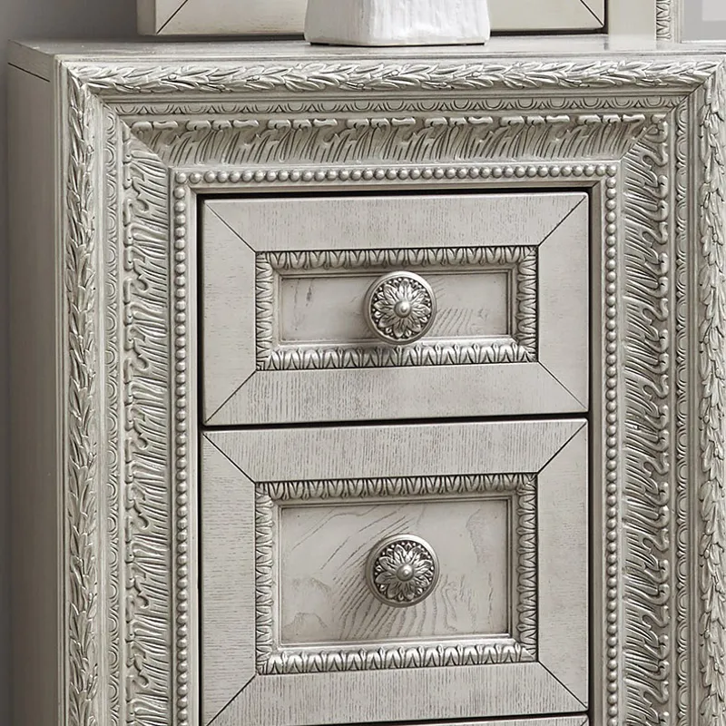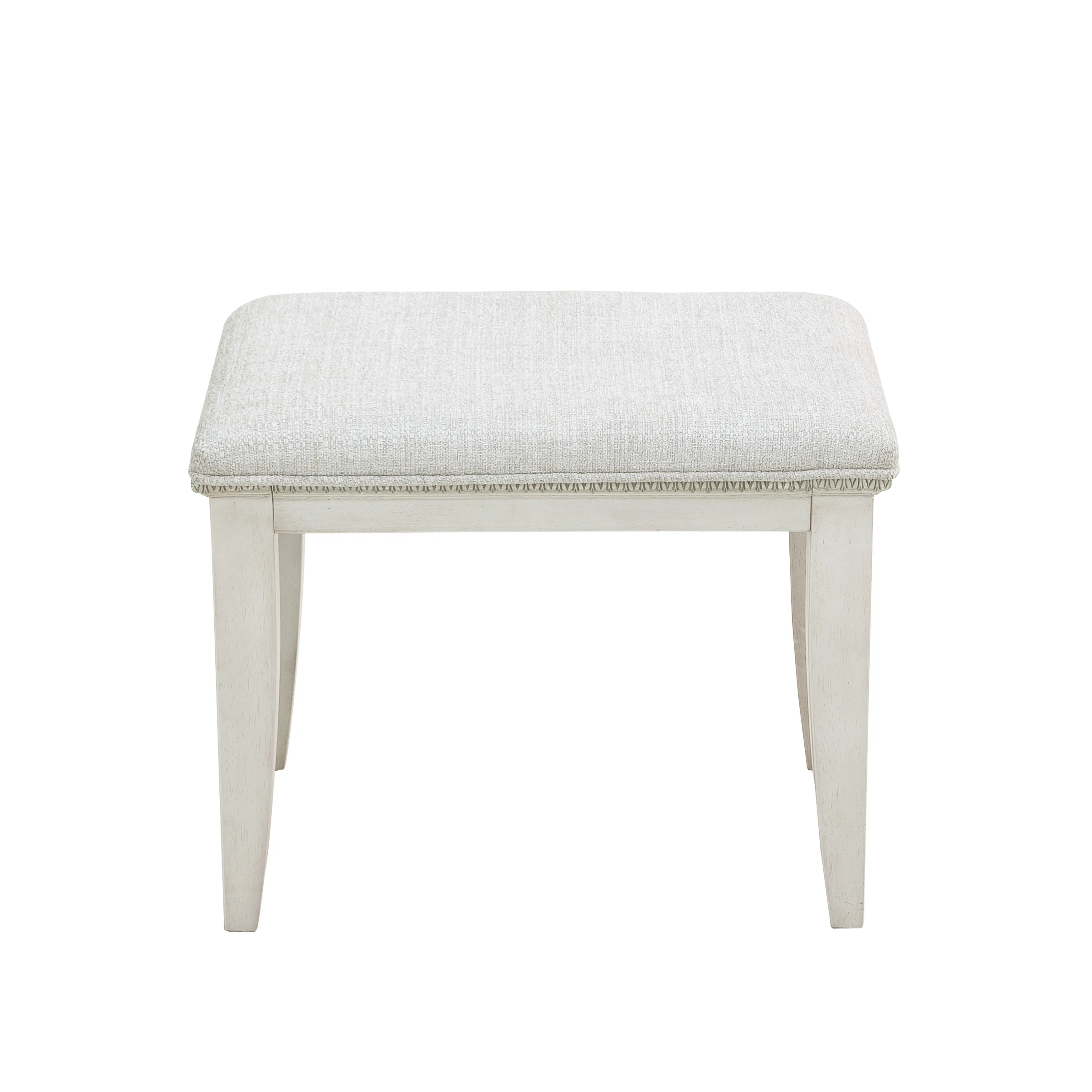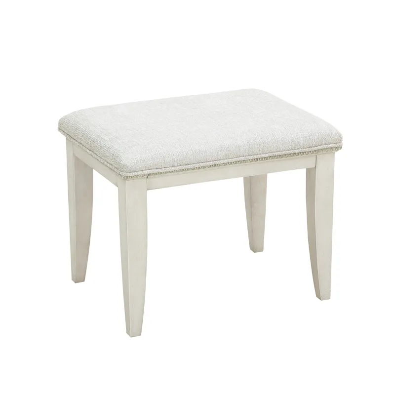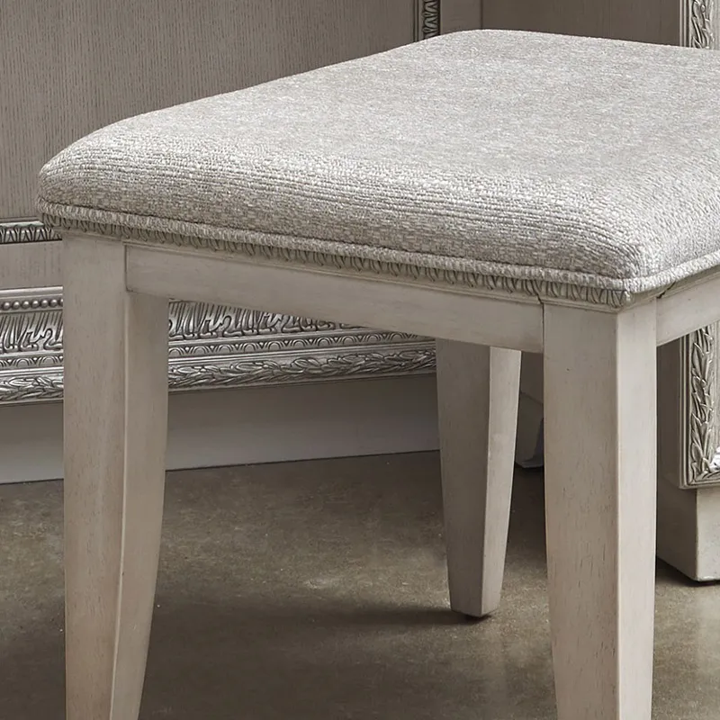 Add glamour and a personal pampering station to your bedroom with the romantic Camila Vanity and trifold vanity mirror. Silver-tipped intricate moldings create opulence, while the semi-transparent creamy white finish enhances the distinctive swirly ash veneer construction. Seven storage drawers are accented by rosette-shaped silver drawer pulls. The grand mirror has luxurious silver-tipped moldings as seen throughout the Camila Collection. The trifold design is ideal for multi-angle viewing, and each mirror is beveled. Vintage and inviting, the Camila Vanity Stool has silver-tipped intricate egg-and-dart molding beneath the welted seat cushion, upholstered in a soft cream texture. The creamy white finish enhances the distinctive swirly ash veneer construction of the base and legs.