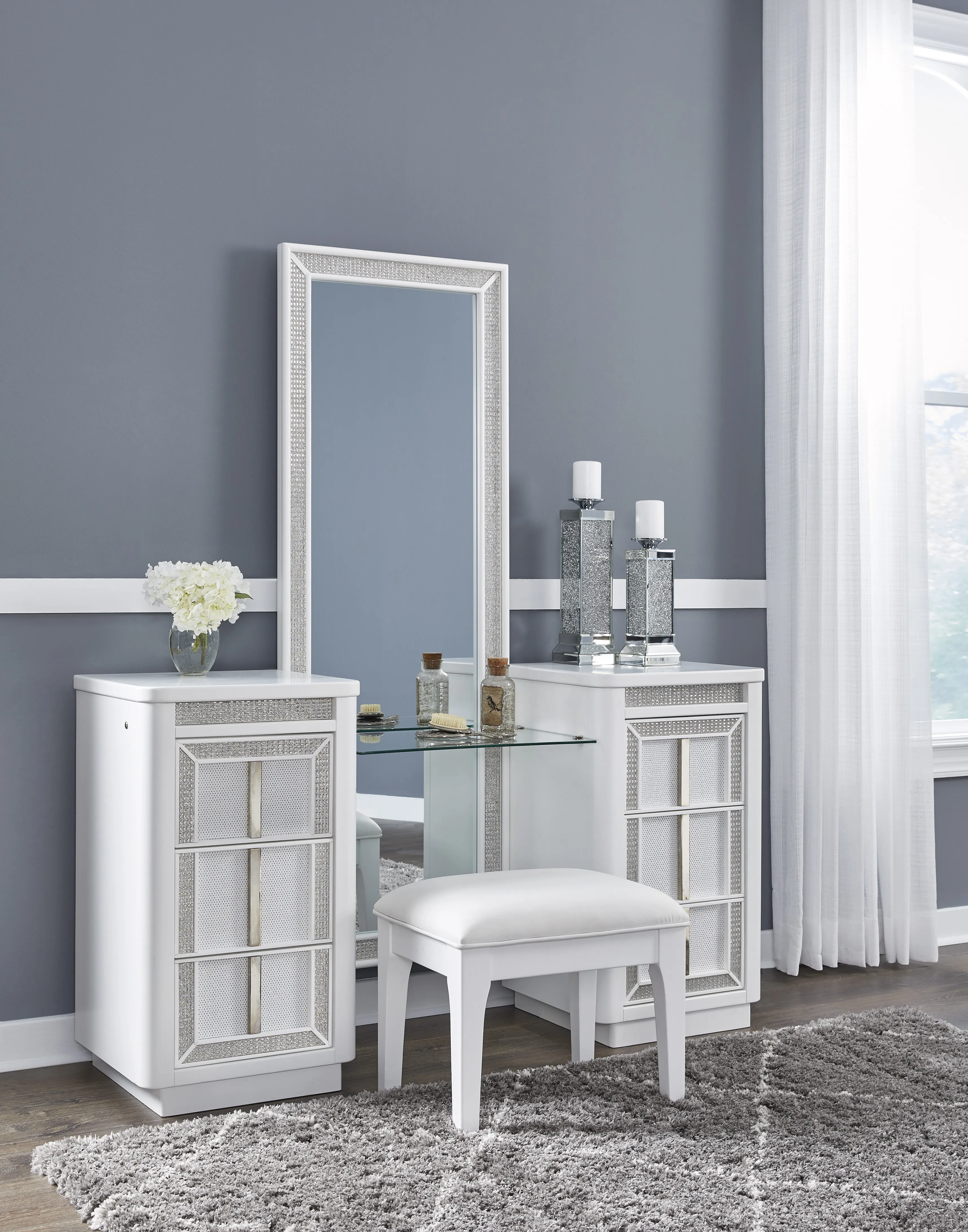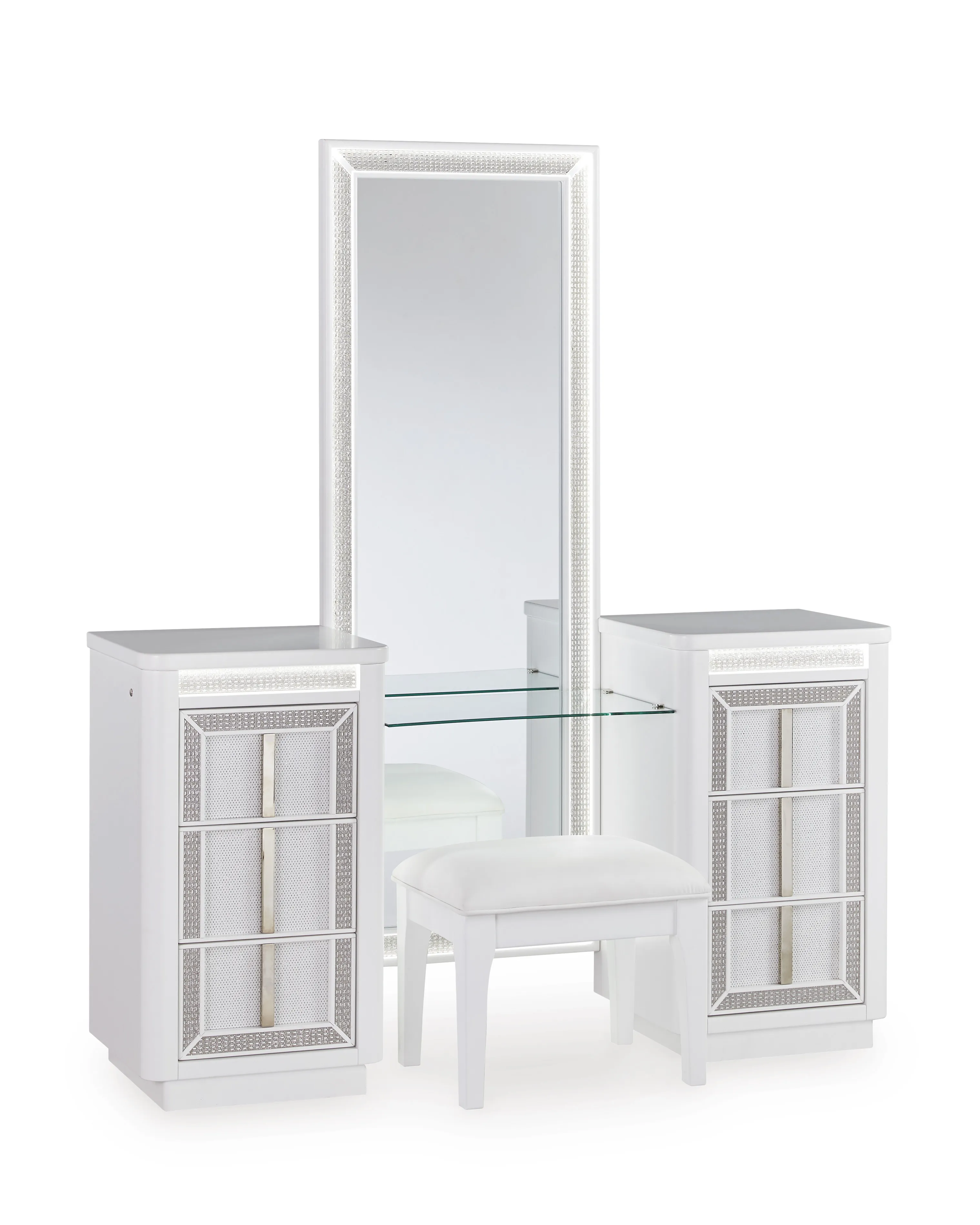 Transform your bedroom with this chic vanity and mirror. Its modern design and glamorous details create a sophisticated retreat. The built-in LED lighting and rhinestone-framed drawers and mirror add style and practical storage while reflecting elegance. Let your sanctuary shine—and never let anyone dull your sparkle.
