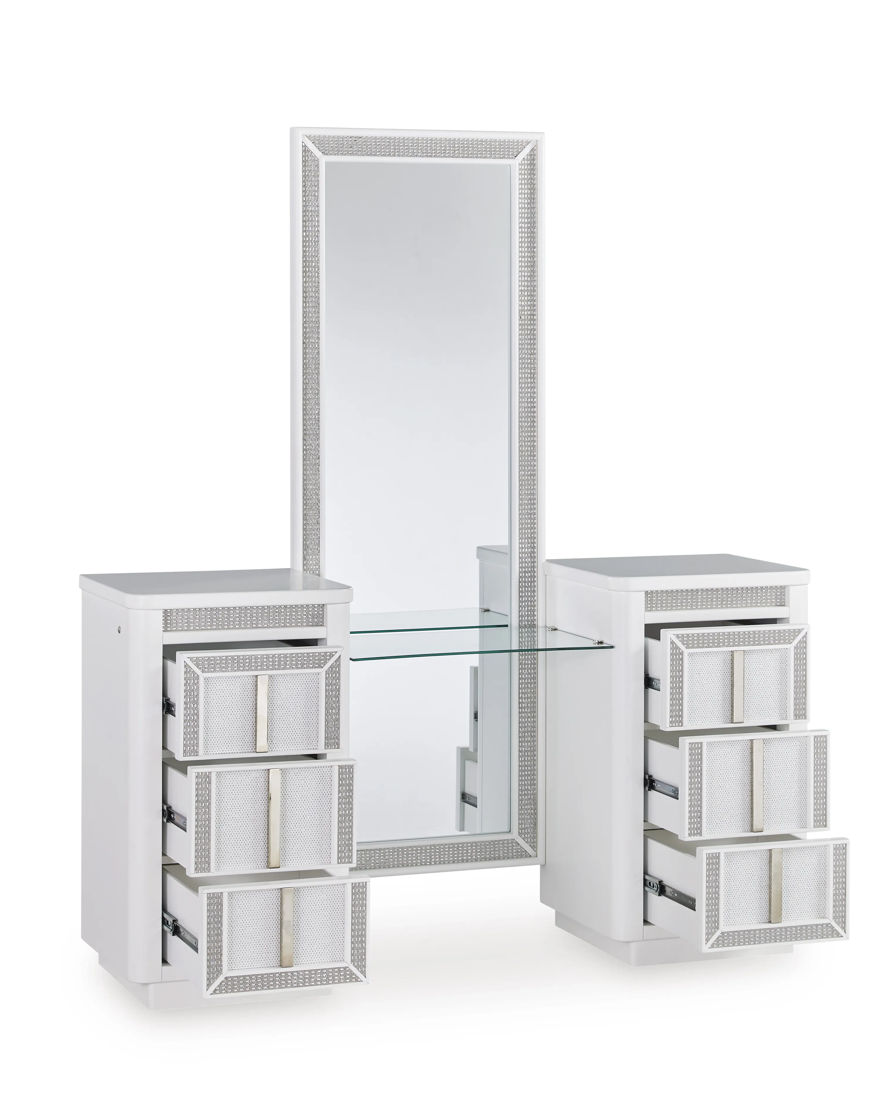 - Drawers with rhinestone frames; textured laminate drawer fronts