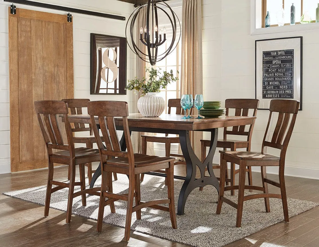 Industrial styling with cast metal accents and beautiful hardwood. The District pieces include one dining and one counter height table, dining chair and bench, counter height stool and functional sideboard. Unique designs can be seen throughout the group including table legs fashioned after an antique sewing machine. Comfortable curved back chairs and stools will invite your guests to stay just a little bit longer!
