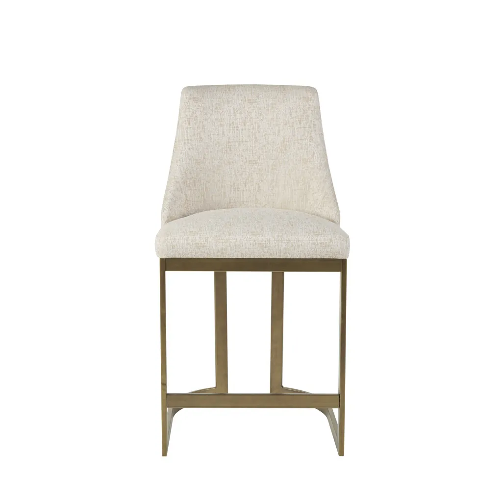 Bryce counter height stool from Madison Park combines modernity with traditional elegance. Its curved arms and rounded back exude style, while the cream-colored upholstery adds versatility. Crafted with a durable metal frame, it features high-density foam cushions for comfort. The antique gold finish metal base adds a touch of glamour, and adjustable plastic glides protect floors on any surface. Assembly required. Elevate your space with this chic and functional counter stool. Assembly required. Spot clean or steam clean upholstery.