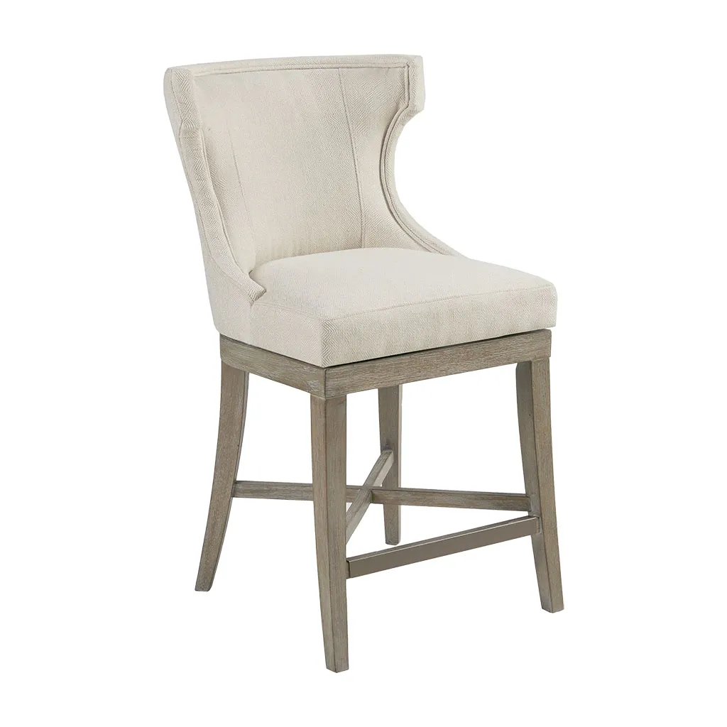 Define your dining area with the elegance of the Madison Park Carson Counter Stool with Swivel Seat. This pholstered wingback style counter chair features clean lines and curve, for a sophisticated silhouette. A bronze kick plate protects the footrest from every day wear and tear, while the swivel function allows you to easily rotate the seat. The straight rubber wood legs feature a smooth reclaimed grey wood finishes that complements the upholstery to create a beautiful transitional look in your dining room. Assembly is required. Max weight capacity: 300 lbs.
