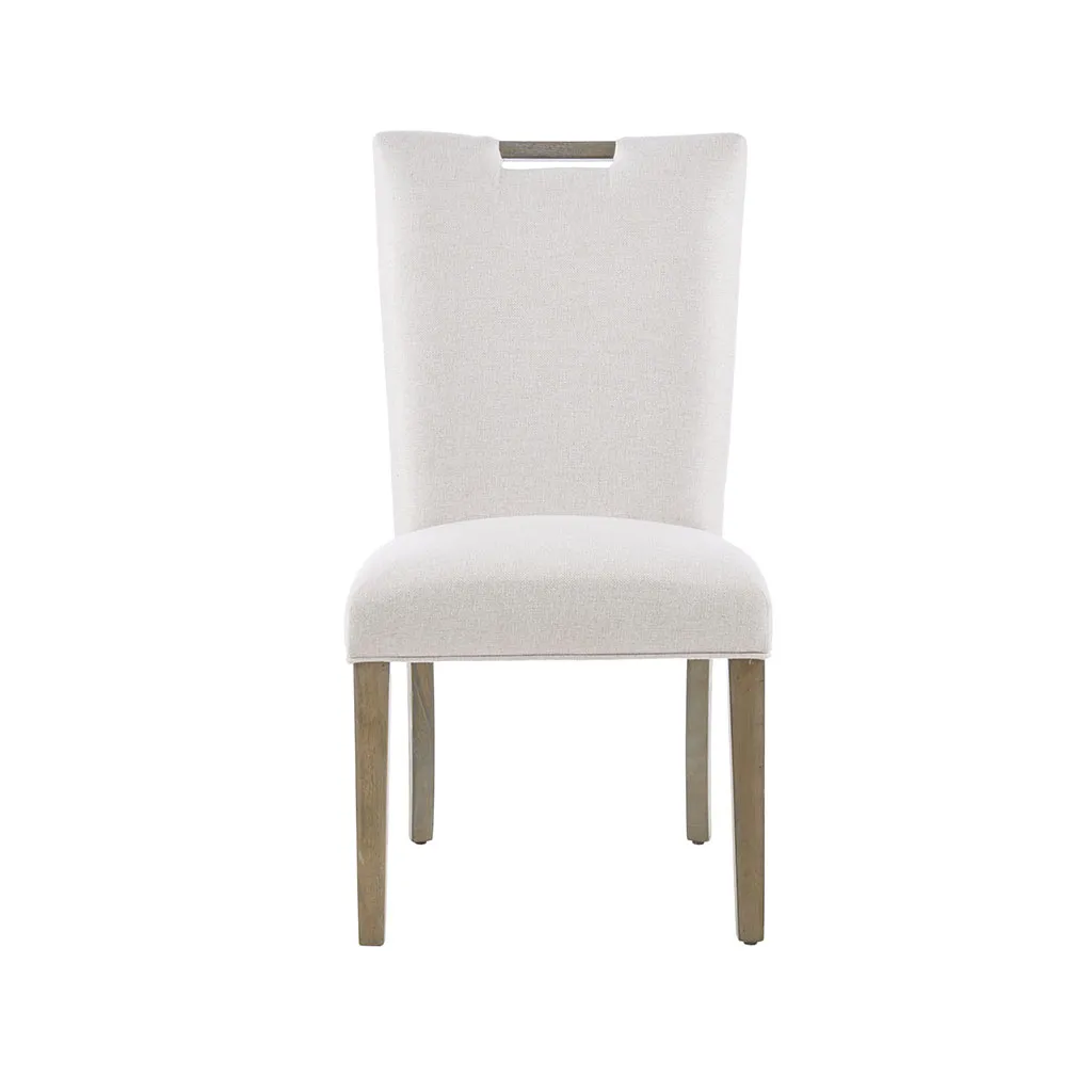 Complete your dining decor with the clean and elegant style of the Madison Park Braiden Dining Chair Set. These austere dining chairs flaunt natural hued upholstery on the rectangular seat and tight back, for an immaculate transitional look. The straight rubber wood legs provide exceptional support and feature a smooth reclaimed grey wood finish that pairs beautifully with the upholstery. An accent handle adorns each chair adding style, while also allowing for easy mobility. Available in a set of two, this dining chair set graces your dining room with its simple beauty. Assembly is required. Max weight capacity: 300 lbs.