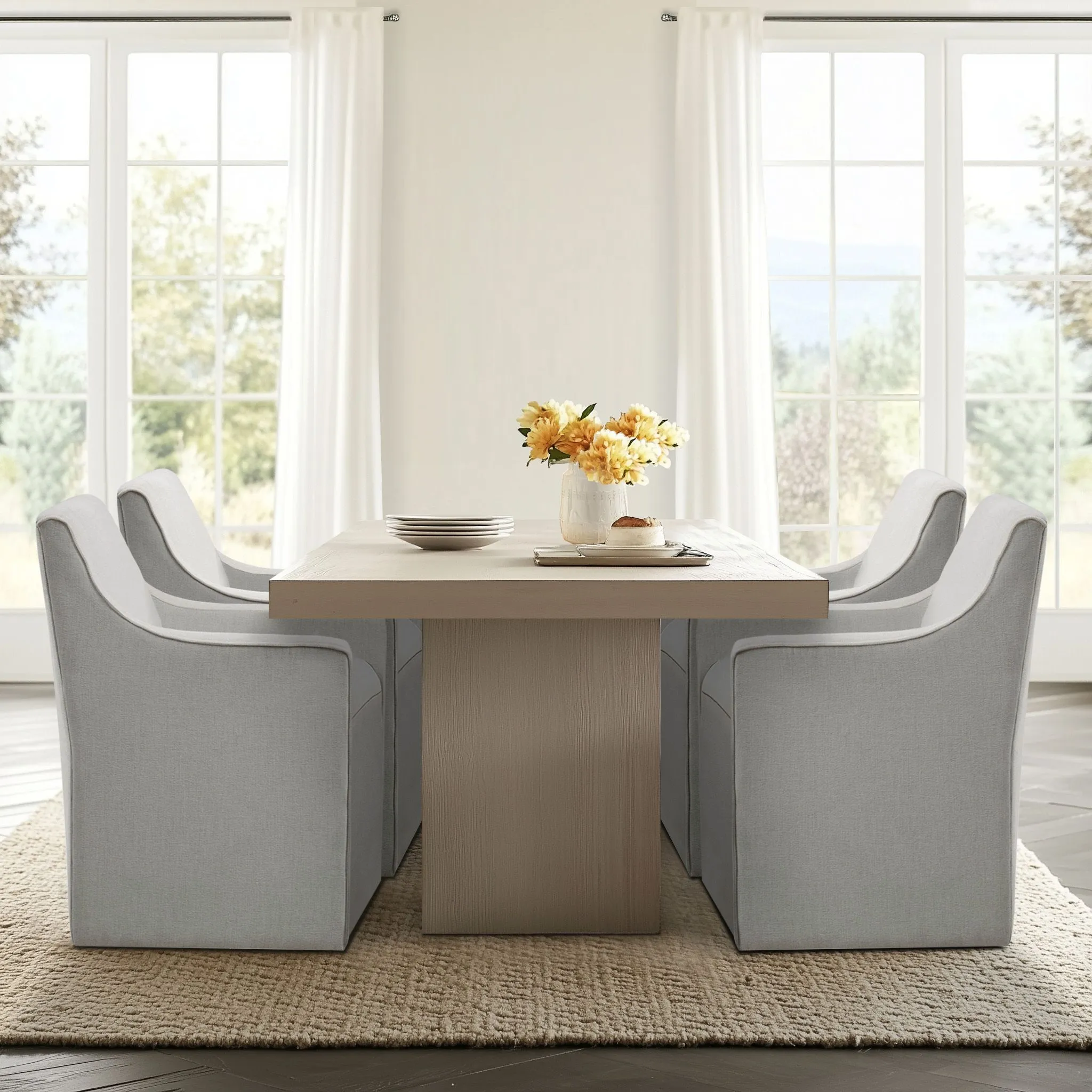 The Madison Park Charlotte Dining Chair blends timeless elegance with modern functionality. Designed to mimic the classic slipcovered look without the upkeep, this fully upholstered chair features clean lines, soft curves, and tailored detailing. Hidden rubberized casters provide smooth mobility, while the fully padded back, seat, and arms, along with a sinuous spring system, ensure superior comfort. A dual-layer foam cushion and sturdy plywood and solid wood frame offer lasting support. Perfect for modern, transitional, and classic spaces. Upgrade your dining room today!