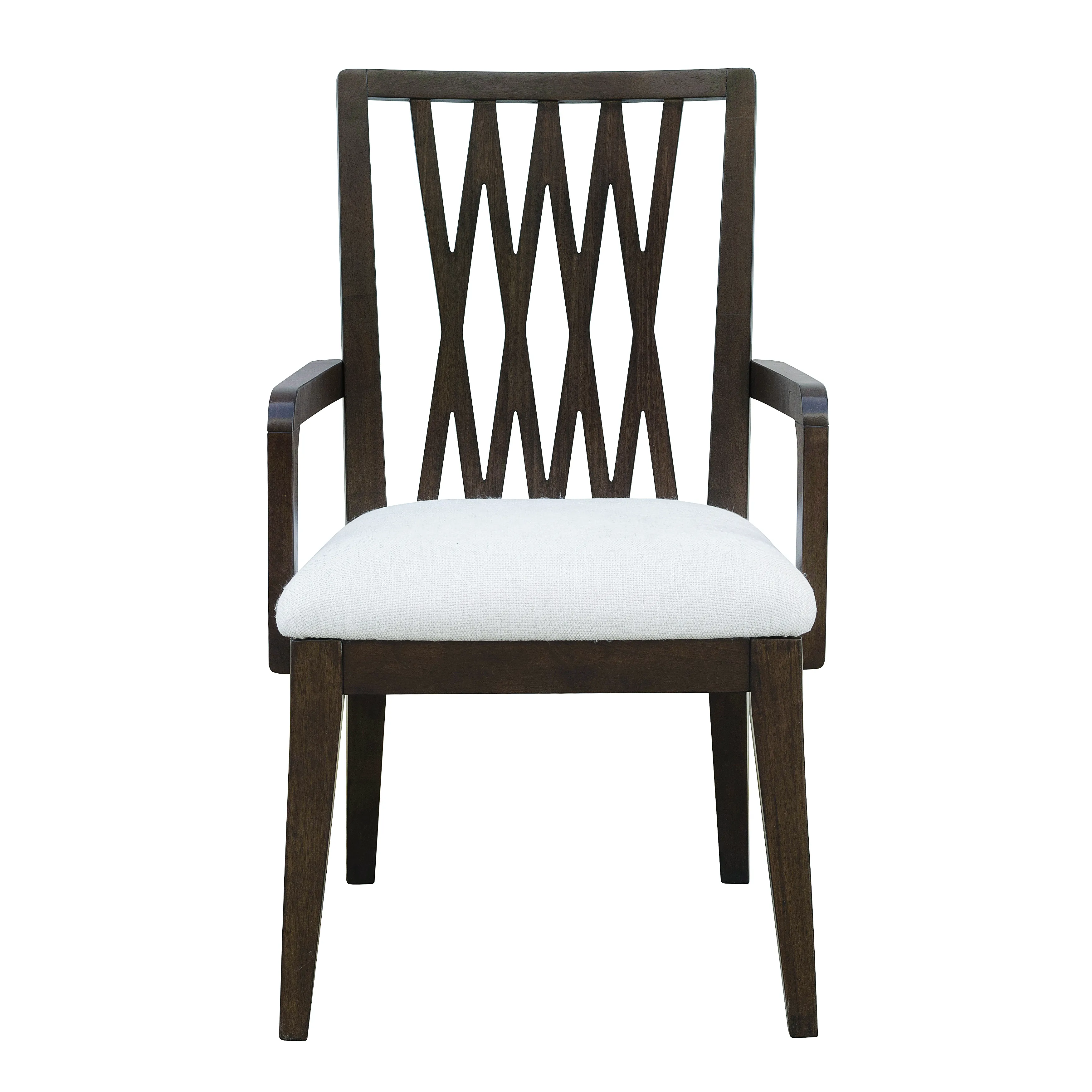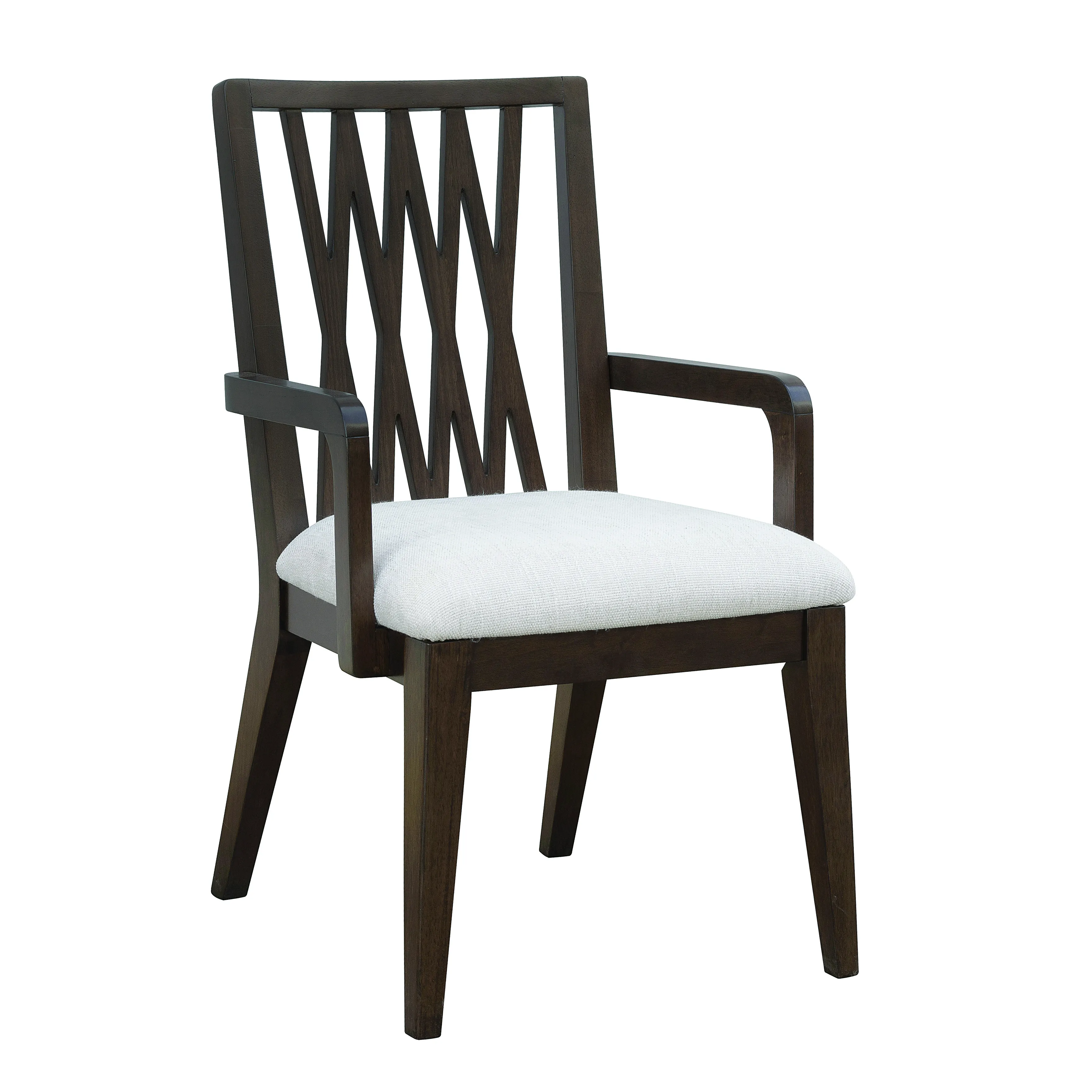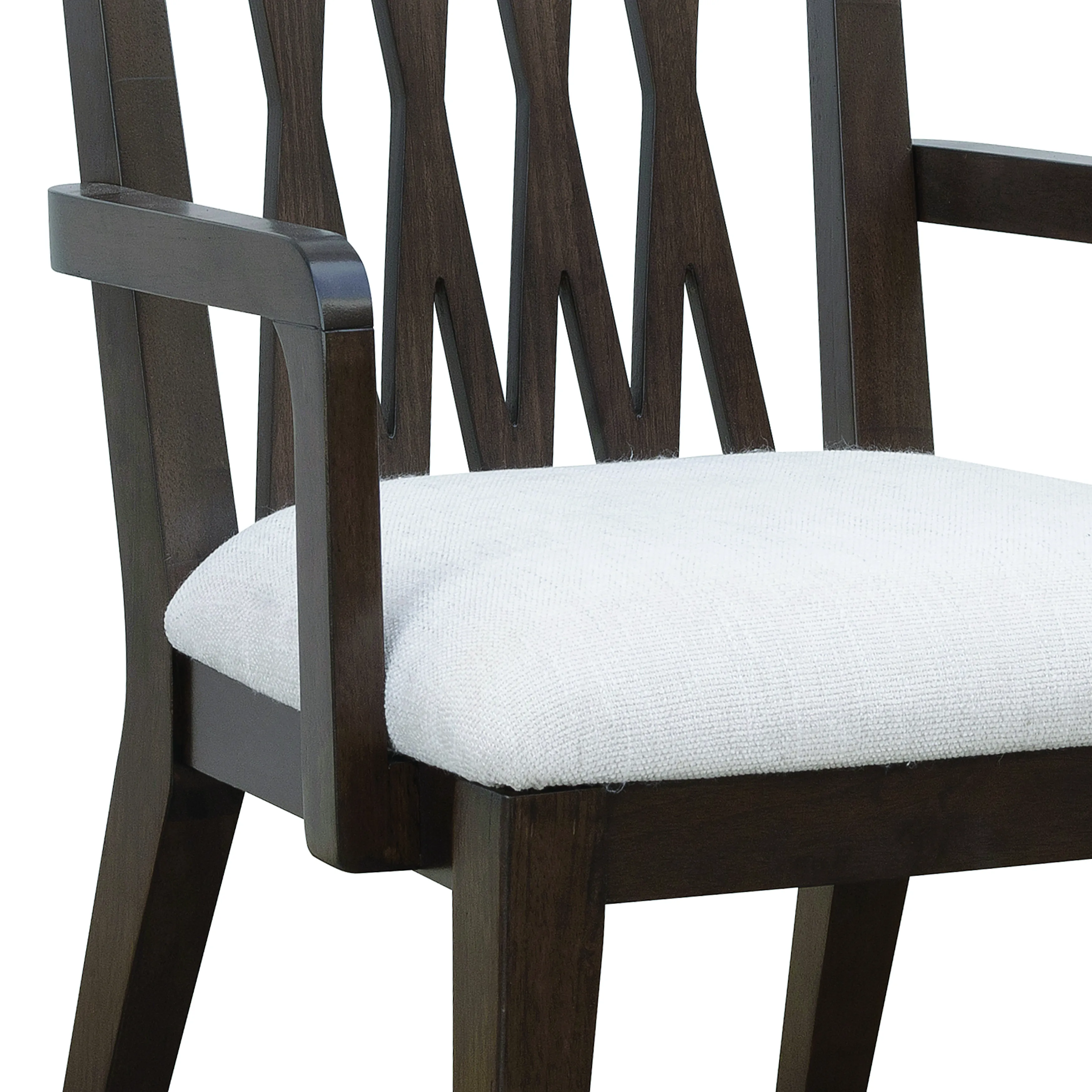 Bring timeless character and architectural elegance to your dining area with our Asher Park Wood Back Armchair. The openwork pattern on the seat back adds depth and dimension, while wooden arms and upholstered seat ensure comfort and support. Finished in a deep, polished Piano Brown tone and constructed with durable eucalyptus veneers, the chair stands on classic tapered wooden legs that enhance its formal appeal.