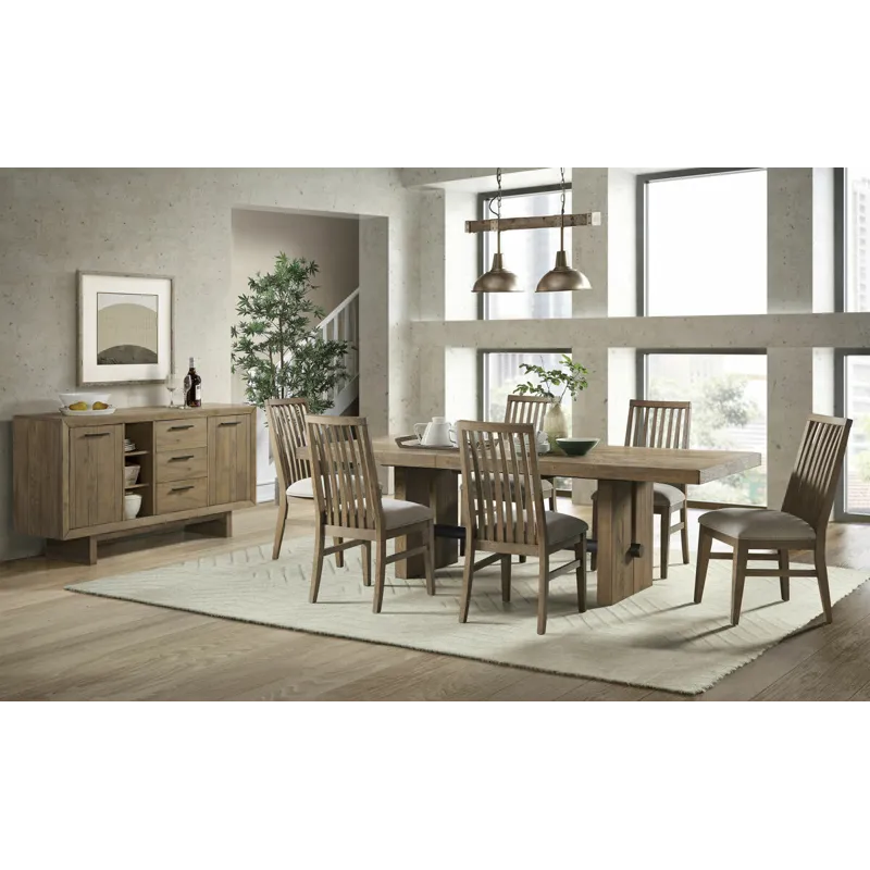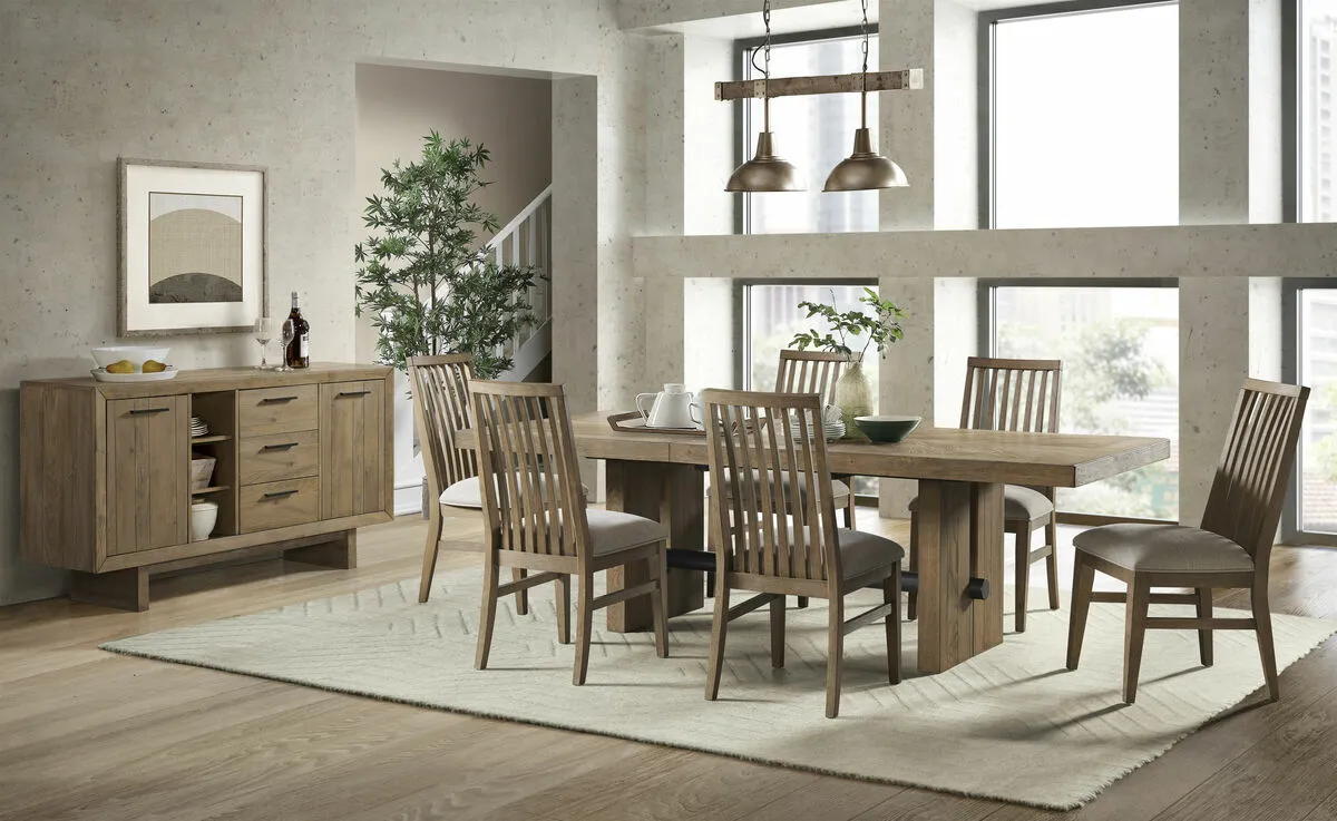 The Landmark Dining Collection has beautifully veneered table tops that feature a very unique sunburst pattern. The light saw mark accents and weathered oak finish gives this sleek modern collection a classic rustic feel. Mix and match this collection with the various chairs and bench seating options to best fit into your daily life.