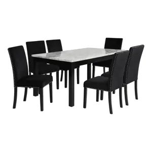 The Ava Dining Collection brings refined sophistication to any dining space. The sleek black table, crafted from solid Rubberwood and eco-friendly laminate, rests on striking stainless steel hairpin legs—an artful blend of strength and style. Designed to seat up to six, it’s ideal for elegant gatherings. The coordinating chairs, with chrome legs and plush black velvet upholstery, offer luxurious comfort and a chic, modern aesthetic.