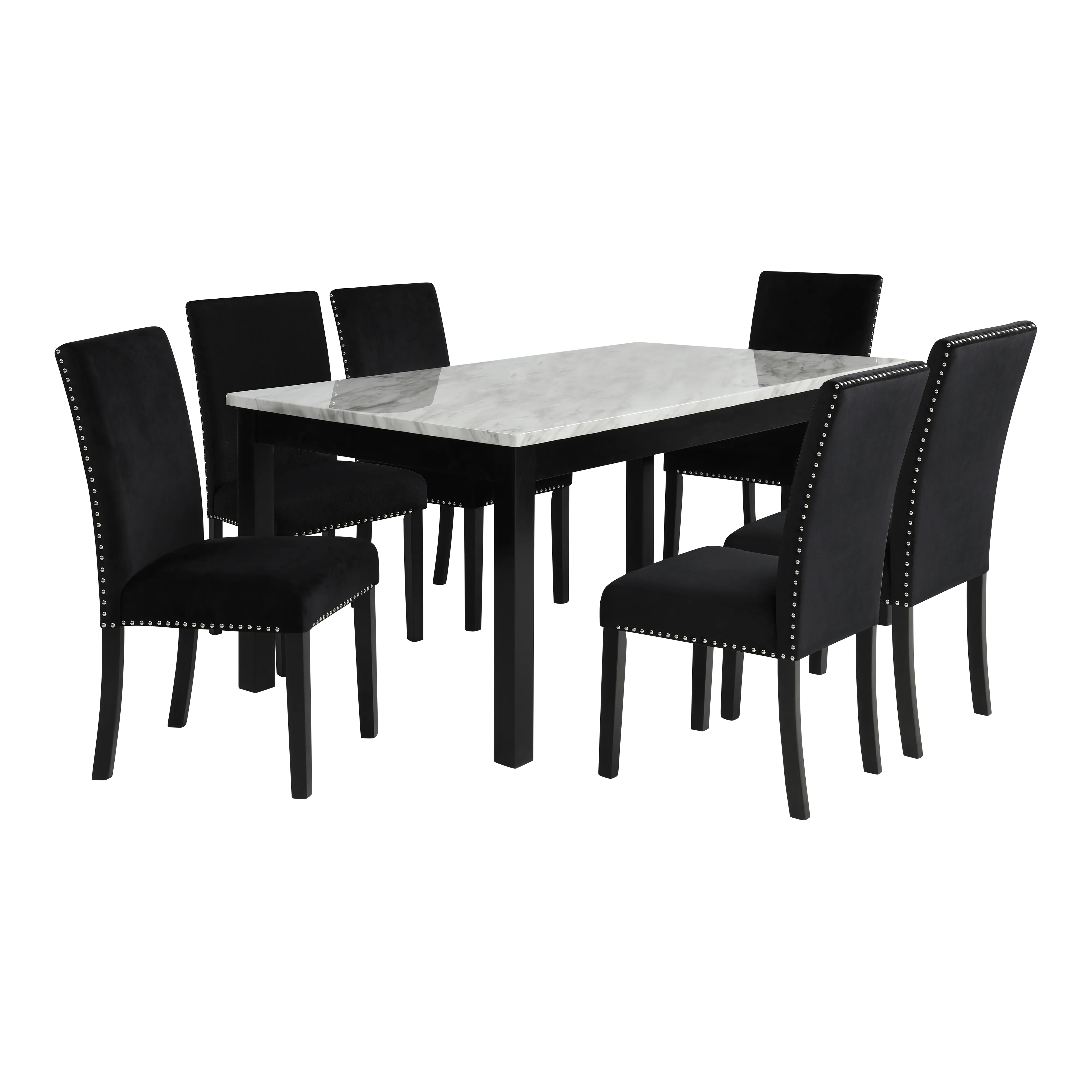 The Celeste 5-Piece Dining Set is a picture of modern luxury and enduring craftsmanship. This set includes a striking 64-inch dining table with an espresso base and a faux marble top, accompanied by six exquisite black velvet chairs. Crafted from solid Rubberwood and manufactured wood components, the dining set is designed for longevity, ensuring a timeless addition to your dining space. The glossy finish on the tabletop provides heat and water resistance, ensuring easy cleaning and protection from wear. The white and gray veined faux marble top, set against deep espresso legs, creates a contemporary and glamorous ambiance. Luxurious seating awaits with the soft and durable 100% polyester velvet fabric covering sumptuous memory foam cushions, offering both comfort and easy maintenance. Tailored for elegance, the rich and luxurious colors of the velvet chairs are enhanced by silver nailhead trim, providing a sparkling final touch to this impeccable dining set. Enjoy the fusion of contemporary glamour and enduring quality with the Celeste dining collection.