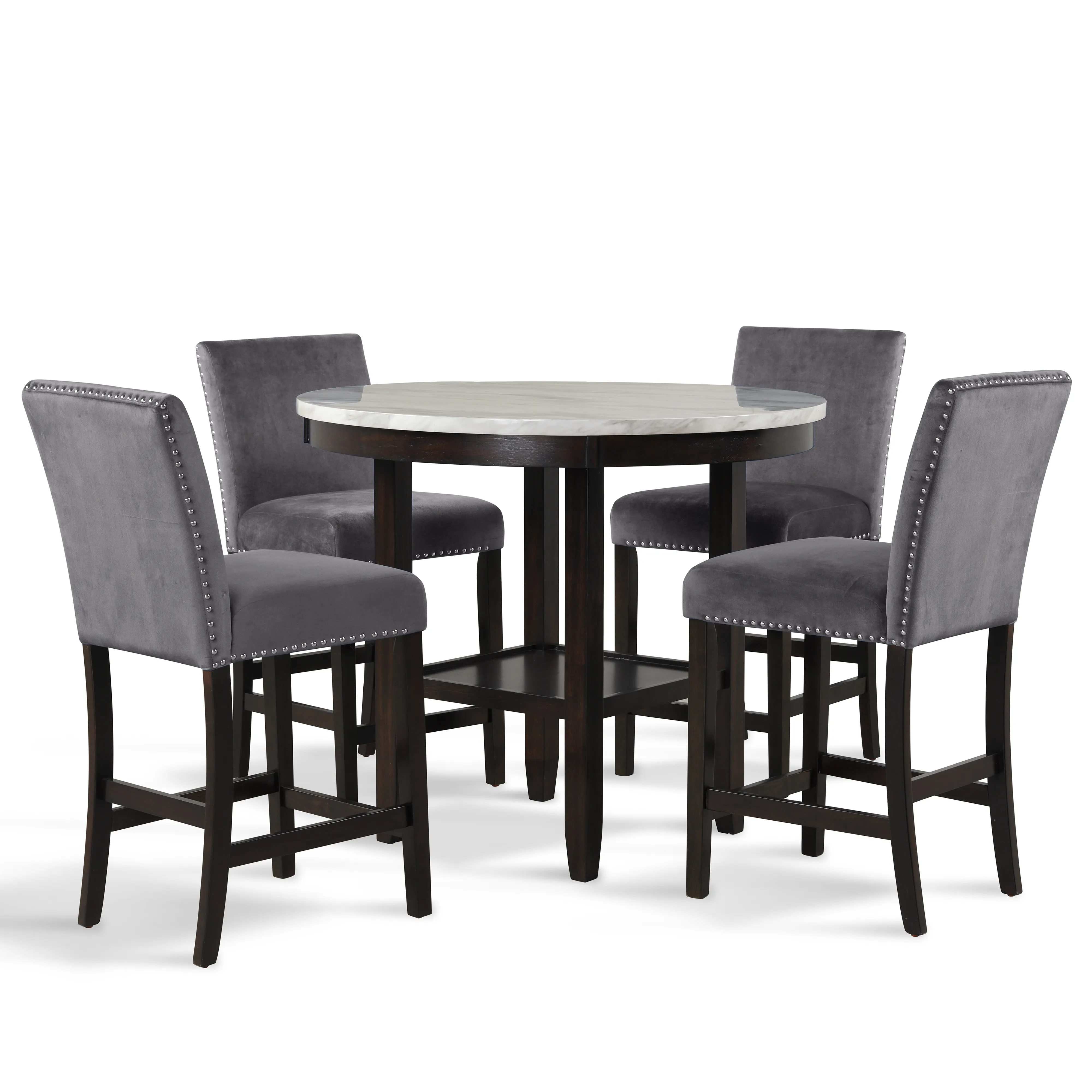 The Celeste 5-Piece Counter Dining Set is an exquisite combination of modern sophistication and enduring craftsmanship. This set includes a chic 42-inch counter table with an espresso base and a faux marble top, accompanied by four stunning gray velvet chairs. Crafted from solid Rubberwood and high-quality manufactured wood components, the dining set is designed for longevity, ensuring a lasting addition to your dining space. The glossy finish on the tabletop provides both heat and water resistance, ensuring easy cleaning and protection from wear. The white and gray veined faux marble top, complemented by deep espresso legs, creates a contemporary and glamorous ambiance. Luxurious seating awaits with the soft and durable 100% polyester velvet fabric covering sumptuous memory foam cushions, offering both comfort and easy maintenance. The stability of the counter chairs is enhanced by four base stretchers, which double as convenient footrests. Tailored for elegance, the rich and luxurious colors of the velvet chairs are enhanced by silver nailhead trim, providing a sparkling final touch to this impeccable dining set. Elevate your dining experience with the Celeste counter dining set—a fusion of contemporary glamour and enduring quality.