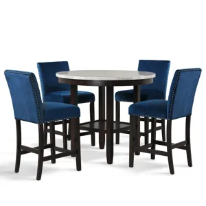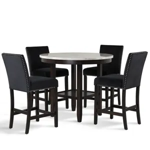 The Cori Dining Set is a stylish and functional addition to any home. It includes a round dining table and four chairs, all made from a combination of Mindy and rubberwood solids and veneers. This material provides a sturdy and durable foundation for the set, while also adding a touch of warmth and natural beauty to the design. The set is available in four distinct colors: cherry, gray, two tone bisque/brown, giving you the opportunity to choose the one that best matches your personal style and decor. Each chair is upholstered in 100% polyester fabric for a comfortable seating experience, and the round table is perfect for intimate dinners or casual meals with friends and family. The set is also available in a counter height option, allowing you to choose the one that best fits your space. Overall, the Cori Dining Set is a versatile and stylish choice for any dining room.