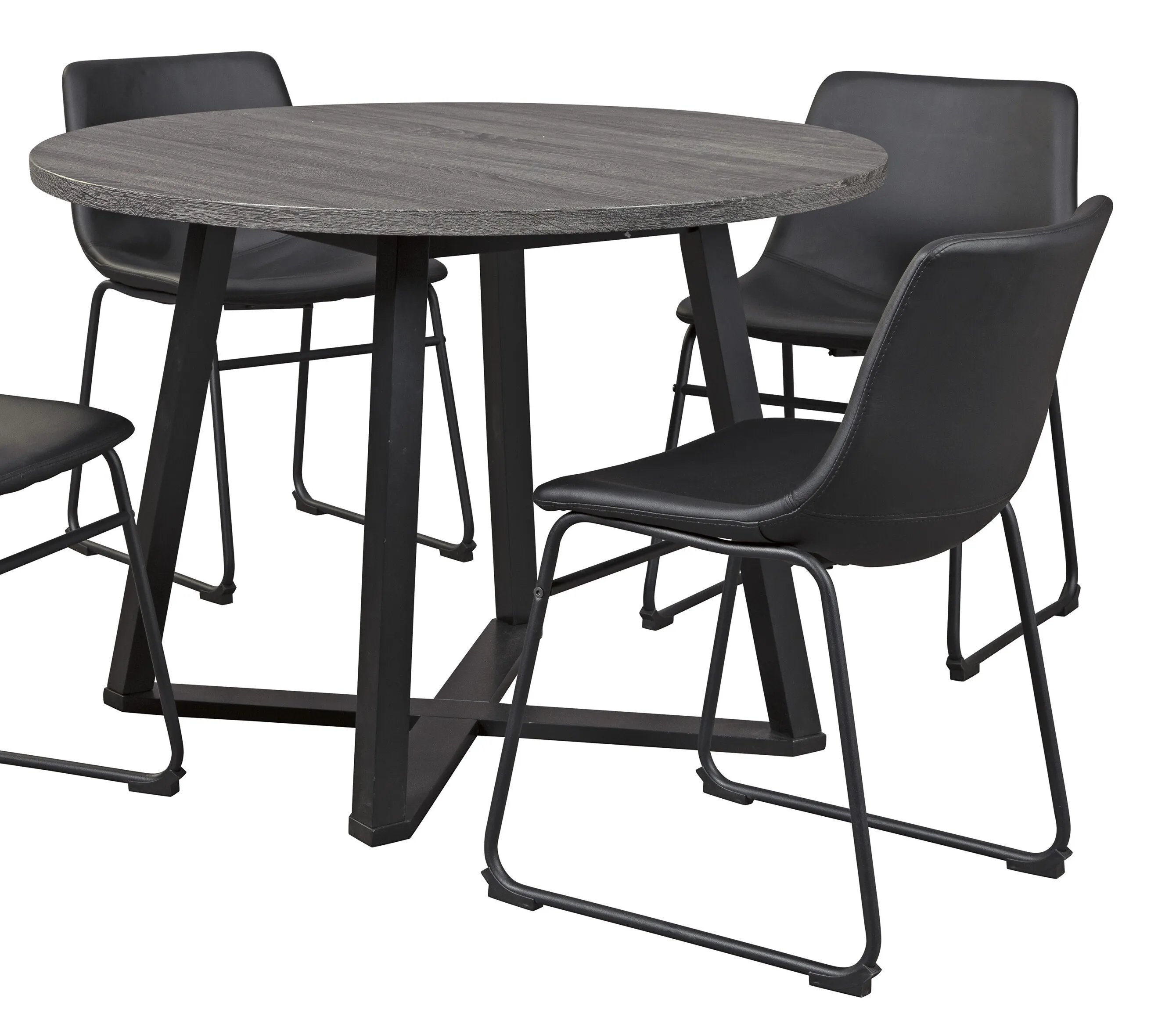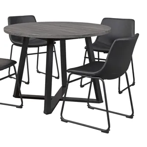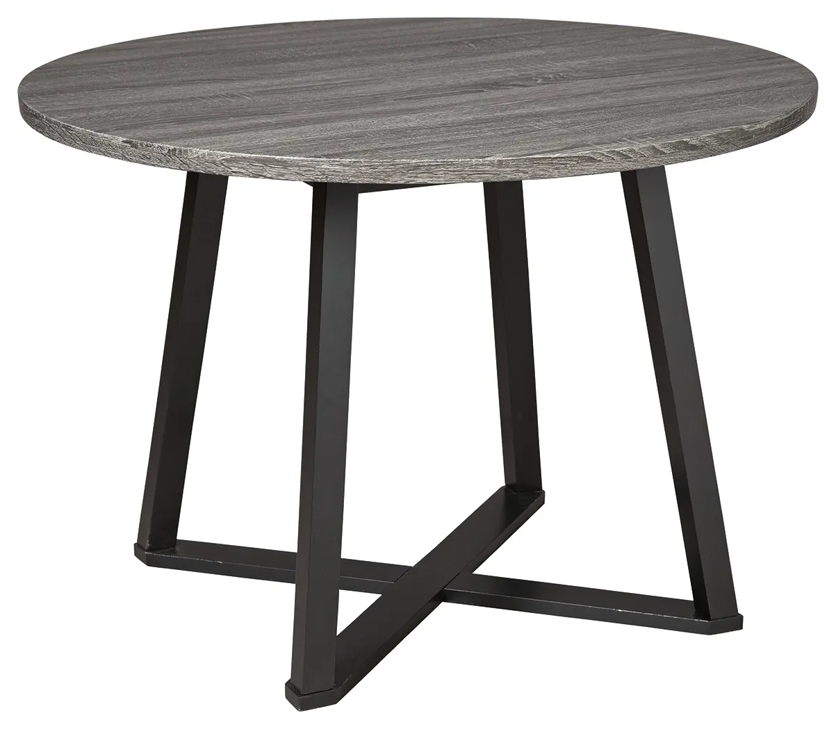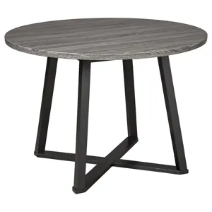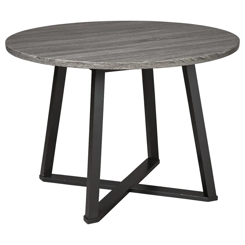 Centiar Dining Room Table: With its distinctive X-shaped metal base, this round dining table serves up a fresh twist on mid-century inspired style. Its mixed material and two-tone aesthetic are beautifully in balance. Sporting a dramatic charcoal gray hue, the top is crafted of durable melamine allowing it to weather years of family thrills and spills. 42 x 42 x 30