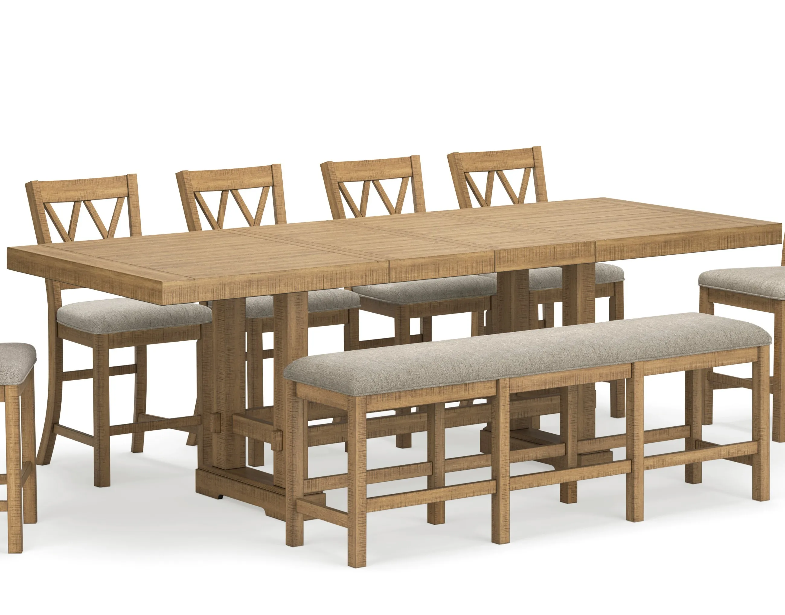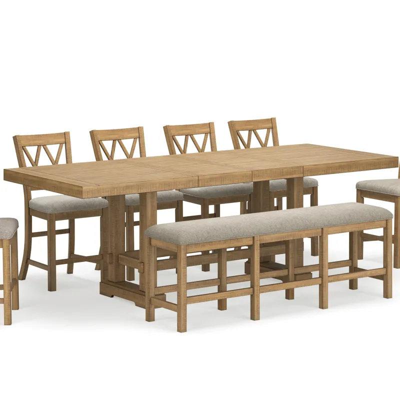 Havonplane Counter Height Dining Extension Table (D773-32): 108 x 42 x 36 - This counter height dining table is a favorite for casual rustic interiors. Offering plenty of seating space, it’s your answer for everyday living and impromptu guests. And the distressed pine finish, double trestle base and two extension leaves? Deliciously charming and versatile. Made with rubberwood solids, distressed pine veneers and MDF substrates, Distressed light brown pine finish, Double trestle base, Seats up to 10, 2 removable center leaves, Table extends by pulling both ends and dropping in leaf, Solid wood stretcher, Assembly required.