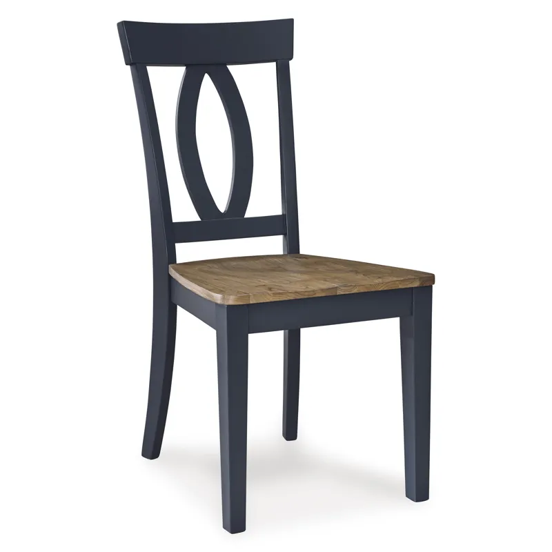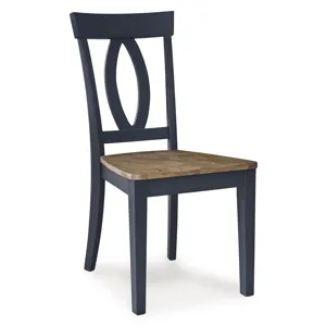 Landocken Dining Chair x2 (D502-01): 16.75 x 21 x 37.75 - This side chair satisfies your hunger for affordable, on-trend style. A two-tone finish elevates the casual design with modern appeal. Settle into the contoured seat and lean on the stylized back. Whether this chair is used for dining in, playing a board game or working from home, your comfort is its top priority. Made with hardwood solids, mindi wood veneer and MDF substrates, Light brown wood-tone seat, Dark slate blue frame, Softly contoured seat, Front legs with adjustable levelers, Assembly required