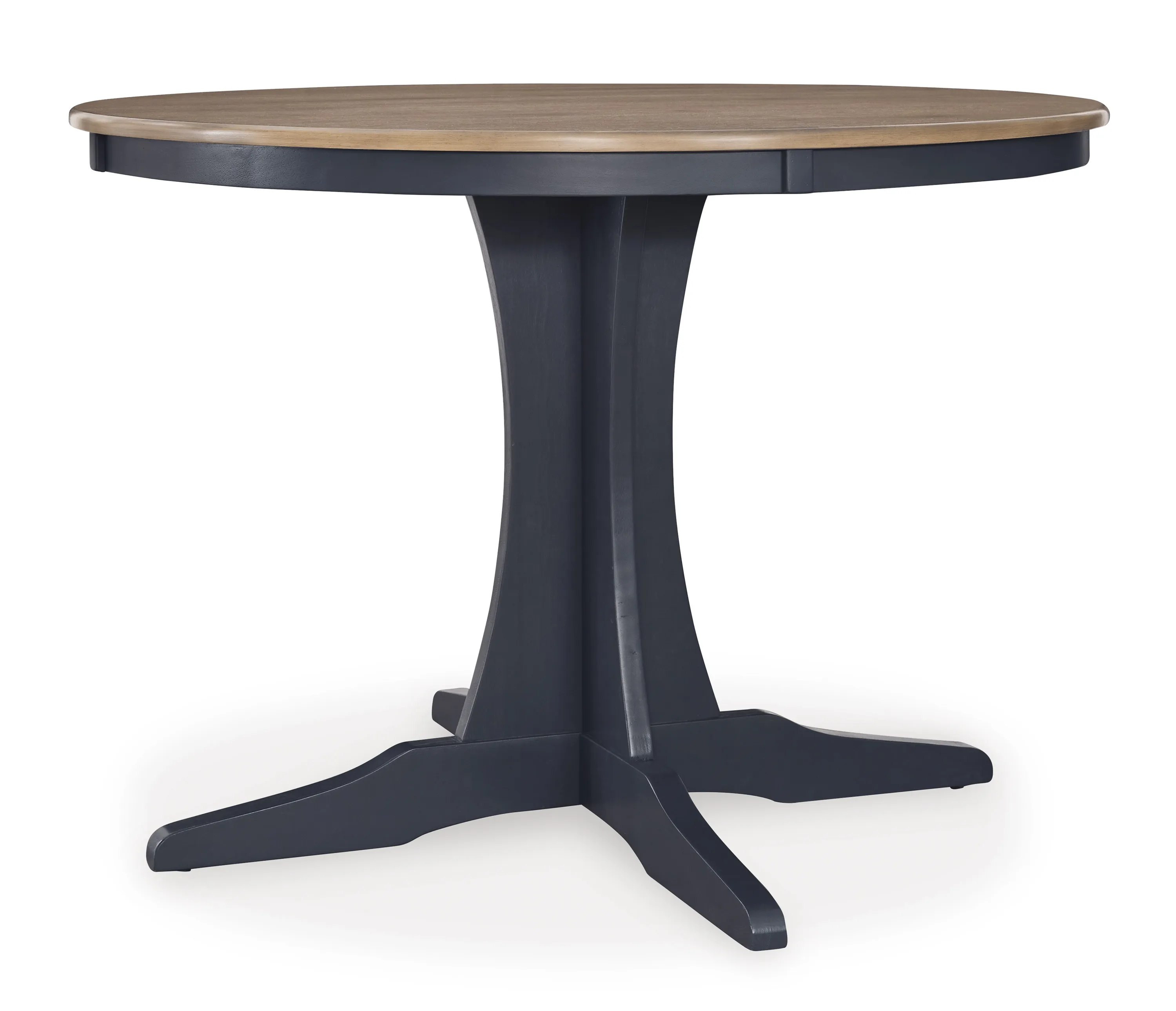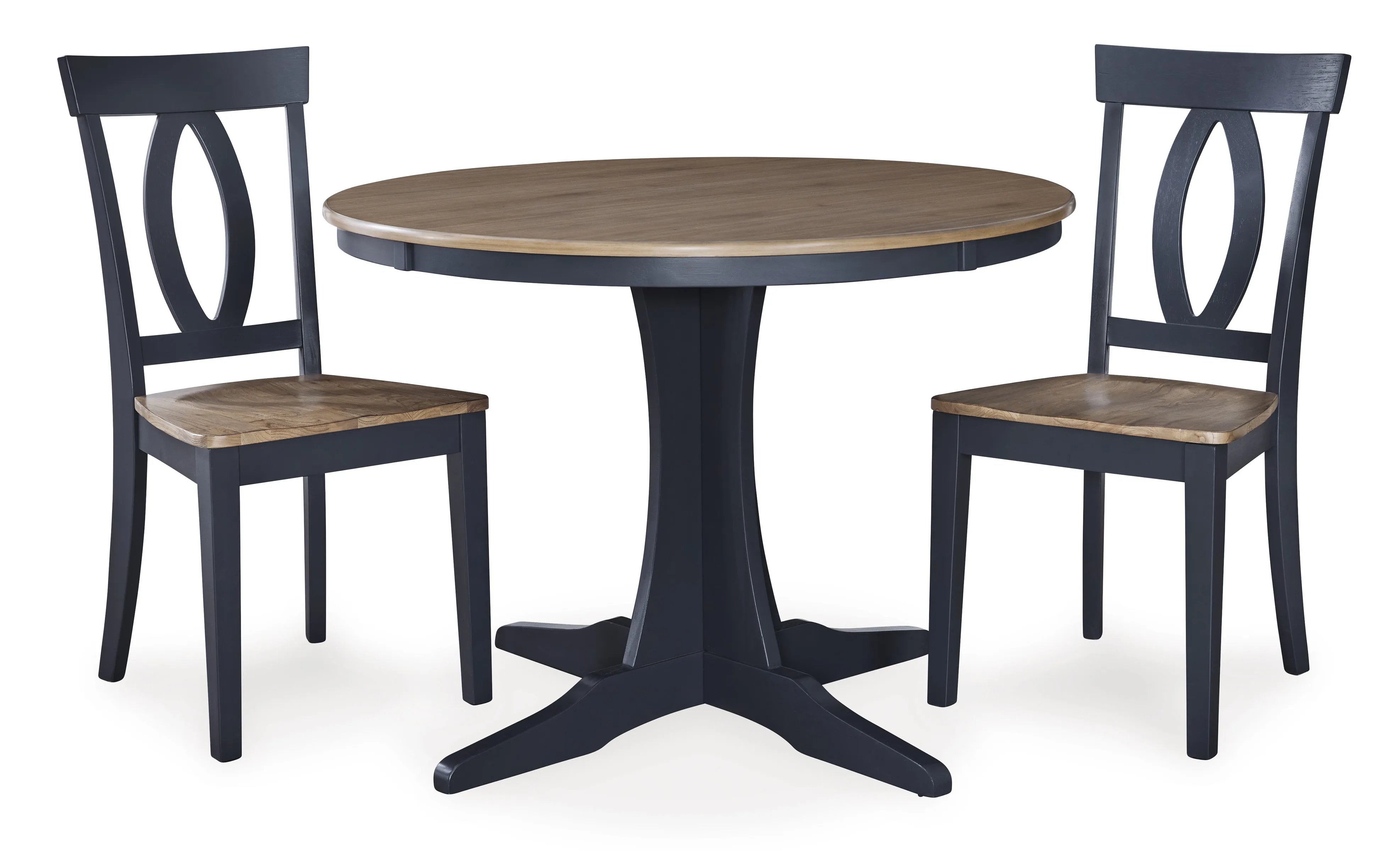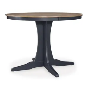 Landocken Dining Table (D502-15) 42 x 42 x 30 - This dining table satisfies your hunger for affordable, on-trend style. A two-tone finish elevates the casual design with modern appeal. Short on space? This table is designed to complement apartments and smaller homes. It's a fashionable solution for dining in, playing a board game or working from home. Made with hardwood solids, mindi wood veneer and MDF substrates. Light brown wood-tone top, Dark slate blue base, Legs with adjustable levelers, Seats up to 4, Assembly required
