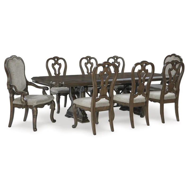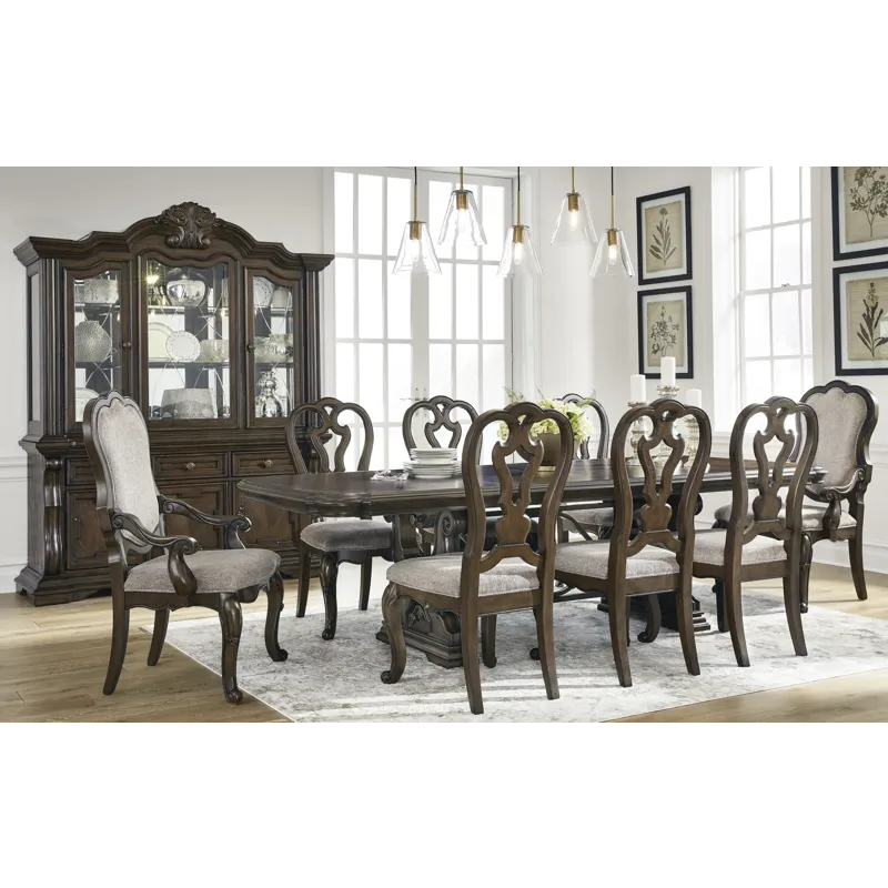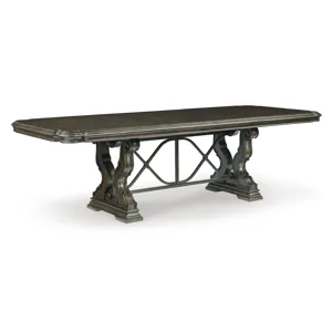 Maylee Dining Extension Table (D947D5): 44" W x 108.38" D x 30" H - From its ornamental appliques to its large scale, this dining extension table makes a bold statement. With a shapely tabletop that sits upon a double pedestal base, the opulent piece wows with stunning style. The look is timeless. The feel? Right at home. Made with hardwood solids, oak and ash swirl veneers, MDF substrates and cast resin components, Dark brown finish, Double pedestal base, Removable center leaf, Table extends by pulling both ends and dropping in leaf, Shaped metal stretcher bar, Seats up to 8