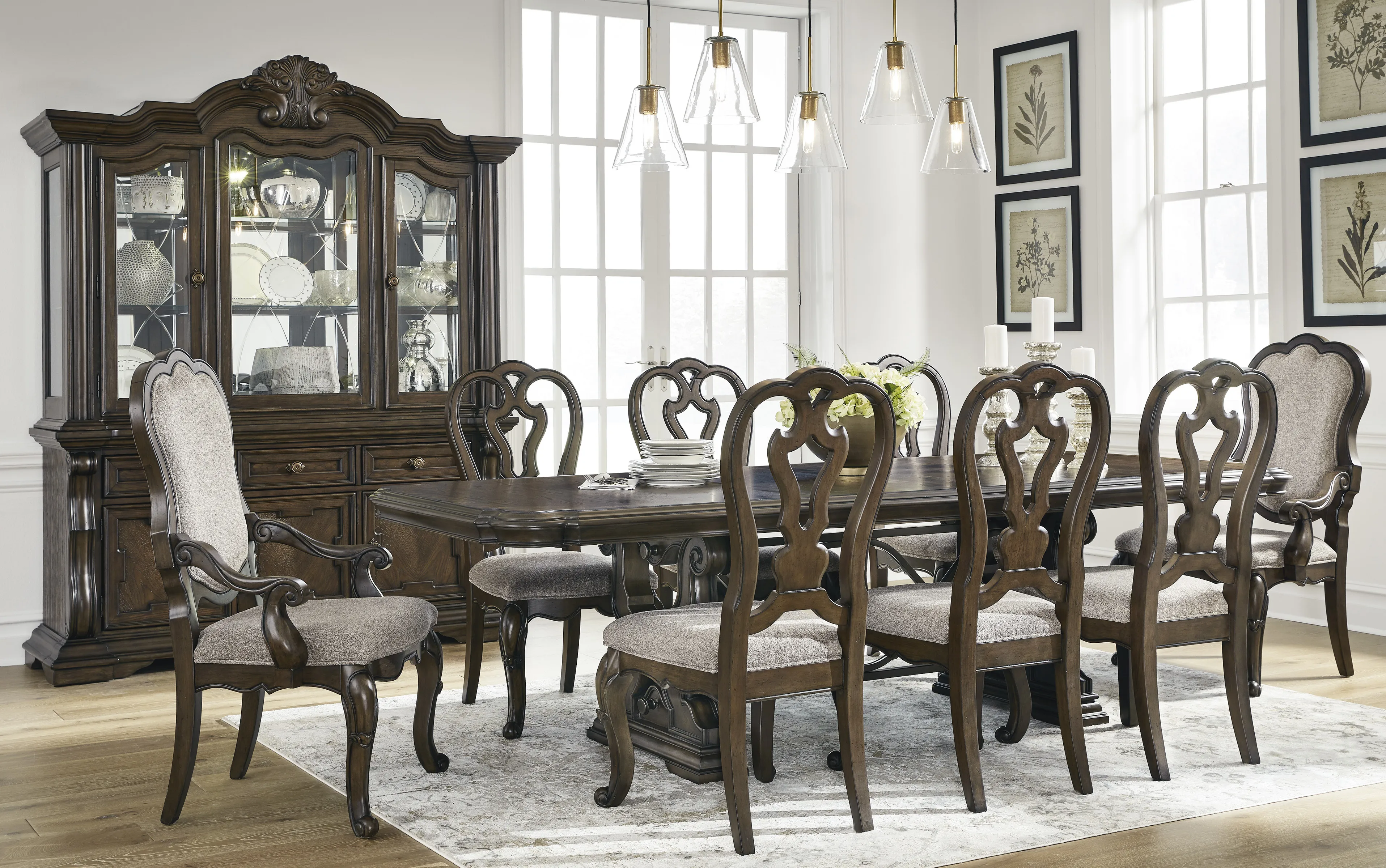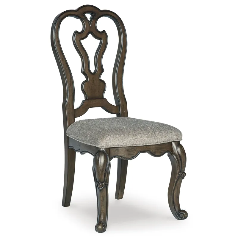 Maylee Dining UPH Side Chair x6 (D947-01): 21.5" W x 26" D x 44" H - From its ornamental appliques to its large scale, this dining chair makes a bold statement. With shapely legs and a plush cushioned seat, the opulent piece wows with stunning style. The look is timeless. The feel? Right at home. Made with wood and cast resin, Dark brown finish, Foam cushioned seat with polyester upholstery, Ornate cabriole legs, Assembly required