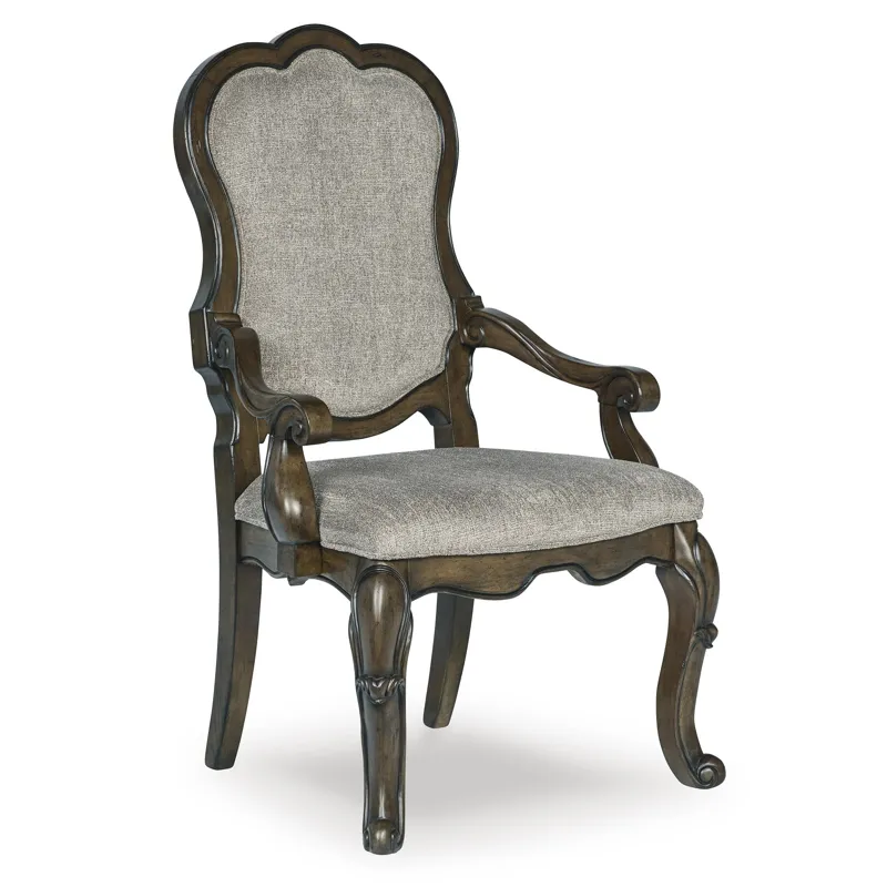 Maylee Dining UPH Arm Chair x2 (D947-01A): 30.75" W x 27.25" D x 45.75" H - From the ornamental appliques to the large scale, this dining armchair makes a bold statement. With shapely legs and a plush cushioned seat and back, the opulent piece wows with stunning style. The look is timeless. The feel? Right at home. Made with wood and cast resin, Dark brown finish, Foam cushioned seat and back with polyester upholstery, Ornate arms and cabriole legsÂ