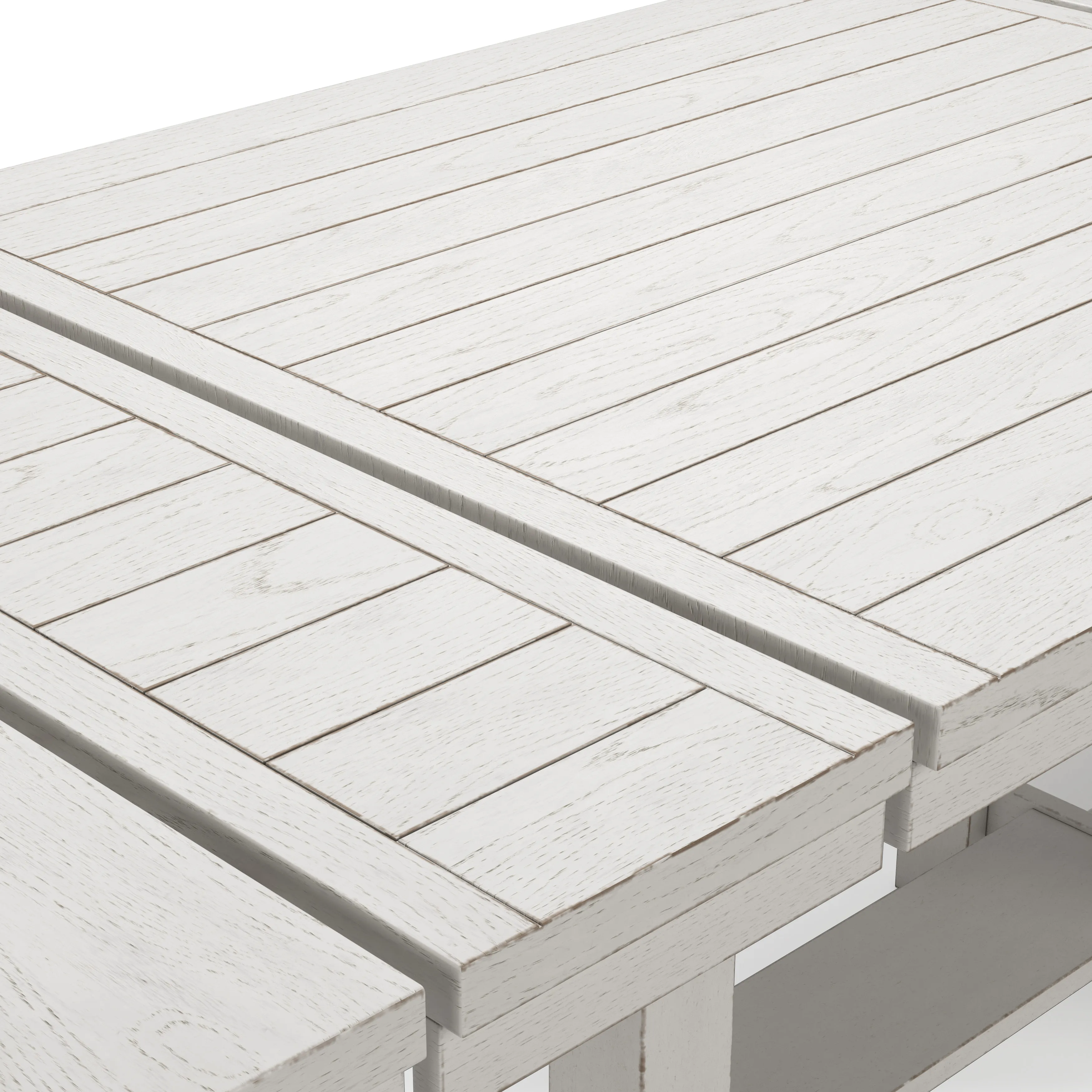 Robbinsdale Counter Height Dining Extension Table (D642-32): 86 x 42 x 36 - This counter height dining table is sure to impress come mealtime. With its antiqued white finish and a planked effect tabletop that extends for additional seating, farmhouse-style dining has never been so fashionable. All that’s missing is you and your family. Made with rubberwood solids, ash veneer and MDF substrates, Antiqued white finish with wood grain texture, Tabletop with planked effect, Two 12” extension leaves, Table extends by pulling both ends and dropping in leaf.