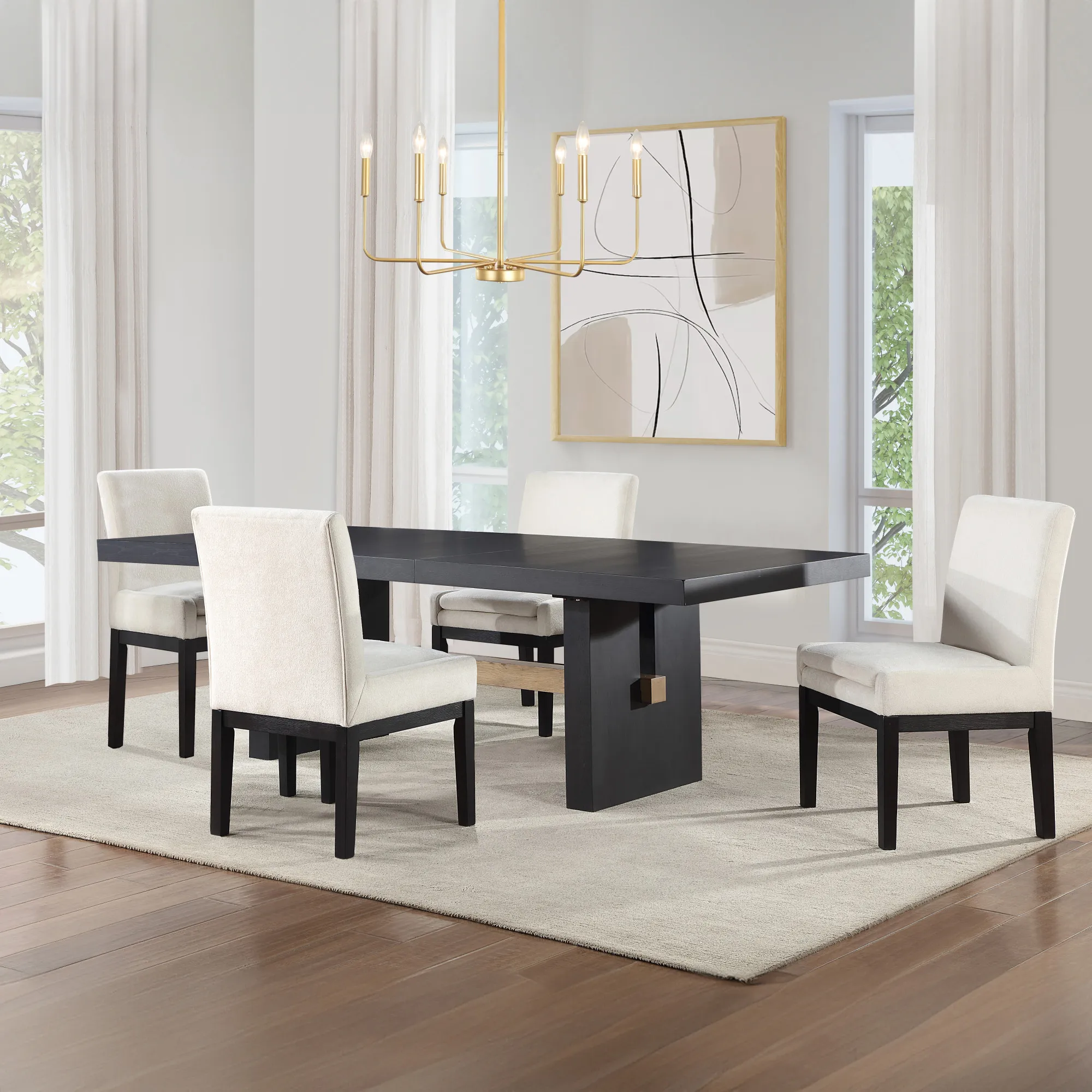 - Set includes the Aubrey 78-96-inch Black Dining Table with Driftwood Stretchers and 4 Aubrey Black Parsons Chairs. Each item also sold separately.