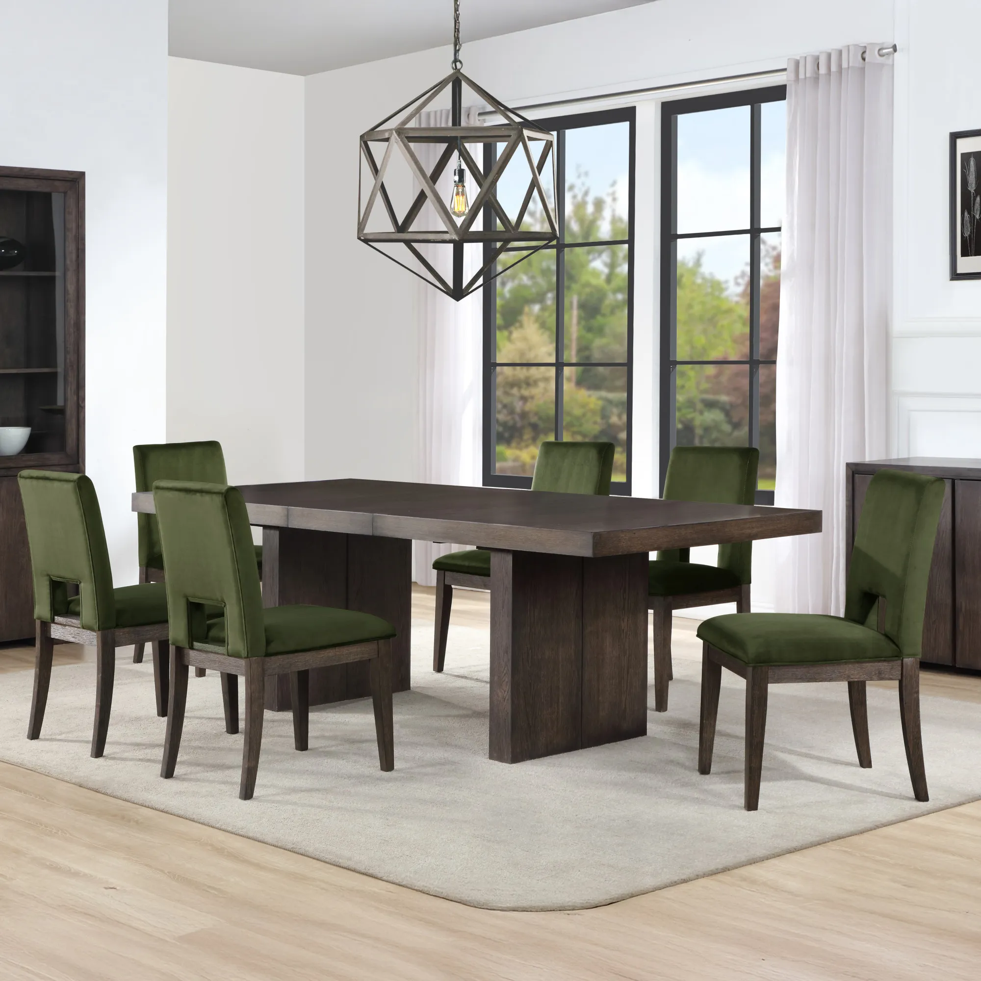 - 7 piece set includes the Evan 78-96 inch Dining Table with 18-inch leaf and 6 Evan Green Velvet Side Chairs. Each item also sold separately.