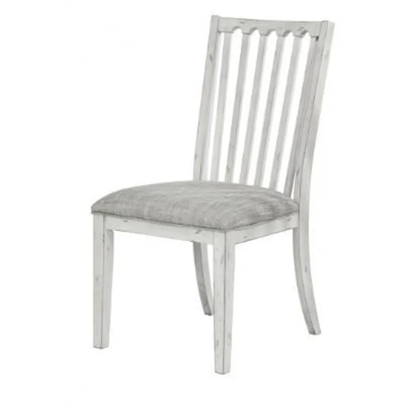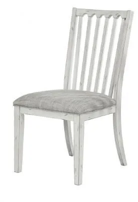 Highland Slat Back Side Chair x6 (DH4450S): Two-tone vintage style in Brown oak veneer and Antique White solid hardwood. Seating for 8 at the 96 in pedestal table or cozy seating for 6 at the 66 in pedestal table. Cushioned chairs and solid wood bench seating. Solid hardwood and engineered wood' Light brown upholstery, 20.5W x 23.5D x 39H, Seat width: 20.5", Seat depth: 17.25", Seat thickness: 3.25", Floor to seat: 19.75", Legs: 1.75"W x 1.75"D x 16.5"H, Backrest: 18.5"W x 1.75"D x 39"H