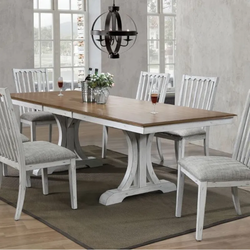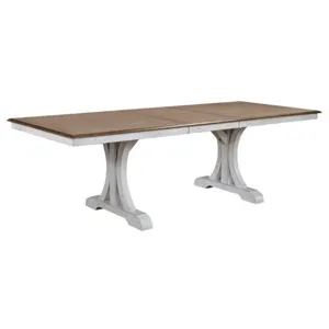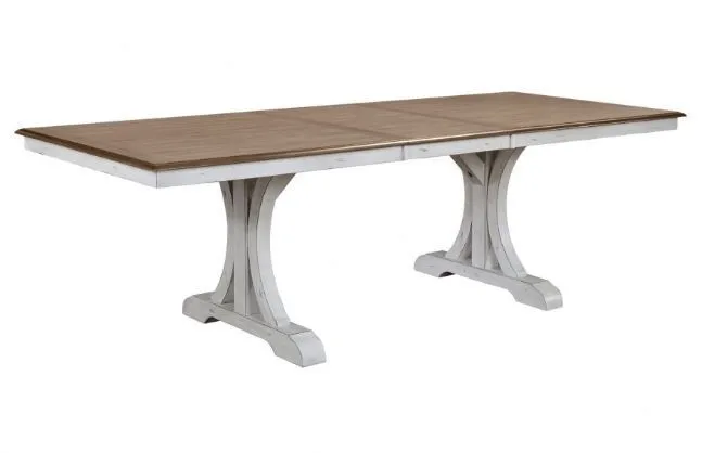 Highland 96" Pedestal Table w/ 20 in Leaf (DH44096N): Two-tone vintage style in Brown oak veneer and Antique White solid hardwood. Seating for 8 at the 96 in pedestal table or cozy seating for 6 at the 66 in pedestal table. Cushioned chairs and solid wood bench seating. Oak veneer, engineered wood, and solid hardwood, 40W x 76/96D x 30H, 20" lift off leaf expands table from 76" to 96", Table top thickness: 0.75", Apron: 2.25", Floor to apron: 27", 2 Pedestals: 31.5"W x 3.75"D x 26"H, Distance between pedestals: 42"