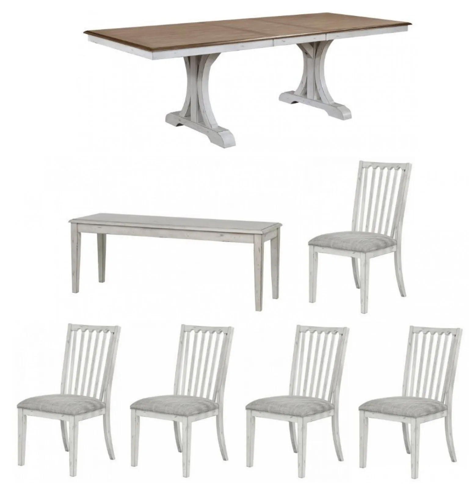 Highland Slat Back Side Chair x5 (DH4450S): Two-tone vintage style in Brown oak veneer and Antique White solid hardwood. Seating for 8 at the 96 in pedestal table or cozy seating for 6 at the 66 in pedestal table. Cushioned chairs and solid wood bench seating. Solid hardwood and engineered wood' Light brown upholstery, 20.5W x 23.5D x 39H, Seat width: 20.5", Seat depth: 17.25", Seat thickness: 3.25", Floor to seat: 19.75", Legs: 1.75"W x 1.75"D x 16.5"H, Backrest: 18.5"W x 1.75"D x 39"H